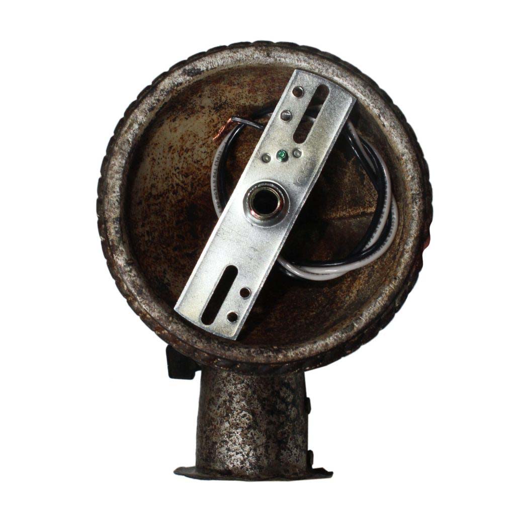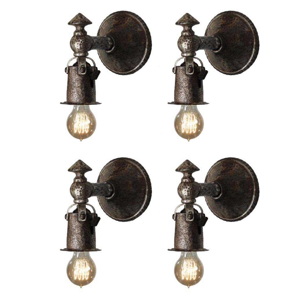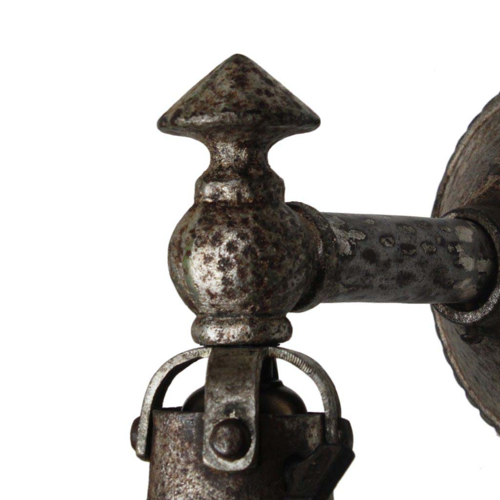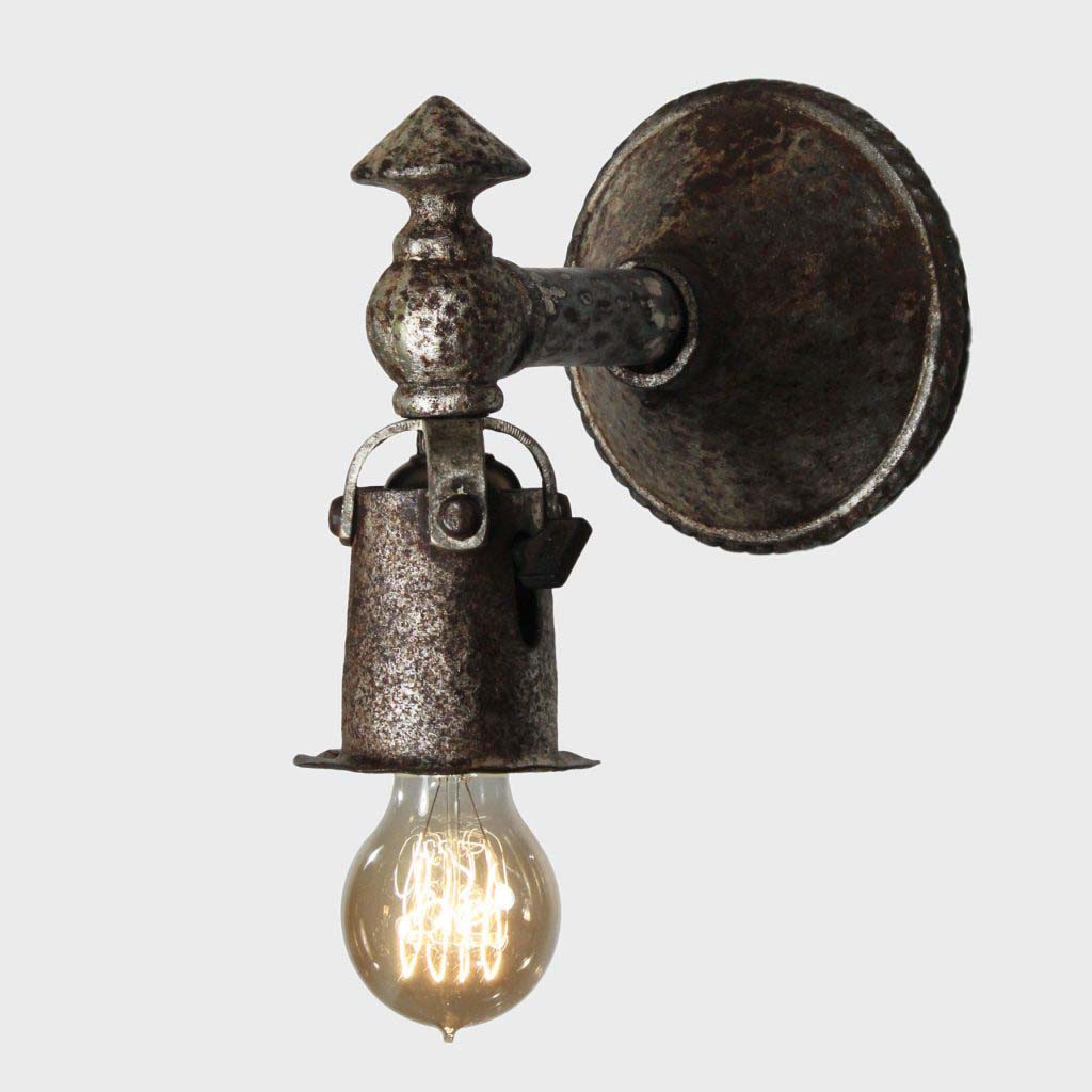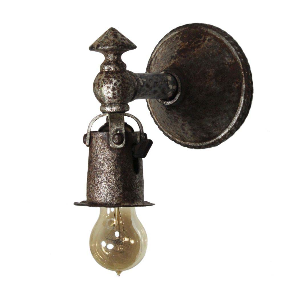 Handsome pairs of single-arm Tudor sconces in cast iron, salvaged out of a home in Franklin, TN and dating from the 1930s. Each sconce features a circular hammered backplate; a single arm extends from the middle of the backplate to support an understated bobeche and a spike finial. They would be perfect for Tudor, Spanish Revival, French Country or Old World spaces. These wall lamps are in excellent condition and have been professionally rewired; they come with all the necessary attachments for modern installation. Each sconce measures 7-1/4” tall, 5-1/8” wide, and project 8” from the wall. THE PRICE LISTED IS FOR EACH SCONCE PAIR.