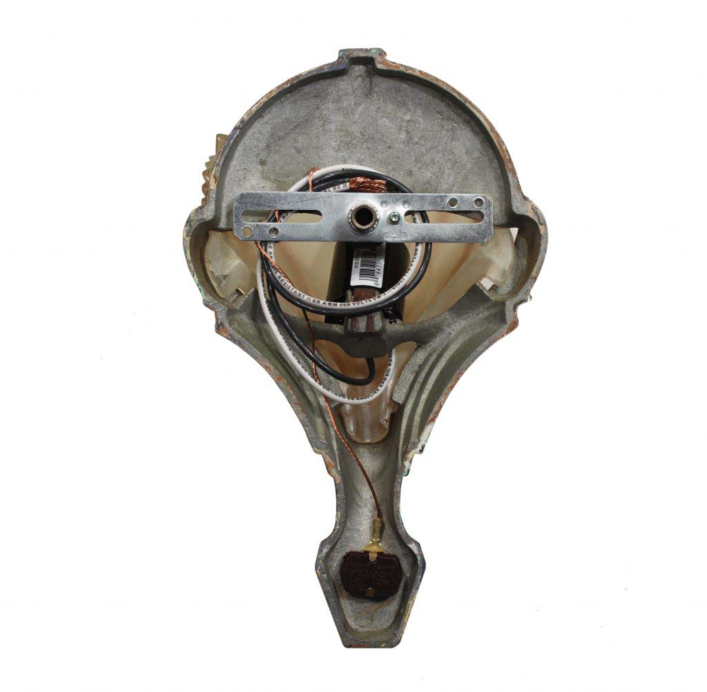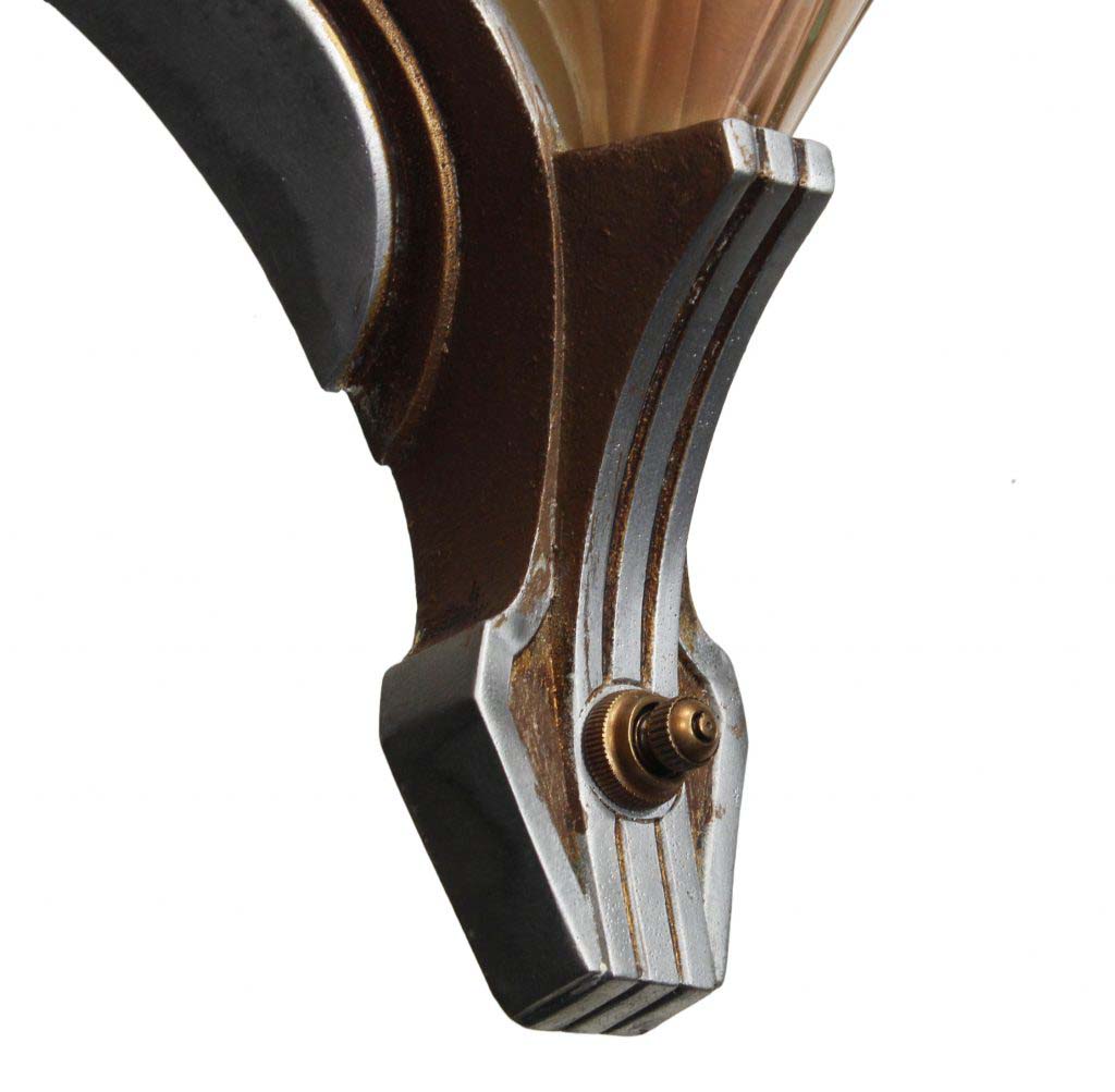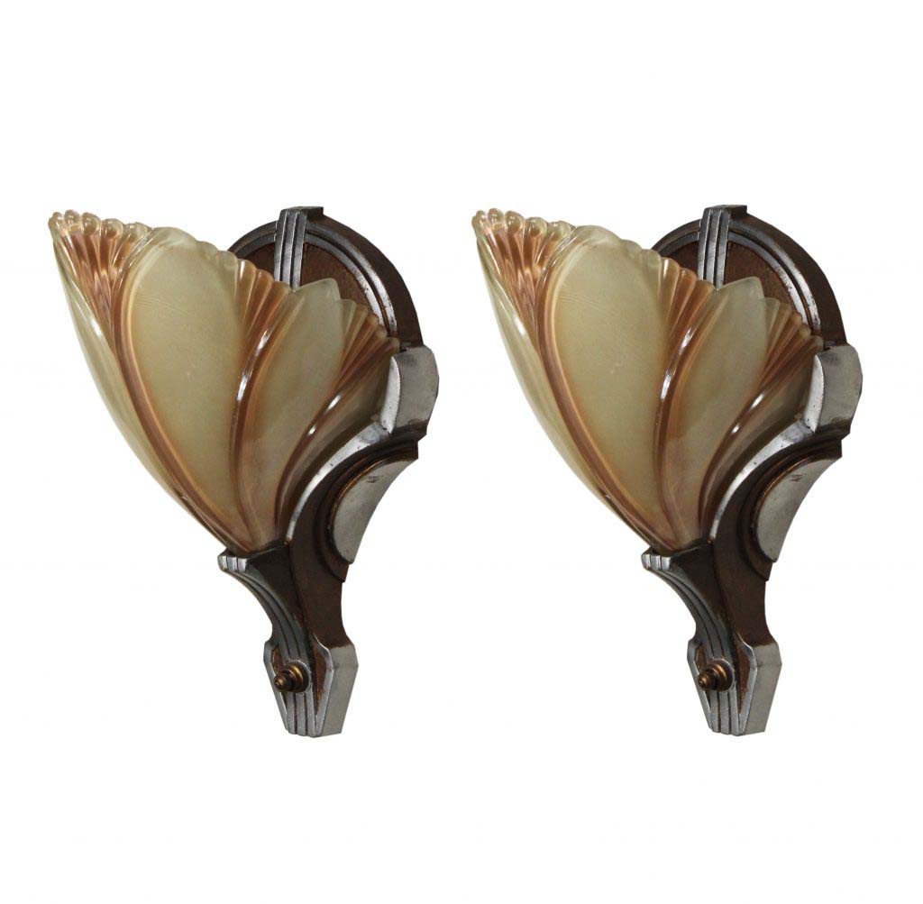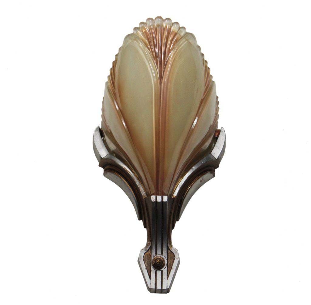 This handsome pair of antique Art Deco sconces from the 1930’s, features original batwing slip shades and original two-tone finish. The backplate of each of the sconces complements the shade with streamlined details and tapers to the base of the fixture. The sconces are in excellent conditions, and the slipper shades are also in excellent condition with no cracks or breaks, just the expected flea bites around the edge. These fixtures have been professionally rewired and come with all the necessary attachments for modern installation. They measure 5-1/2” wide, 9-1/2” tall, and protrude 6” from the wall. There are correlating light fixtures listed under NC3474-RW and NC3475-RW.