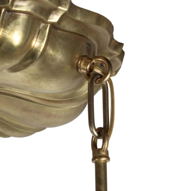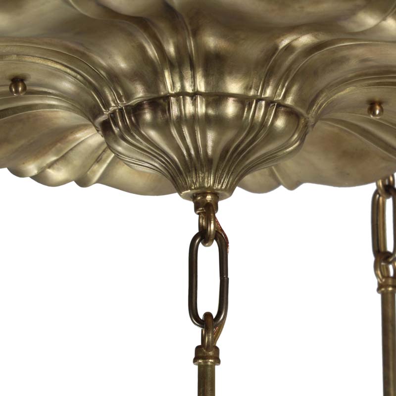 Antique five-light semi-flush chandelier, dating from the early 1900s, and found in a home in Richmond, VA. This unusual light begins with a square brass ceiling plate ornamented with the wide and narrow rib pattern of the Sheffield style. Five rods with coordinating fitters suspend from the fixture to support white glass globes below. This ceiling-mount light fixture is in excellent antique condition; It has been professionally rewired and comes with all the necessary attachments for modern installation. The light fixture measures approx. 19″ at the widest, 18” wide (ceiling plate), and 41” long. A coordinating light can be found under Product Code NC3889-RW. Due to the size of the fixture, it requires a custom shipping quote; please reach out with any questions.