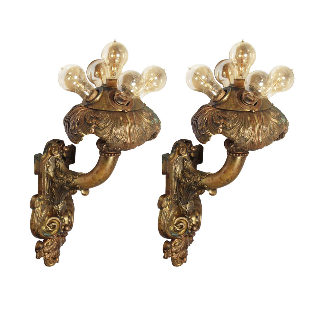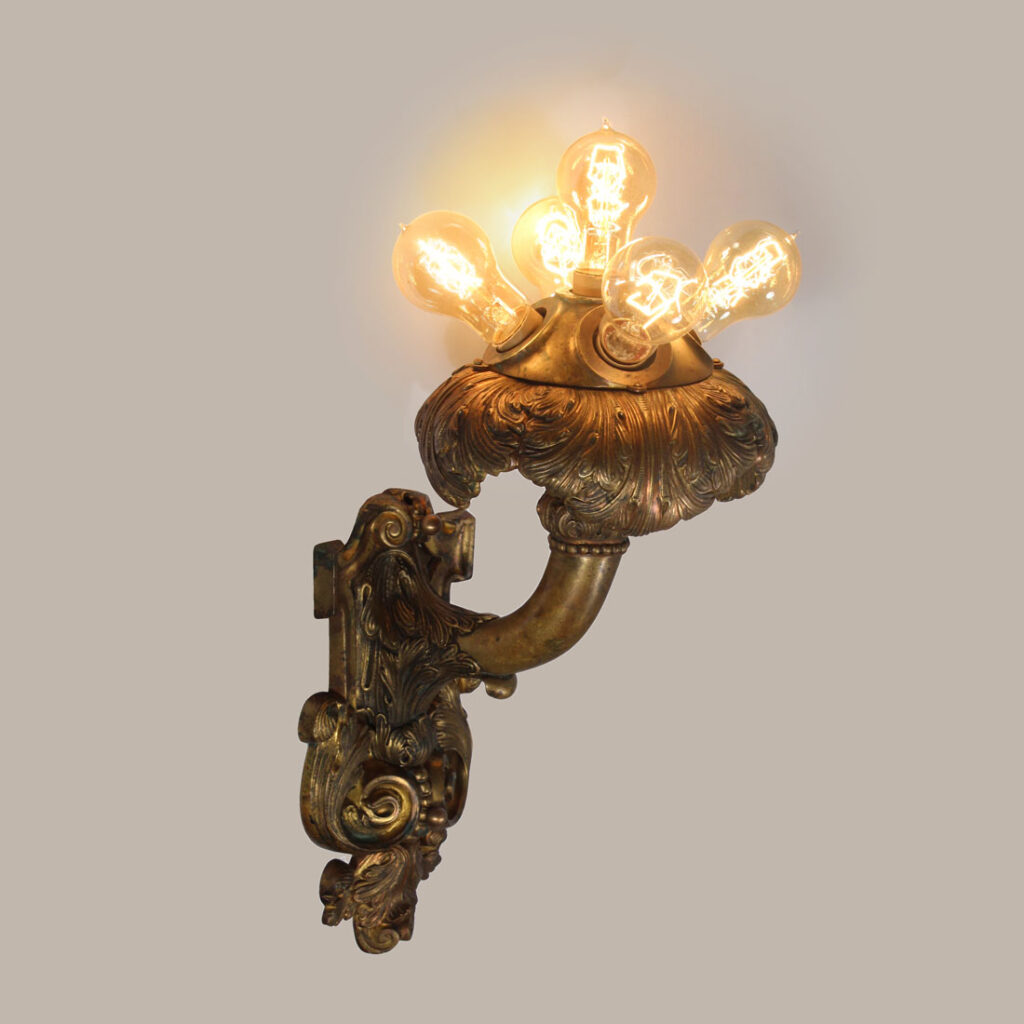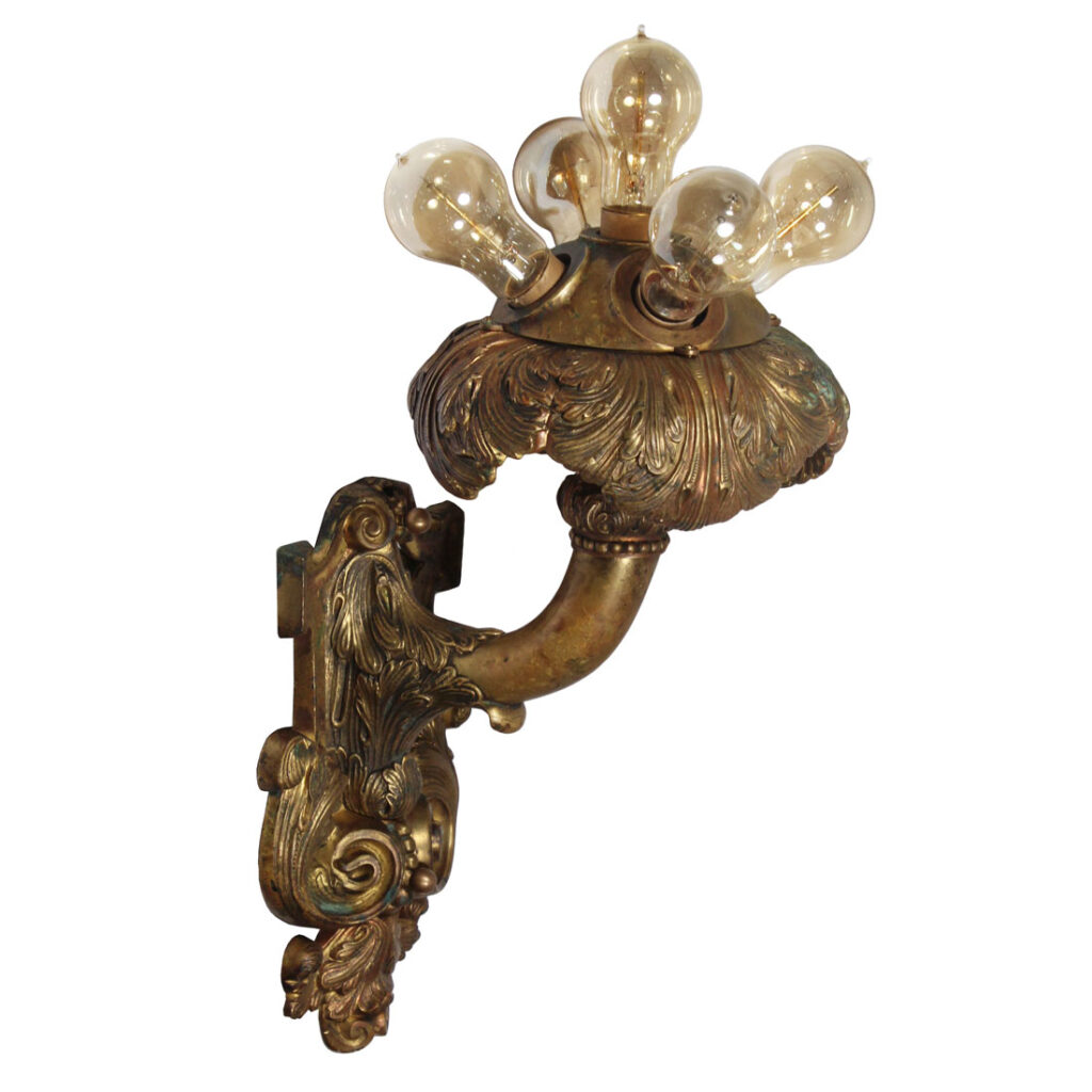 A stunning pair of antique cast bronze theater sconces, dating from the early 1900’s and attributed to renowned maker, E.F. Caldwell. Each sconce features an incredible stylized foliate back plate, from which a smooth arm curls out to support a large coordinating bobeche and five exposed bulbs. These wall lamps are in excellent antique condition; they have been professionally rewired and come with all the necessary attachments for modern installation. Each sconce is 17″ tall, 9″ wide, and projects 10″ from the wall. These sconces require a custom shipping quote; please contact us if you have any questions.