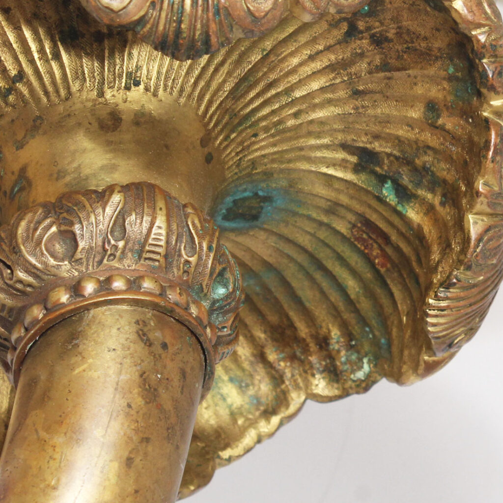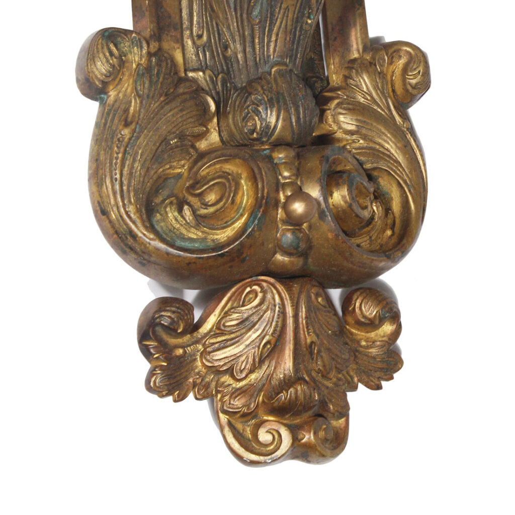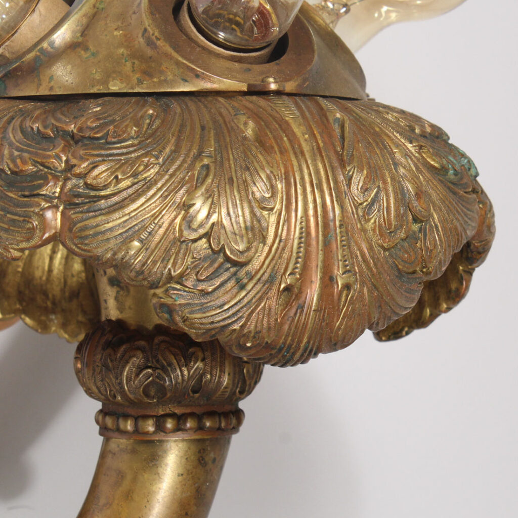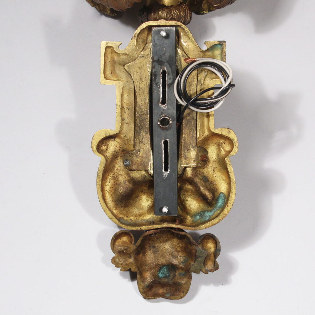 A stunning pair of antique cast bronze theater sconces, dating from the early 1900’s and attributed to renowned maker, E.F. Caldwell. Each sconce features an incredible stylized foliate back plate, from which a smooth arm curls out to support a large coordinating bobeche and five exposed bulbs. These wall lamps are in excellent antique condition; they have been professionally rewired and come with all the necessary attachments for modern installation. Each sconce is 17″ tall, 9″ wide, and projects 10″ from the wall. These sconces require a custom shipping quote; please contact us if you have any questions.