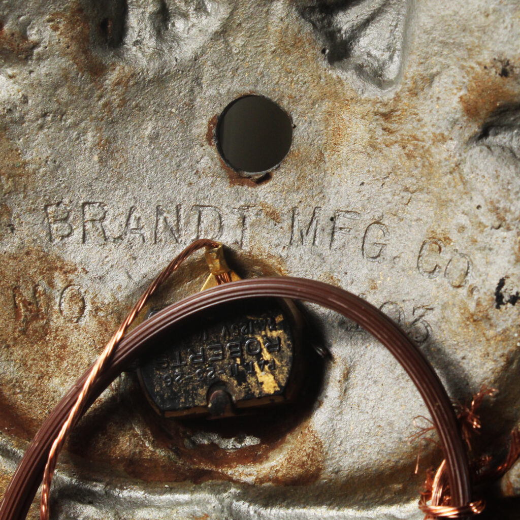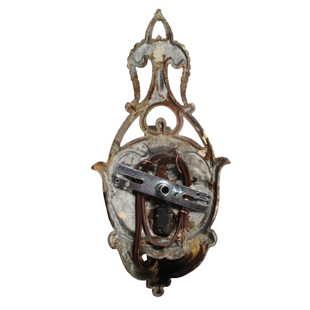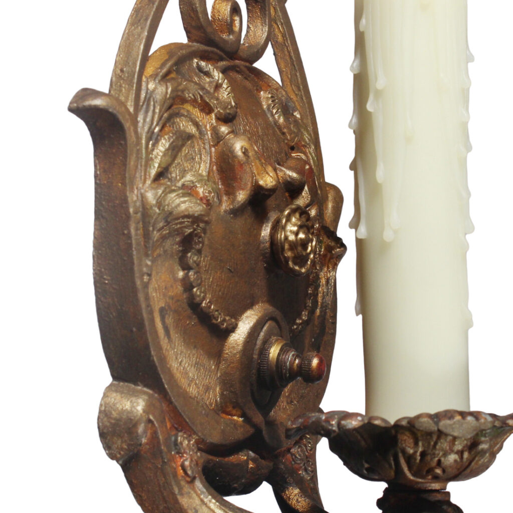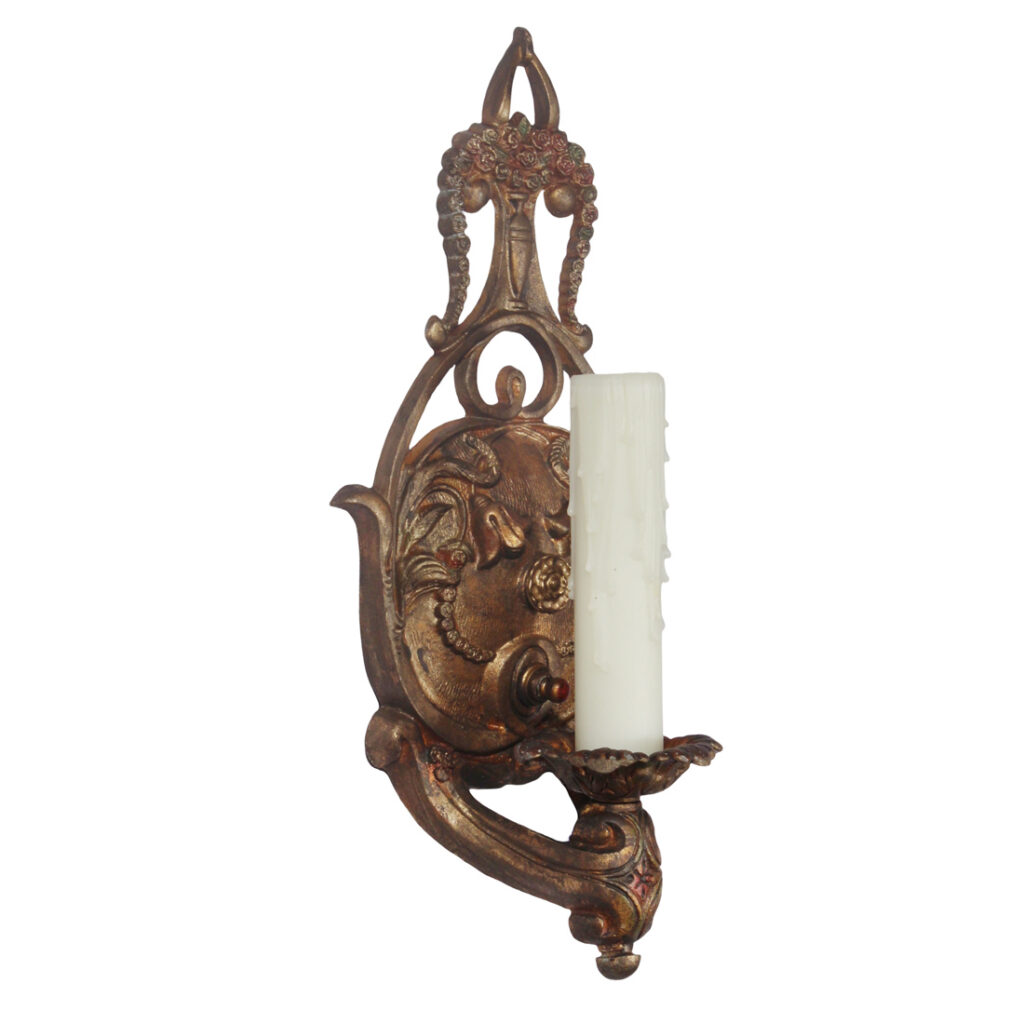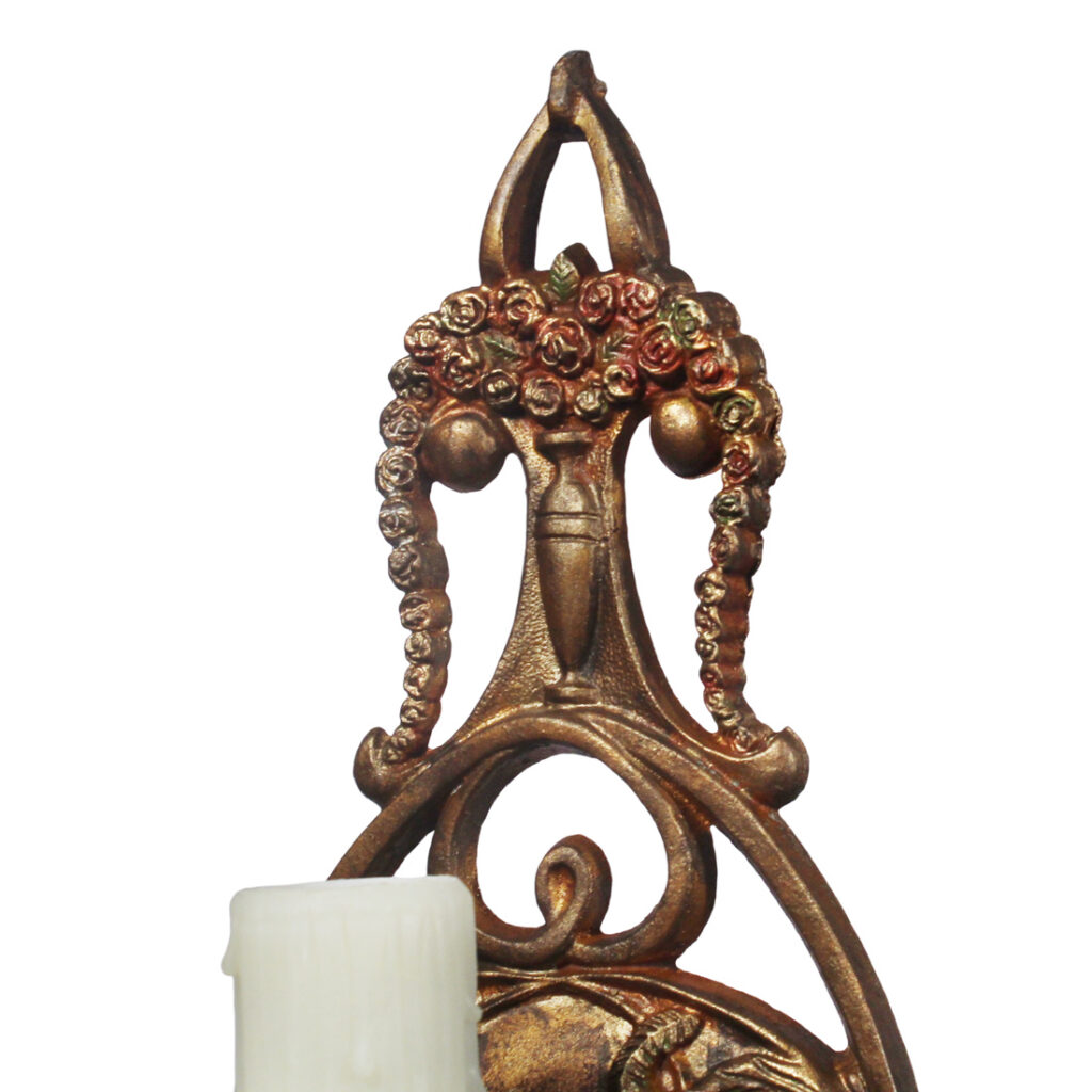 A fabulous pair of antique single-arm sconces, signed by Brandt MFG Co. and salvaged out of a home in Ohio. Each sconce features a lovely foliate design of swirling volutes and stylized flowers. These wall lamps are in excellent antique condition and retain some of their original polychrome finish; they have been professionally rewired and come with all the necessary attachments for modern installation. We kept the original non-functioning turn switches for nostalgia’s sake; however, we are happy to replace them with new ones if desired. The sconces are 5-1/2” wide, 12” tall, and project 4” from the wall.