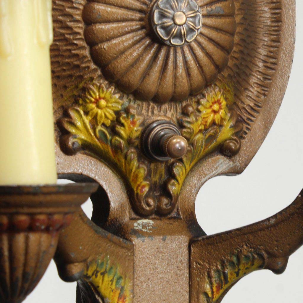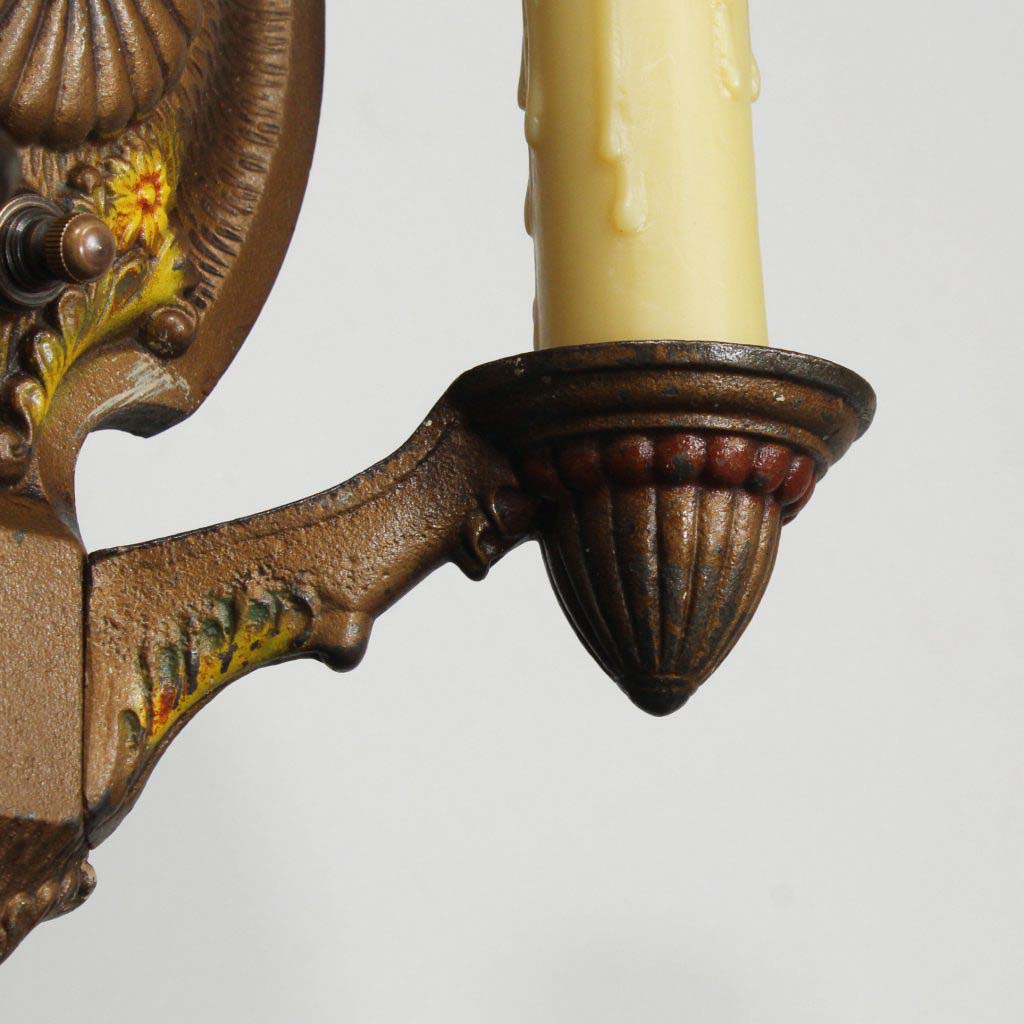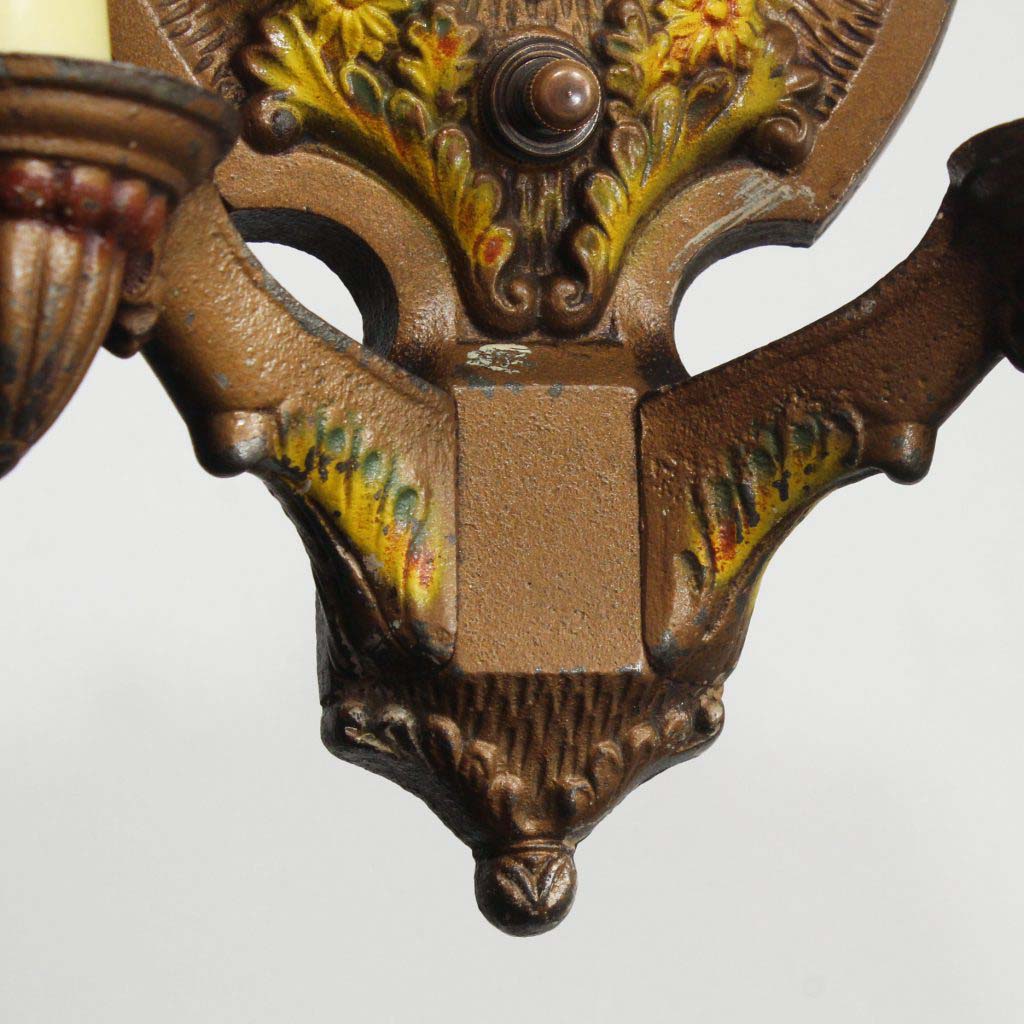 A fabulous pair of antique double-arm sconces in their original polychrome finish, patented in 1927 and made by Markel Lighting Products of Buffalo, NY. Each cast iron sconce is crowned by a volute and foliate top finial; below, the backplate has a seeded texture with florets, leaves, and a gadrooned central rosette. Two arms extend from the bottom of the back plate to support beaded and gadrooned bobeches. These wall lamps are in excellent condition; they have been professionally rewired and come with all necessary attachments for modern installation. We kept the original nonfunctioning turn switches for nostalgia’s sake; however, we will gladly replace them with new ones if desired. The sconces are 7-1/4″ wide, 9-1/2″ tall, and project 3-1/2” from the wall.