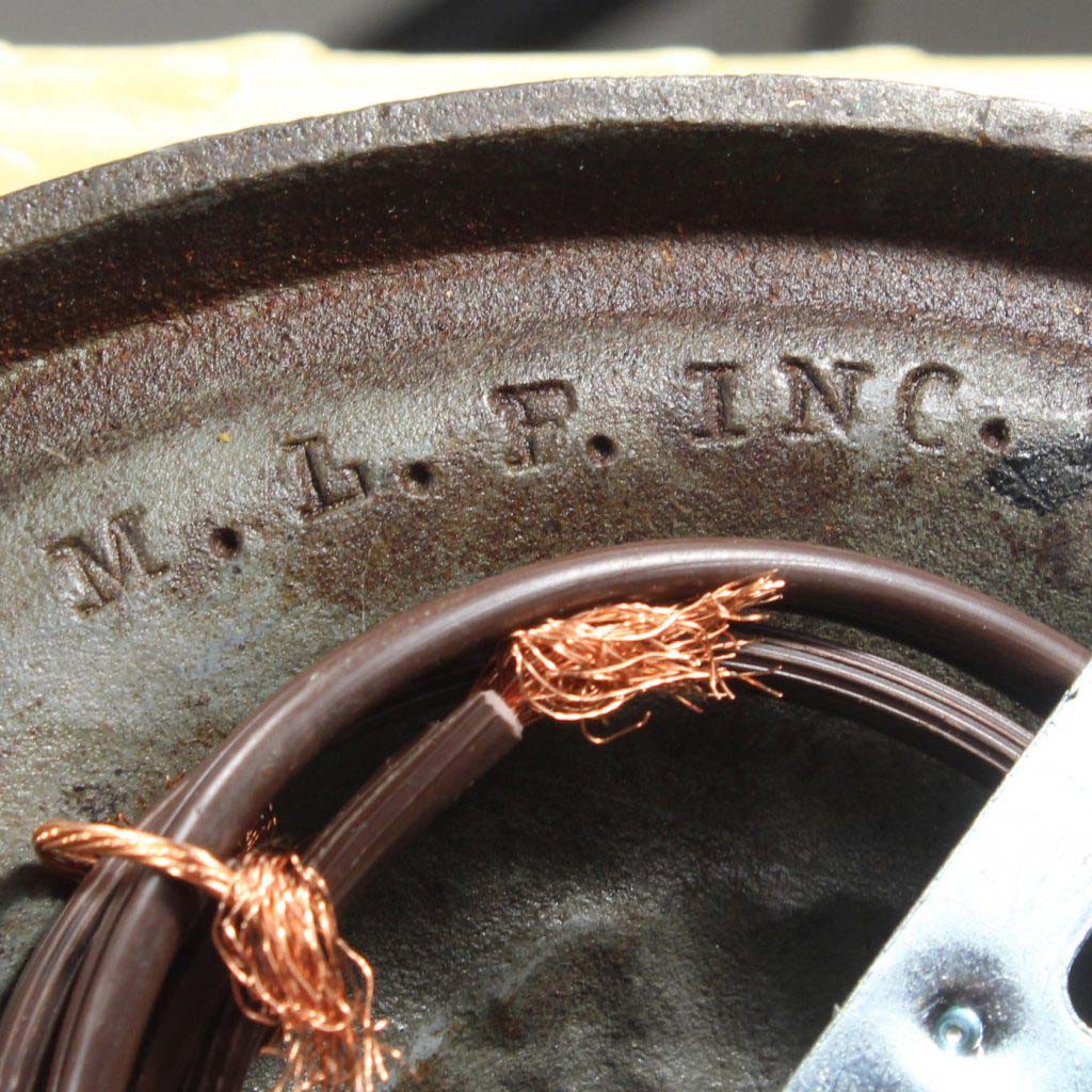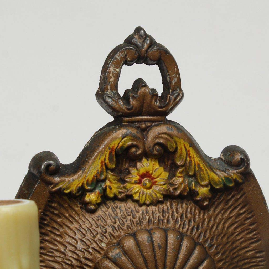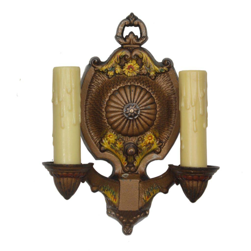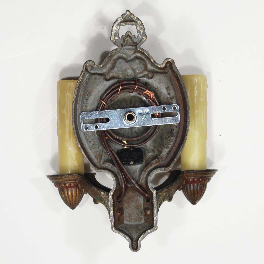A fabulous pair of antique double-arm sconces in their original polychrome finish, patented in 1927 and made by Markel Lighting Products of Buffalo, NY. Each cast iron sconce is crowned by a volute and foliate top finial; below, the backplate has a seeded texture with florets, leaves, and a gadrooned central rosette. Two arms extend from the bottom of the back plate to support beaded and gadrooned bobeches. These wall lamps are in excellent condition; they have been professionally rewired and come with all necessary attachments for modern installation. We kept the original nonfunctioning turn switches for nostalgia’s sake; however, we will gladly replace them with new ones if desired. The sconces are 7-1/4″ wide, 9-1/2″ tall, and project 3-1/2” from the wall.