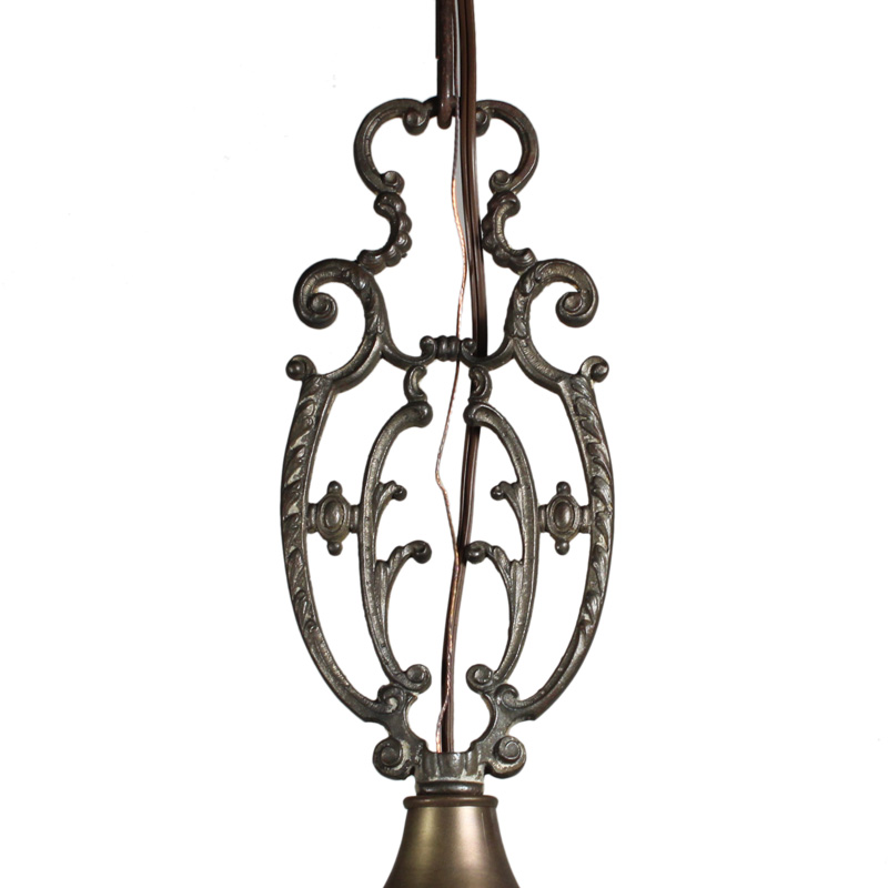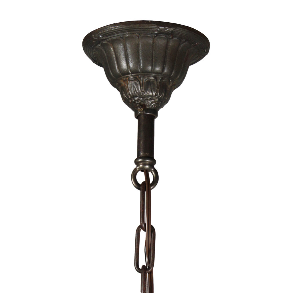 A charming antique cast iron chandelier signed by Markel Electric, dating from the 1930’s and found in a home in Asheville, NC. The chandelier begins with a decorative canopy, coming down in chain to an elongated decorative loop finial below. The finial perches above the petite chandelier body that supports two downward-facing bobeches each holding an exposed bulb. This light fixture is in excellent condition. It has been professionally rewired and comes with all the necessary attachments for modern installation. The chandelier body measures 8” wide by 13-3/4″ long, 18-3/4” tall (body), and 29″ tall overall (does not include bulbs).