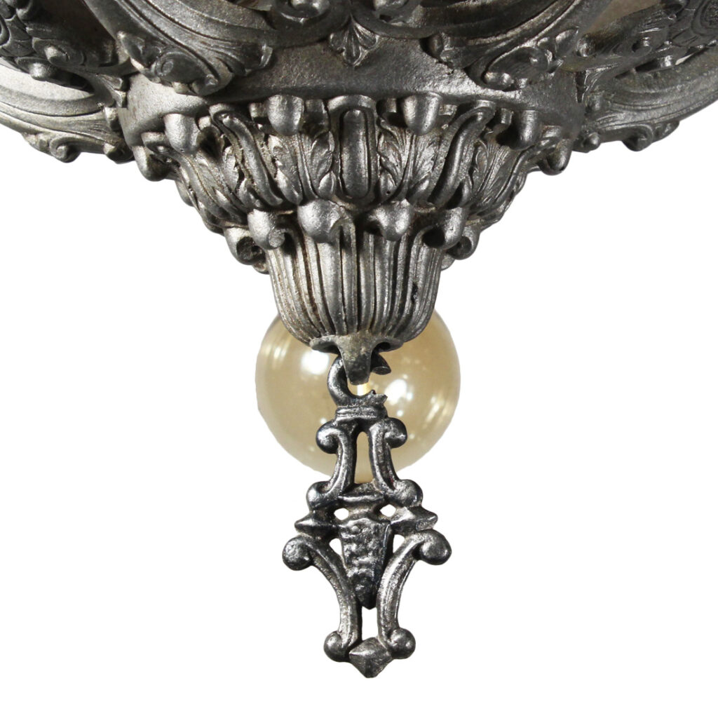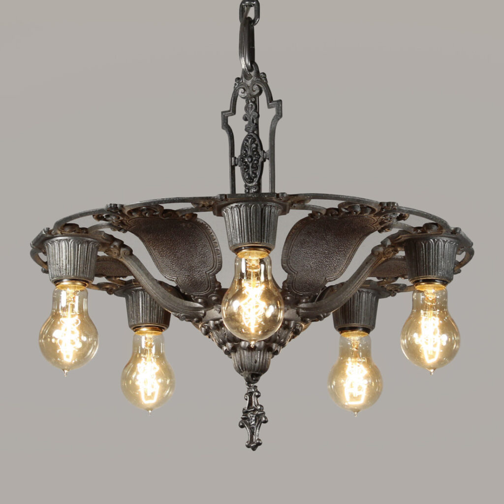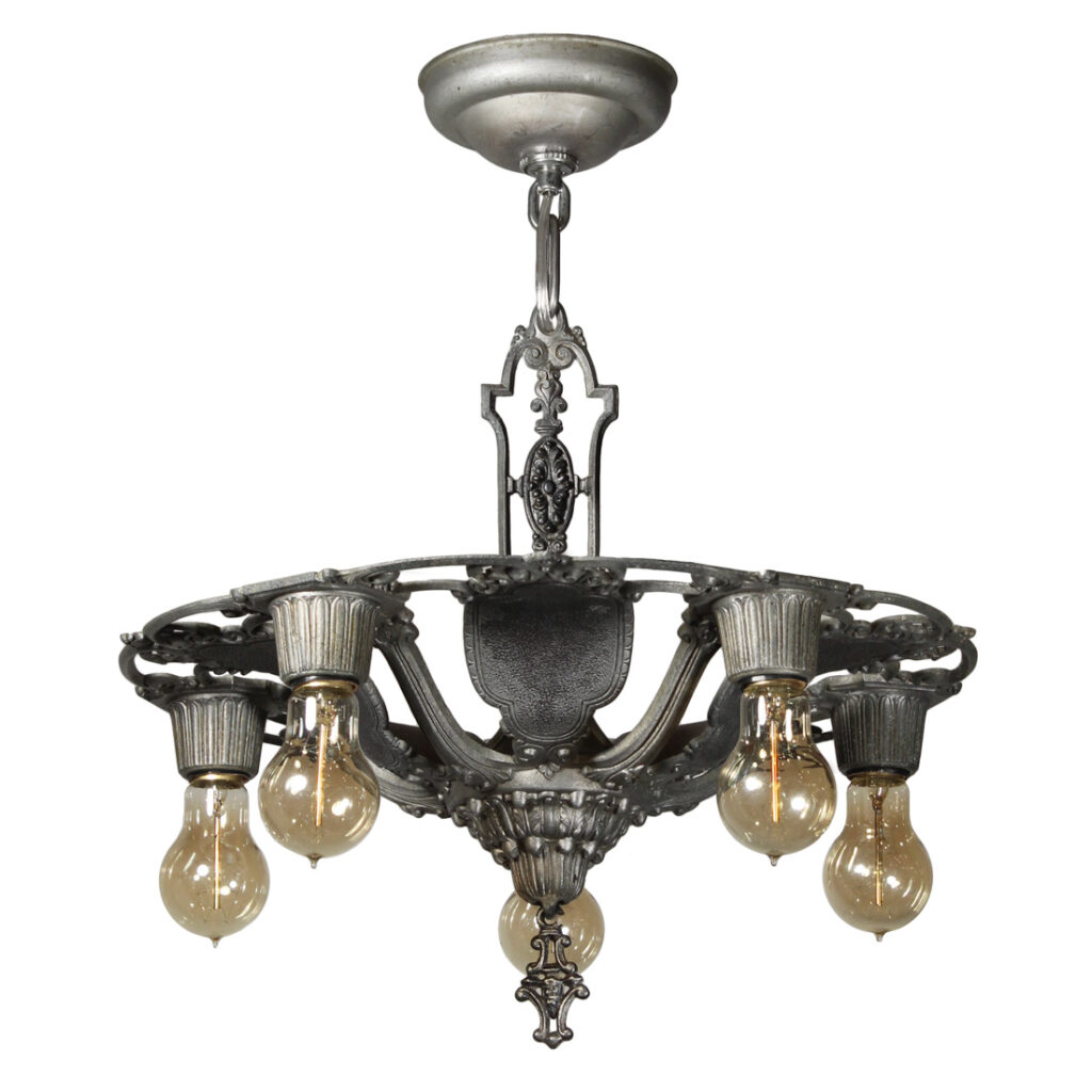 A lovely antique semi-flush five-light fixture by Riddle, dating from the 1930s and salvaged out of a home in Indianapolis, IN. This semi-flush mount light fixture features a beautiful foliate motif, and is in excellent antique condition (as pictured). It has been professionally rewired and comes with all necessary attachments for modern installation. It measures 16-3/4″ wide, and 19-1/2″ tall (does not include bulbs).