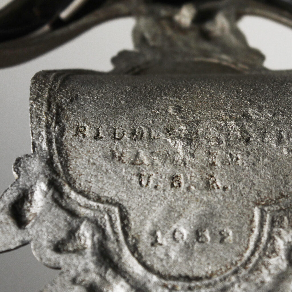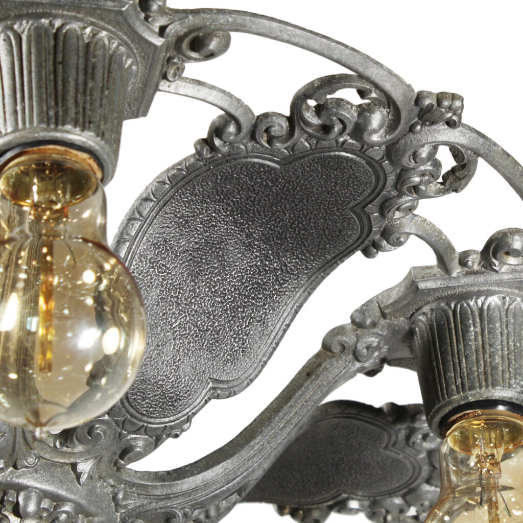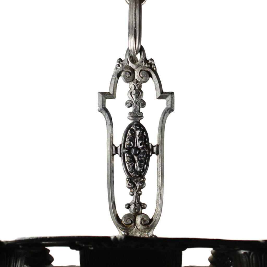 A lovely antique semi-flush five-light fixture by Riddle, dating from the 1930s and salvaged out of a home in Indianapolis, IN. This semi-flush mount light fixture features a beautiful foliate motif, and is in excellent antique condition (as pictured). It has been professionally rewired and comes with all necessary attachments for modern installation. It measures 16-3/4″ wide, and 19-1/2″ tall (does not include bulbs).