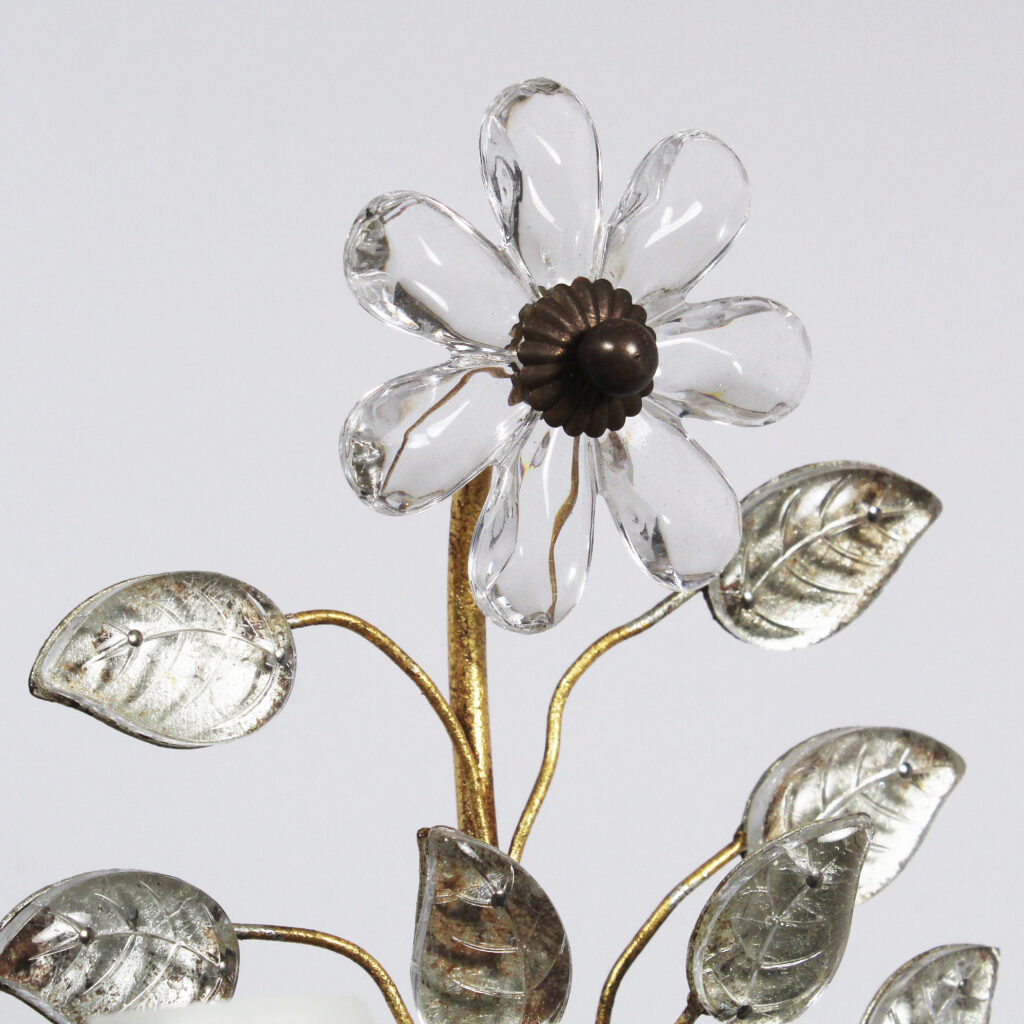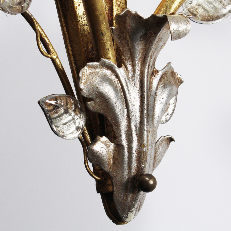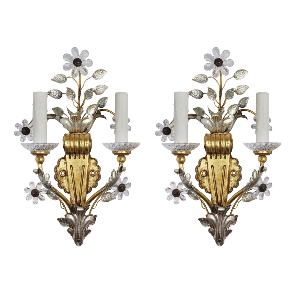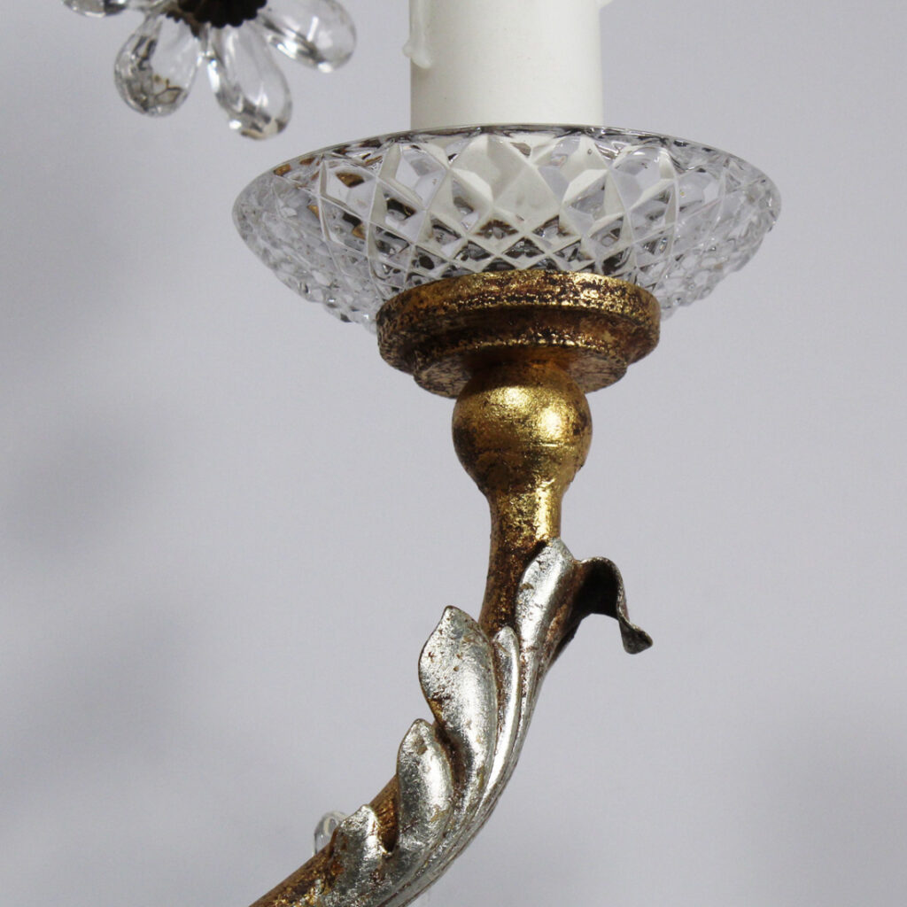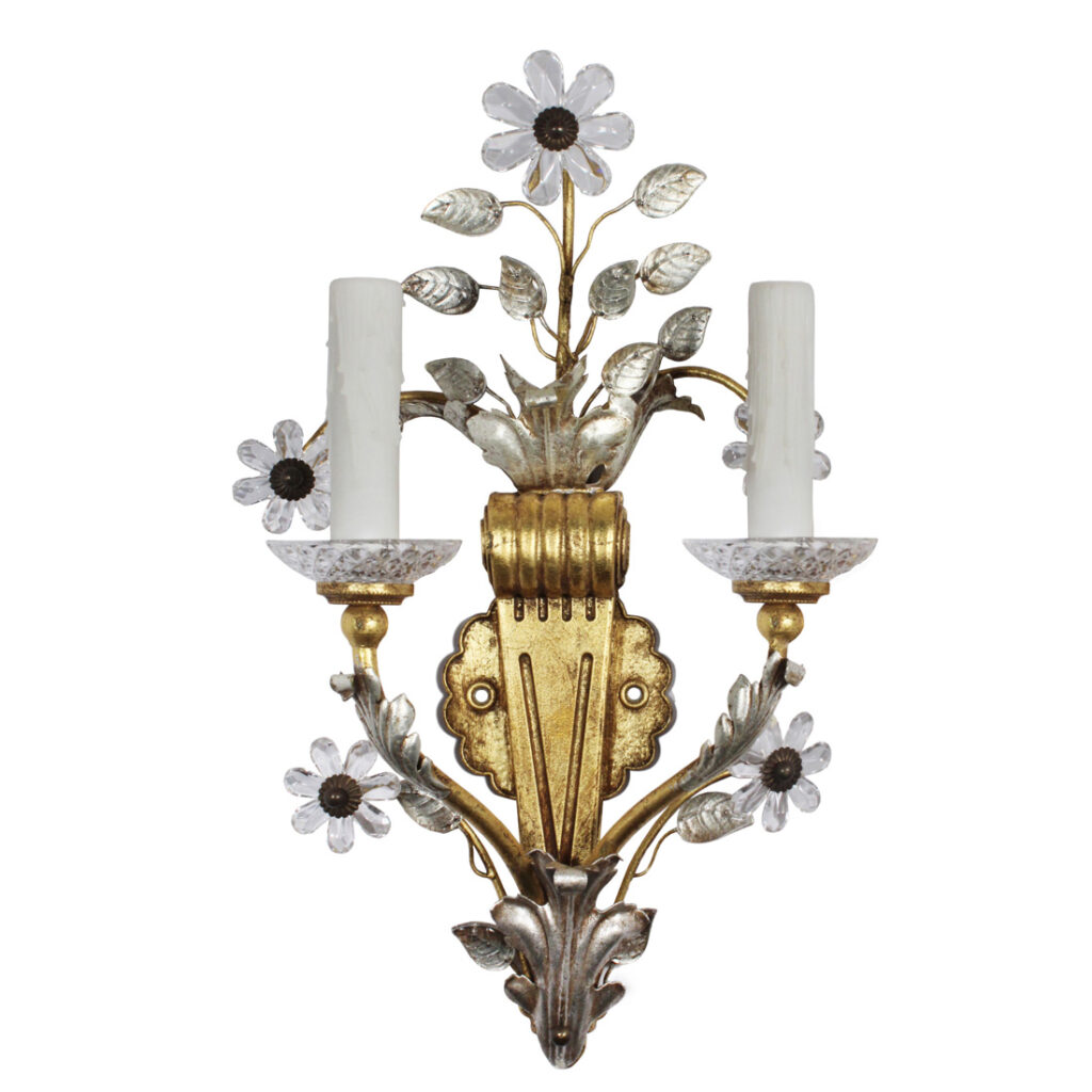 A breathtaking pair of vintage double-arm sconces by Banci, featuring Italian crystal and gold gilt details. The wall lamps are in excellent condition; they have been professionally rewired and come with all the necessary attachments for modern installation. The sconces are 9-7/8” wide, 18-3/8” tall, and project 5” from the wall.