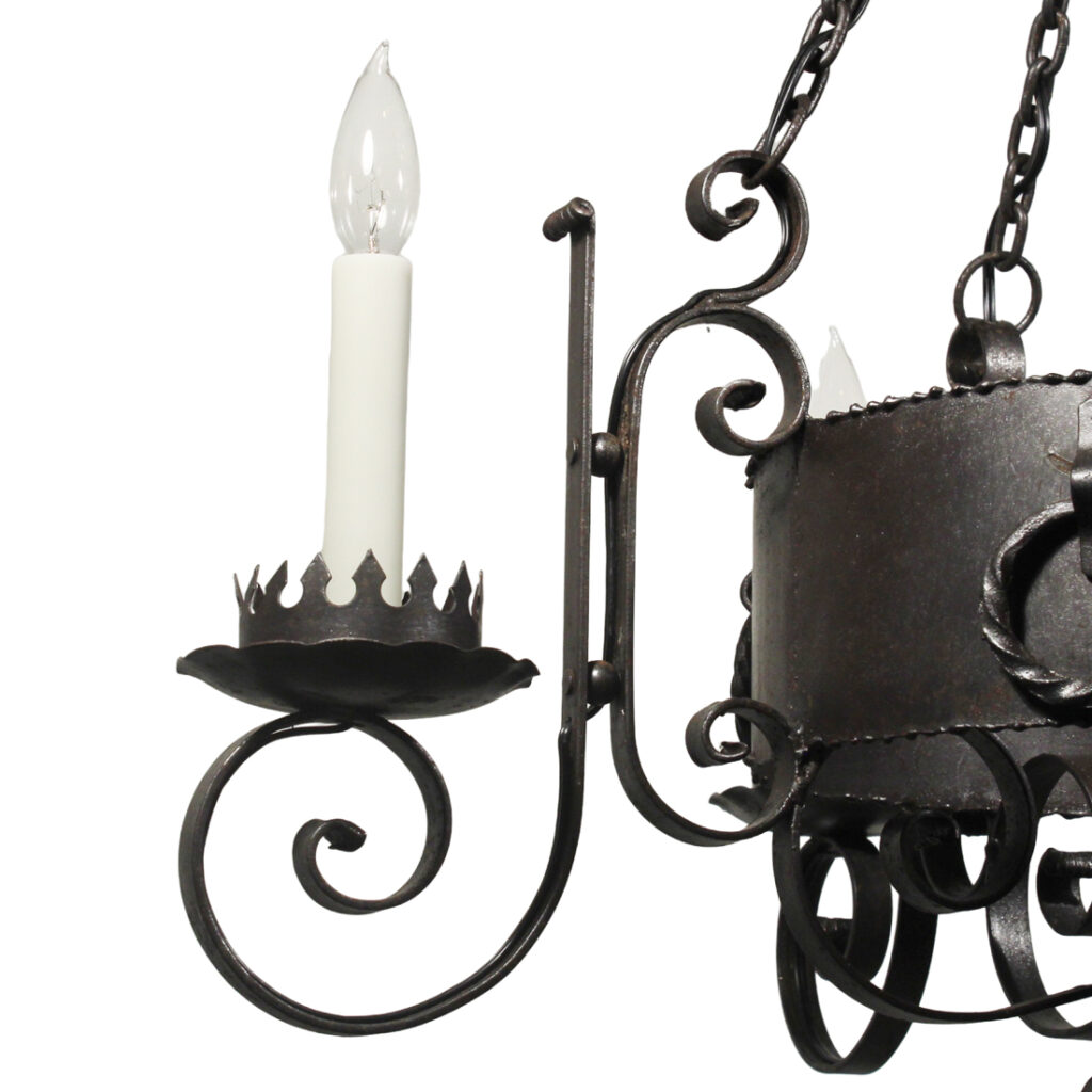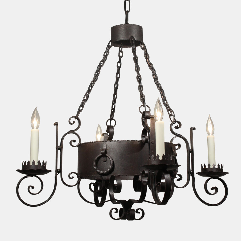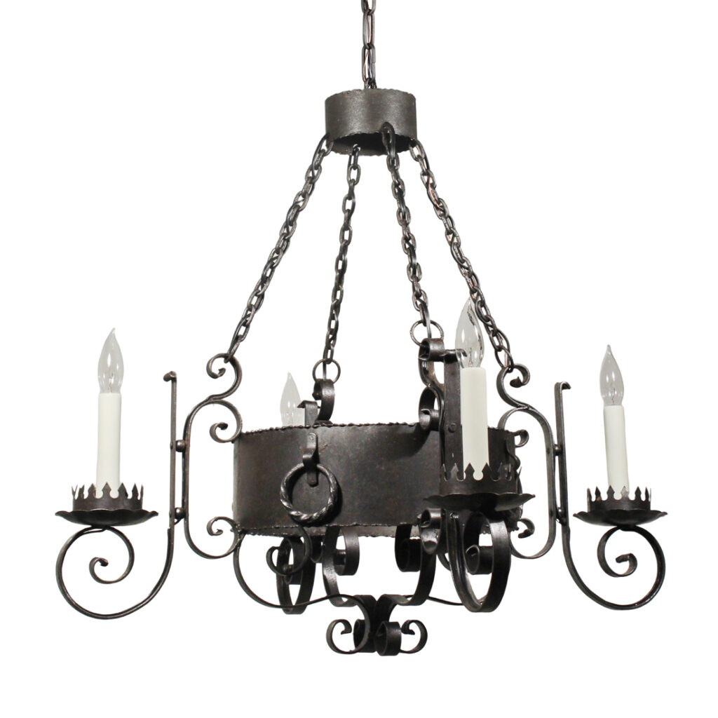 A handsome antique four-light cast iron chandelier, dating from the early 1900’s and salvaged out of a home in Nashville, TN. This fixture would look lovely in Tudor, Spanish Revival, or Gothic Revival homes. It is in excellent antique condition, and has been professionally rewired with all the necessary attachments for modern installation. The chandelier body measures 22-1/2″ wide (square), 32″ wide diagonally, 29-1/4″ tall, and is 45″ long overall. Due to the size of this fixture, it requires a custom shipping quote; please contact us if you have any questions.