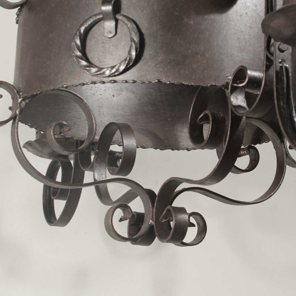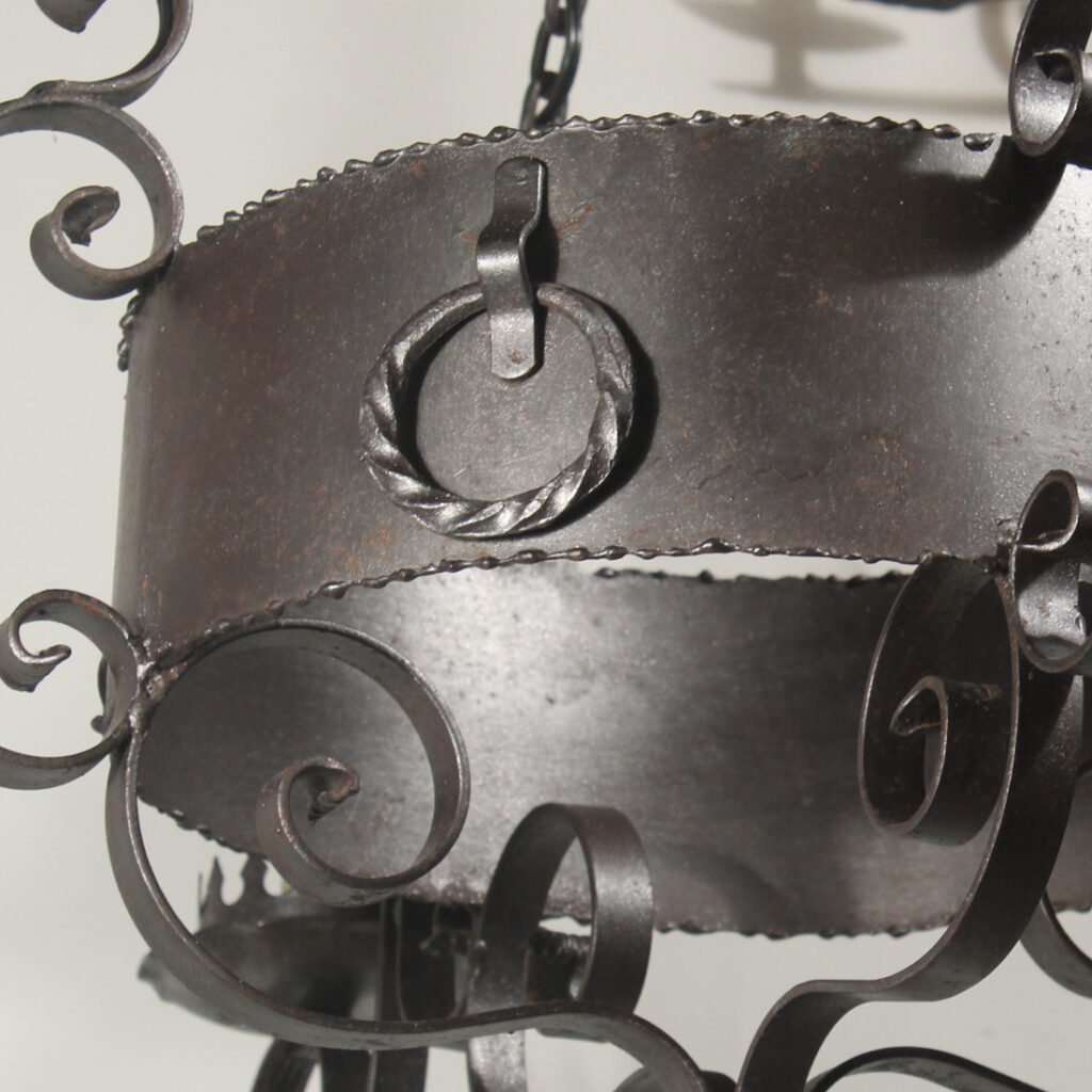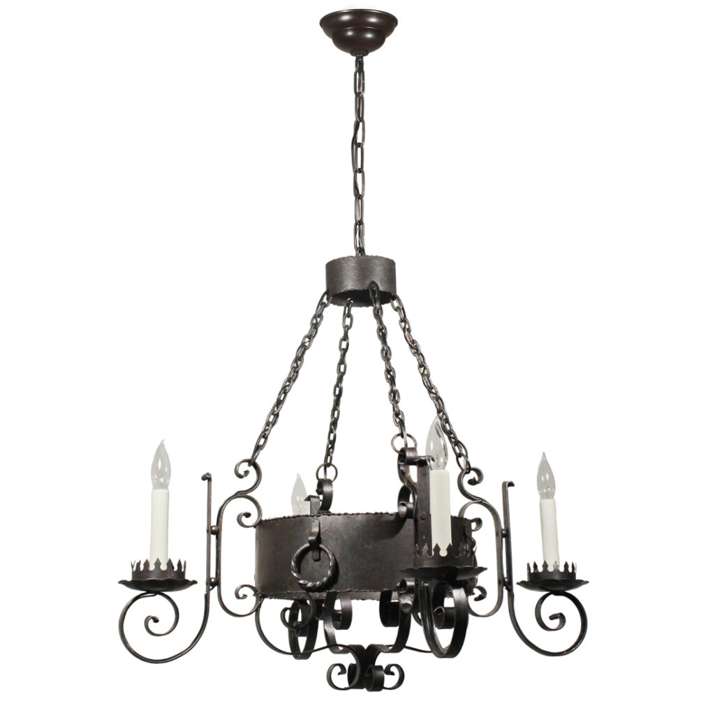 A handsome antique four-light cast iron chandelier, dating from the early 1900’s and salvaged out of a home in Nashville, TN. This fixture would look lovely in Tudor, Spanish Revival, or Gothic Revival homes. It is in excellent antique condition, and has been professionally rewired with all the necessary attachments for modern installation. The chandelier body measures 22-1/2″ wide (square), 32″ wide diagonally, 29-1/4″ tall, and is 45″ long overall. Due to the size of this fixture, it requires a custom shipping quote; please contact us if you have any questions.