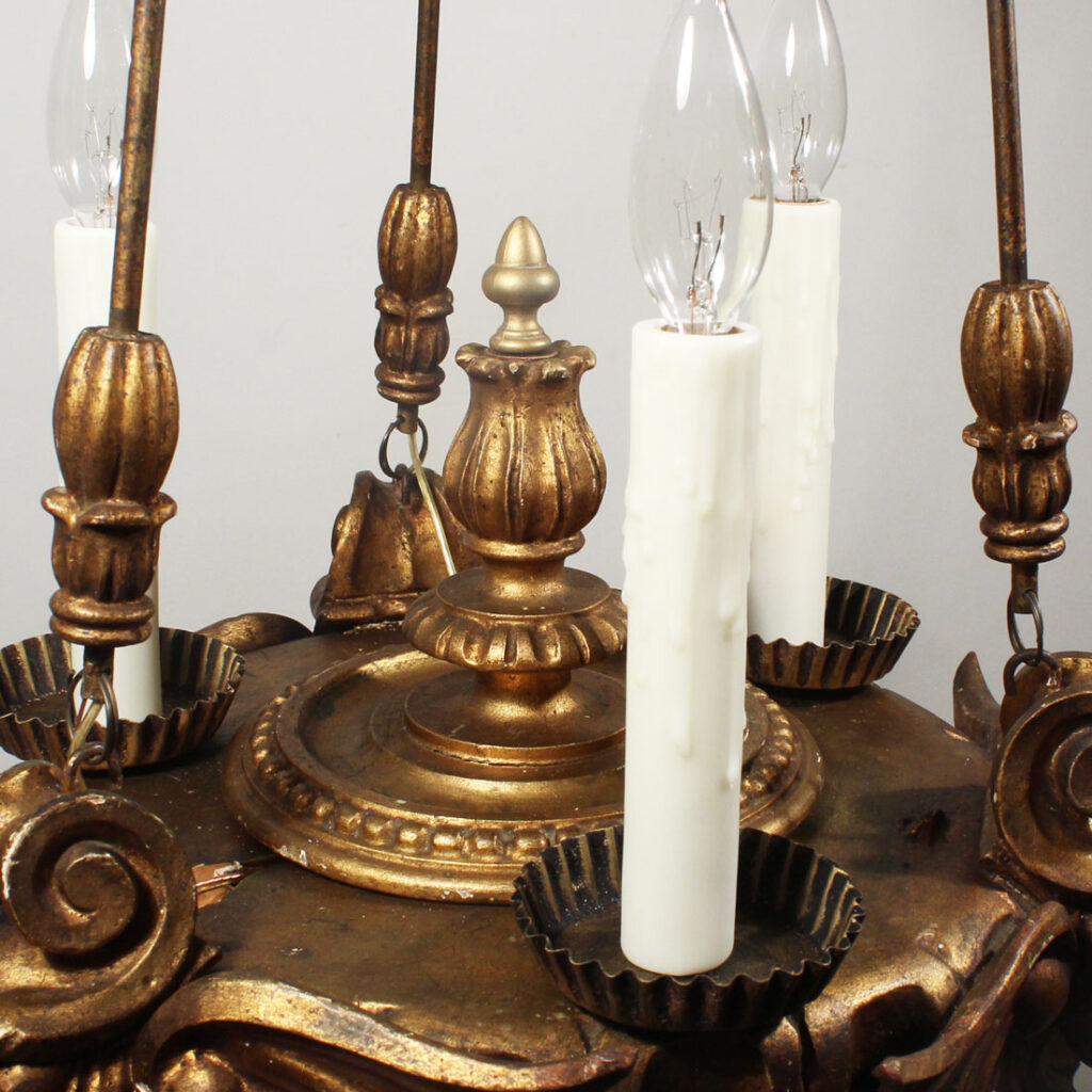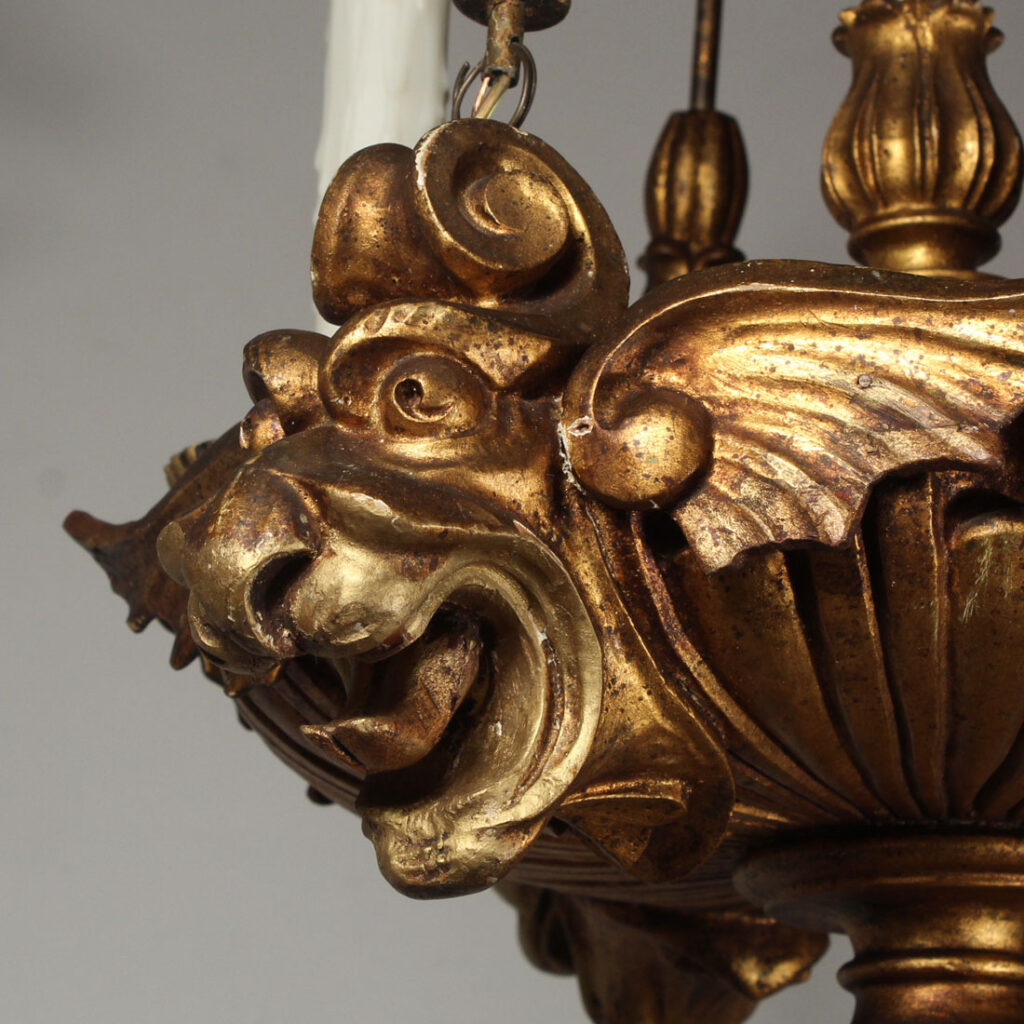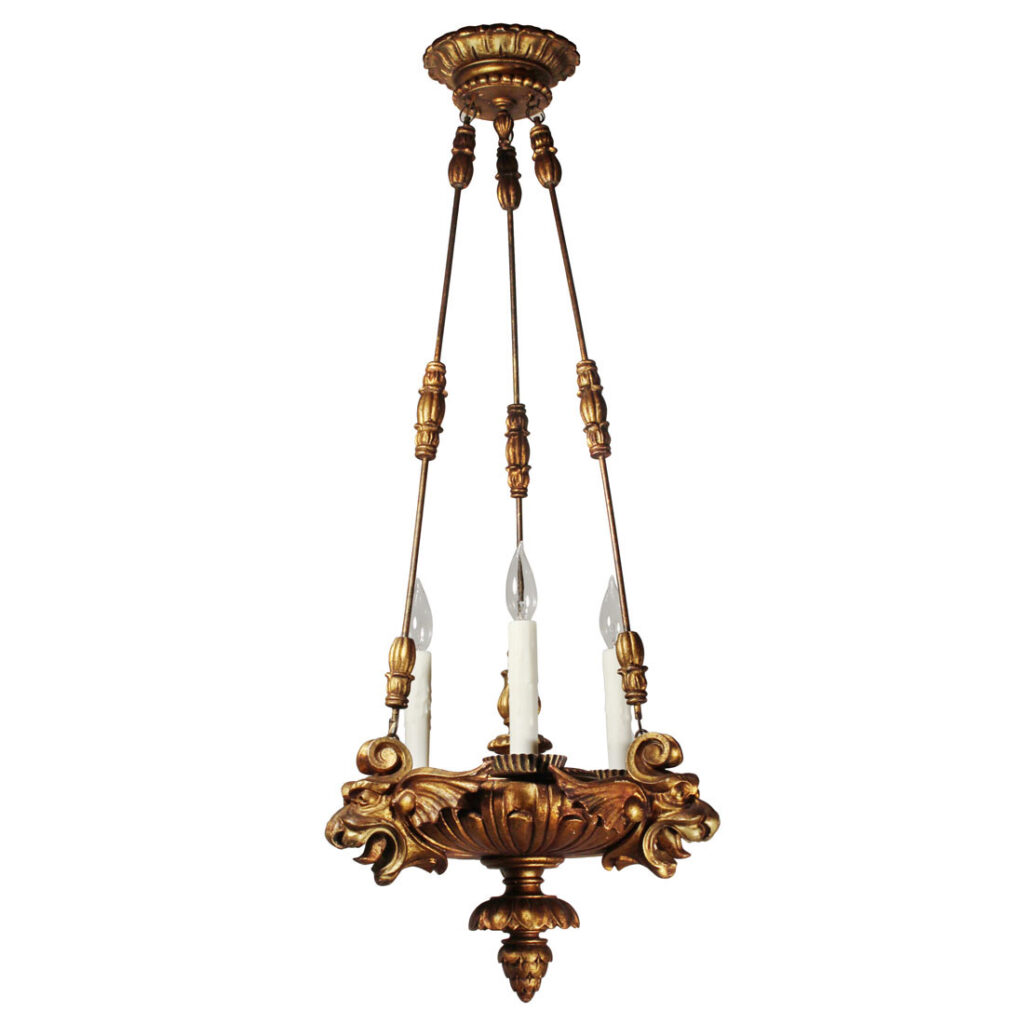 An amazing antique wooden three-light chandelier, dating from the early 1900’s and salvaged out of a home in New York. This chandelier features stylized carved wooden figures, and is in very good antique condition (pictured); it has been professionally rewired and comes with all the necessary attachments for modern installation. The chandelier measures 16-1/2” wide by 44″ long overall. This chandelier requires a custom shipping quote; please contact us if you have any questions.