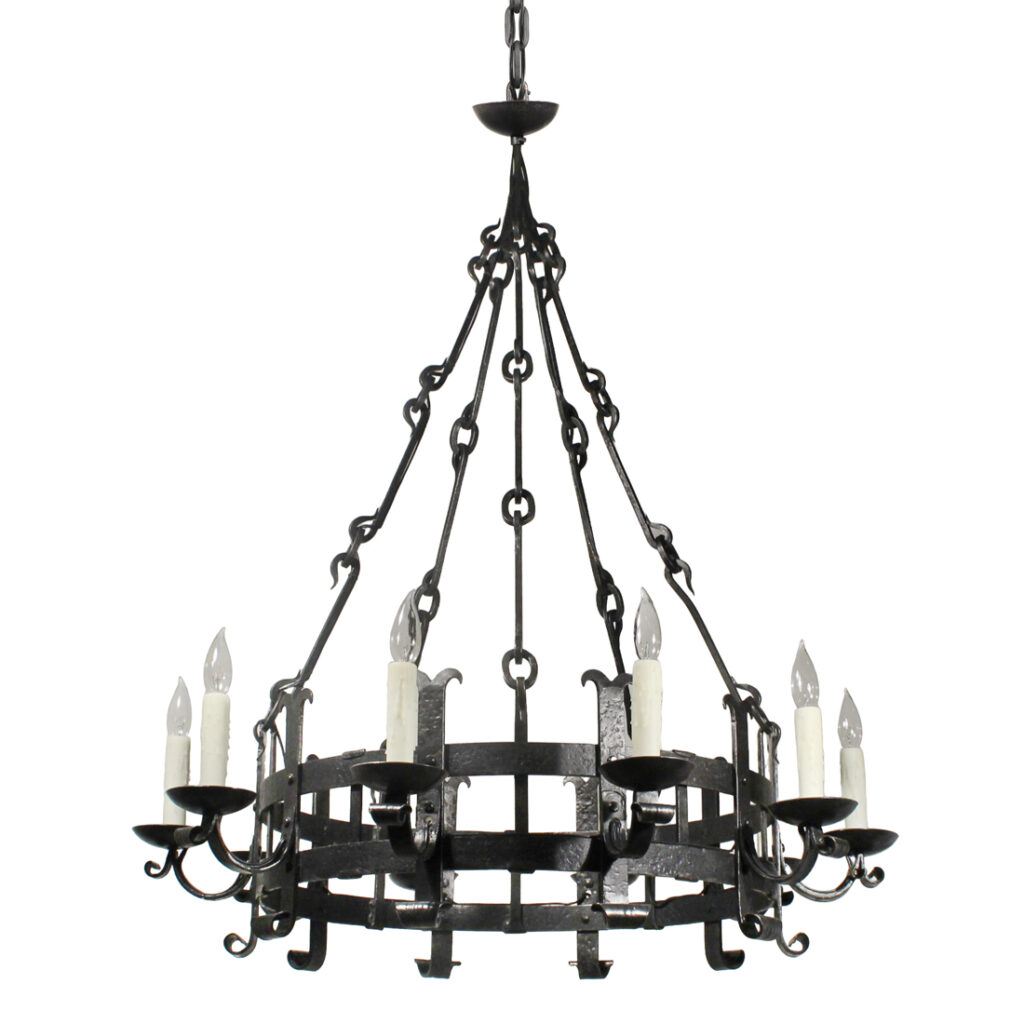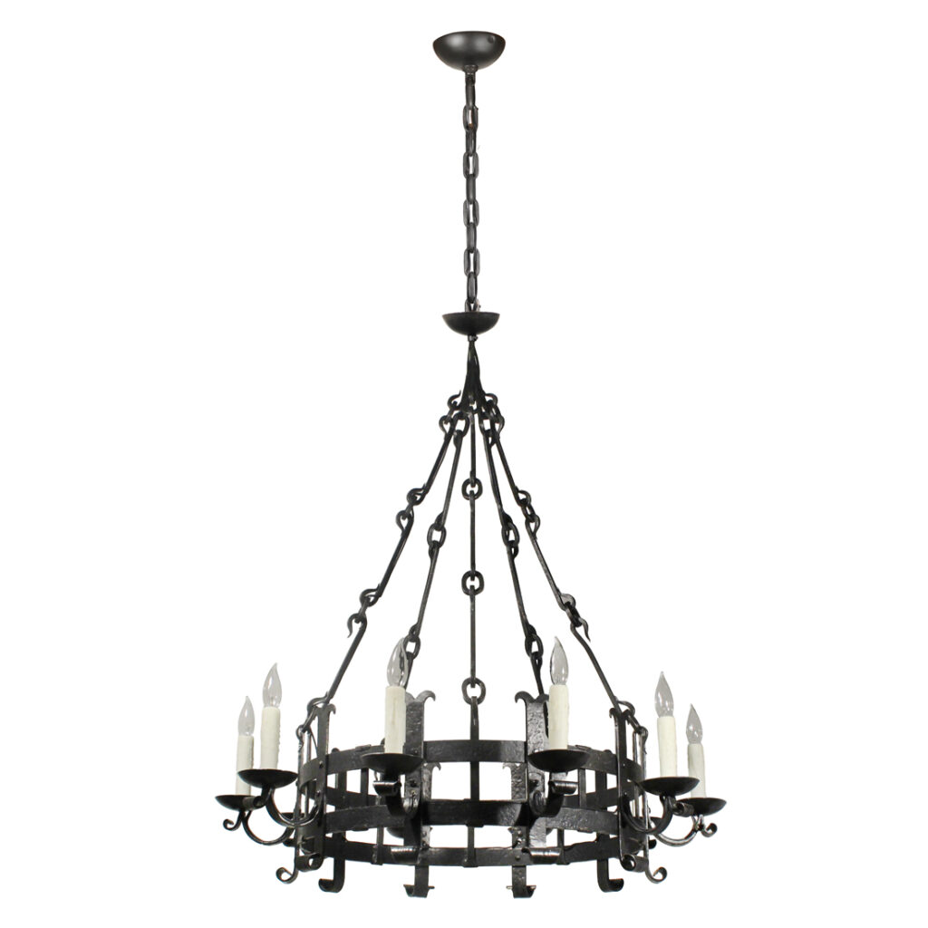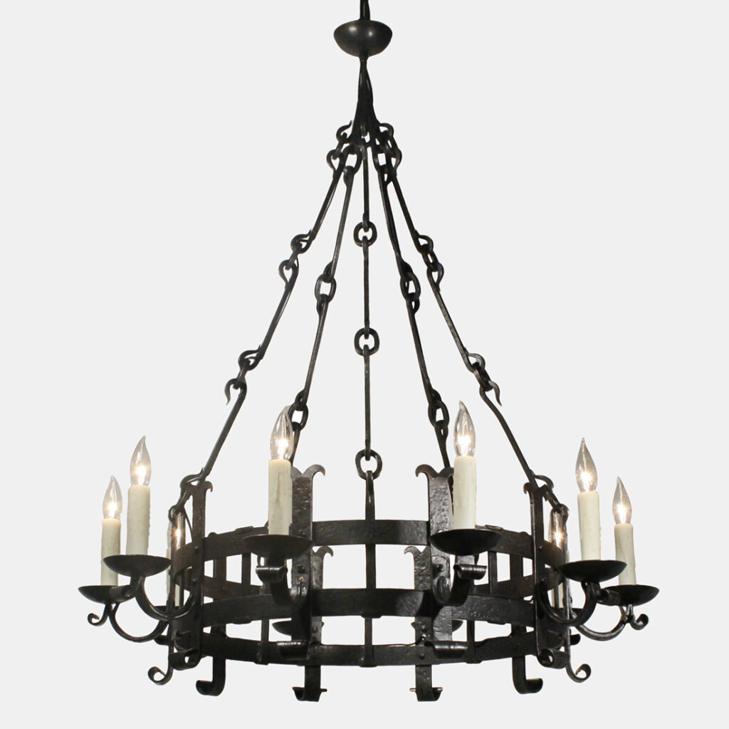 A substantial antique ten-light cast iron chandelier, dating from the early 1900’s and salvaged out of a home in Nashville, TN. This fixture would look lovely in Tudor, Spanish Revival, or Gothic Revival homes. It is in excellent antique condition, and has been professionally rewired with all the necessary attachments for modern installation. The chandelier body measures 36-1/4″ wide, 48″ tall, and is 67-1/4″ long overall. Due to the size of this fixture, it requires a custom shipping quote; please contact us if you have any questions.