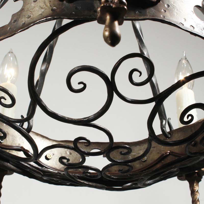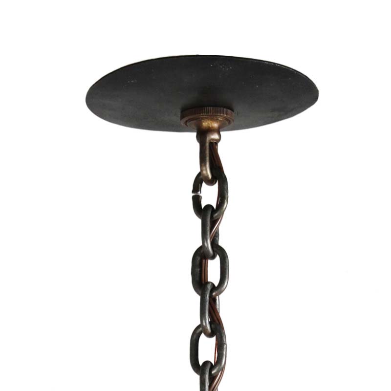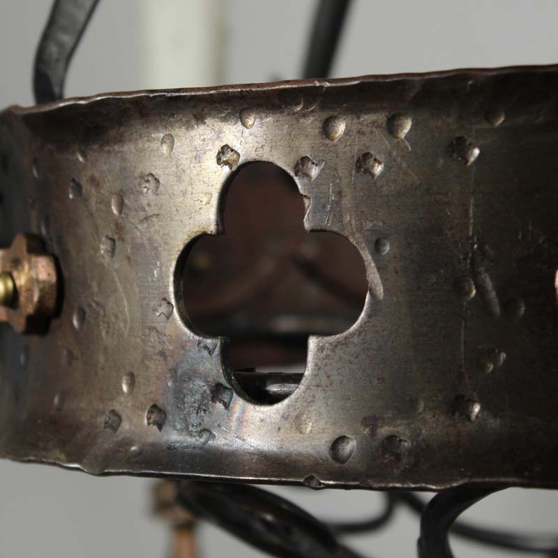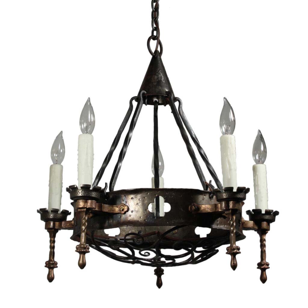 A striking antique five-light bronze and iron chandelier, dating from the early 1900’s and found in a home in Detroit, MI. The fixture begins with an understated canopy that comes down in chain to a loop finial and conical platform. Five twisted bands descend from the platform to support the thick ring style body below, embellished with quatrefoil cut-outs; five lights perched around the perimeter of the hammered ring. The simplicity of this fixture would lend it to work with Tudor, Spanish Revival, or Gothic Revival homes. This light fixture is in excellent condition; it has been professionally rewired and comes with all the necessary attachments for modern installation. The chandelier body measures 21-1/4″ in diameter, 21-3/4″ tall, and 31-1/2″ tall overall.
