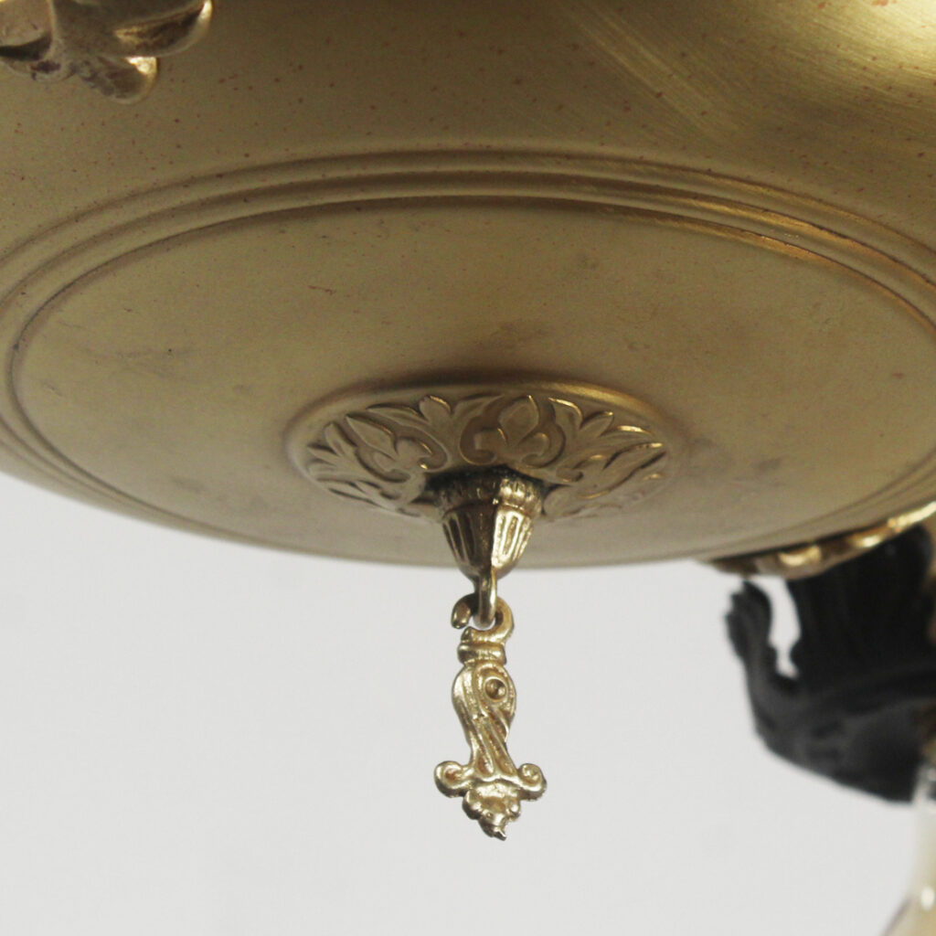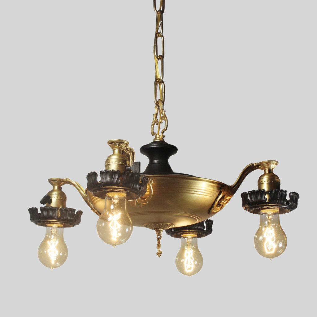 An elegant antique brass four-light chandelier with exposed bulbs, salvaged out of a home in Virginia. Dating from the early 1900’s, this two-toned light fixture is in excellent antique condition, and has been professionally rewired with all the necessary attachments for modern installation. The chandelier body measures 15-1/4″ wide (square), 20″ wide (diagonally), 12-3/4″ tall, and is 31″ long overall.
