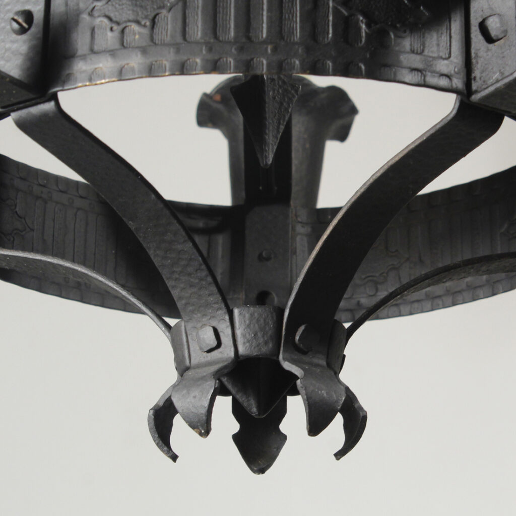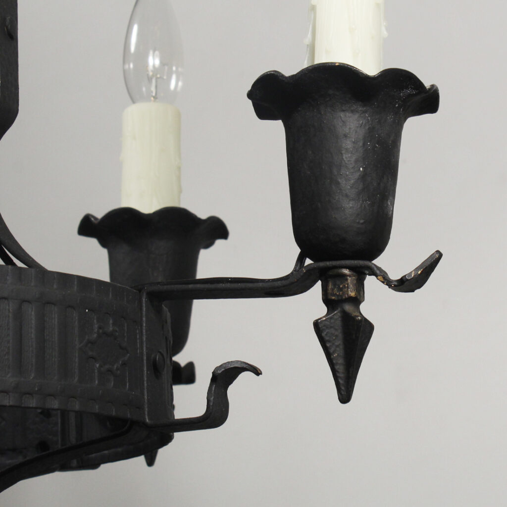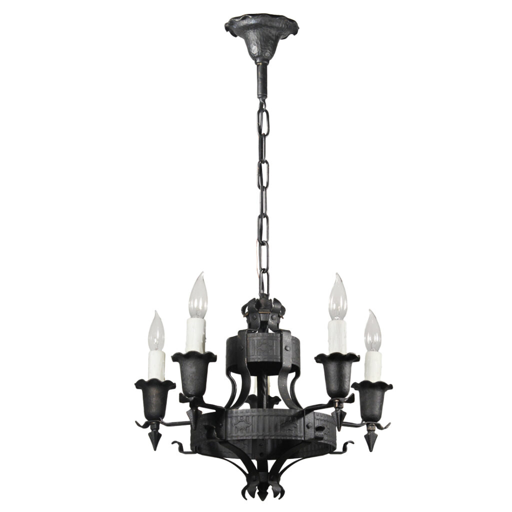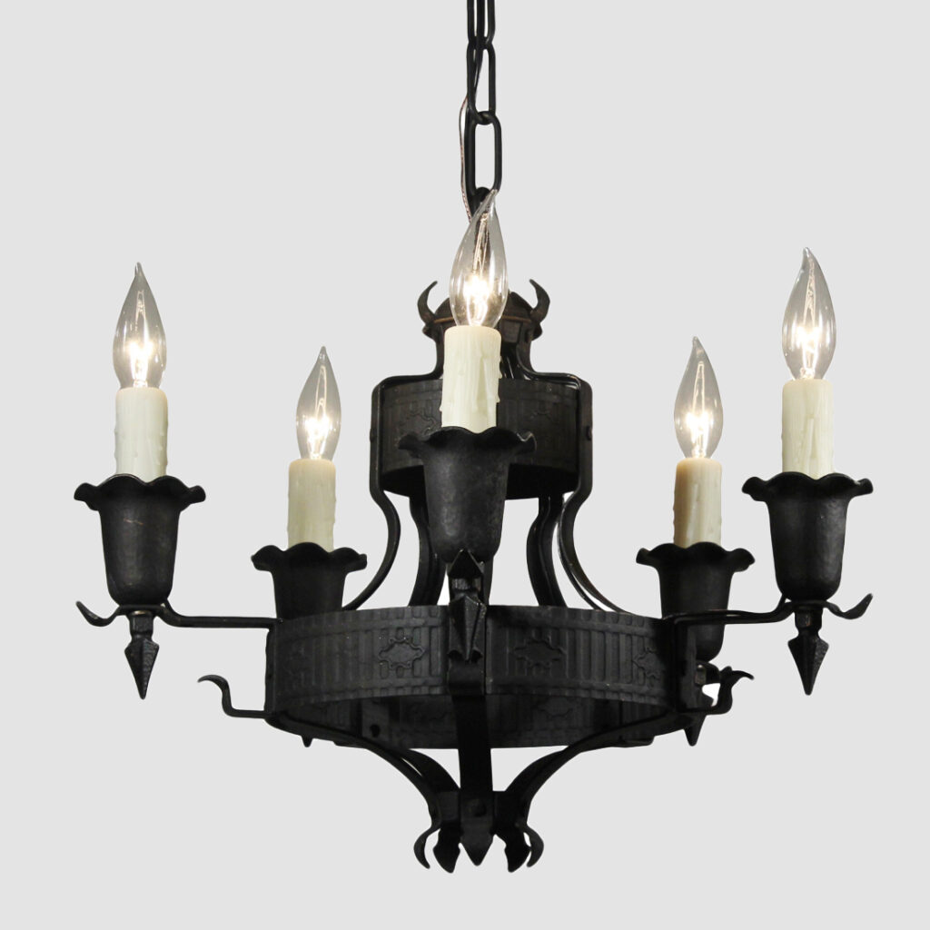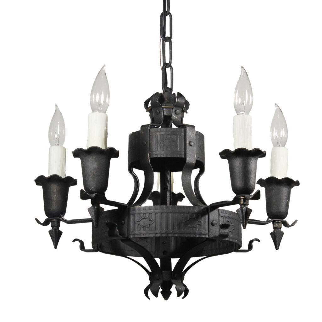 An amazing antique five-light Spanish Revival chandelier, dating from the 1920’s, and salvaged out of a home in Nashville, TN. This chandelier features fabulous hammered textures, stylized reliefs, and pie-crust detailing throughout. It is in excellent antique condition, and has been professionally rewired with all the necessary attachments for modern installation. The simplicity of this fixture would lend it to work with Tudor, Spanish Revival, or Gothic Revival homes. The chandelier body measures 19″ wide and 15-1/4″ tall (body only), and the fixture is 34″ long overall.