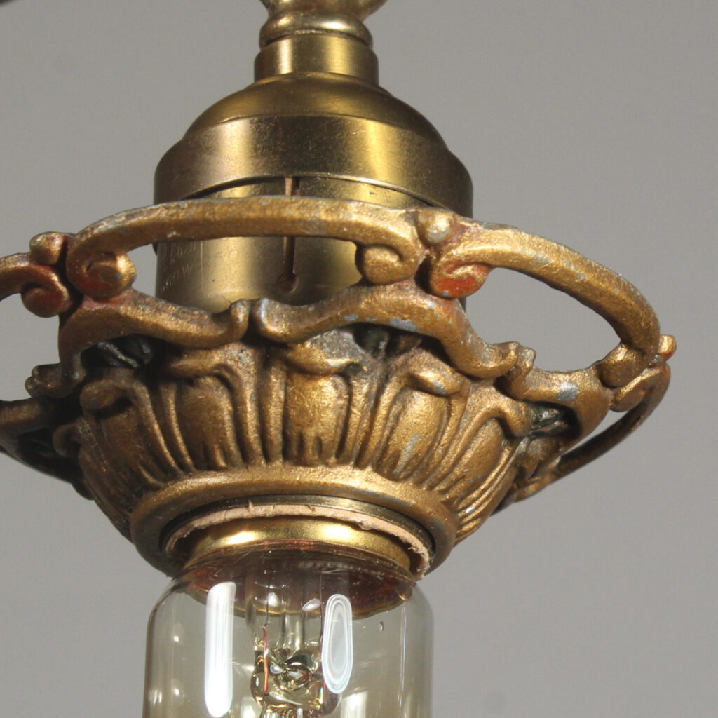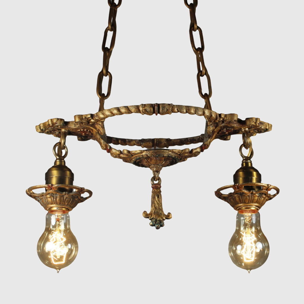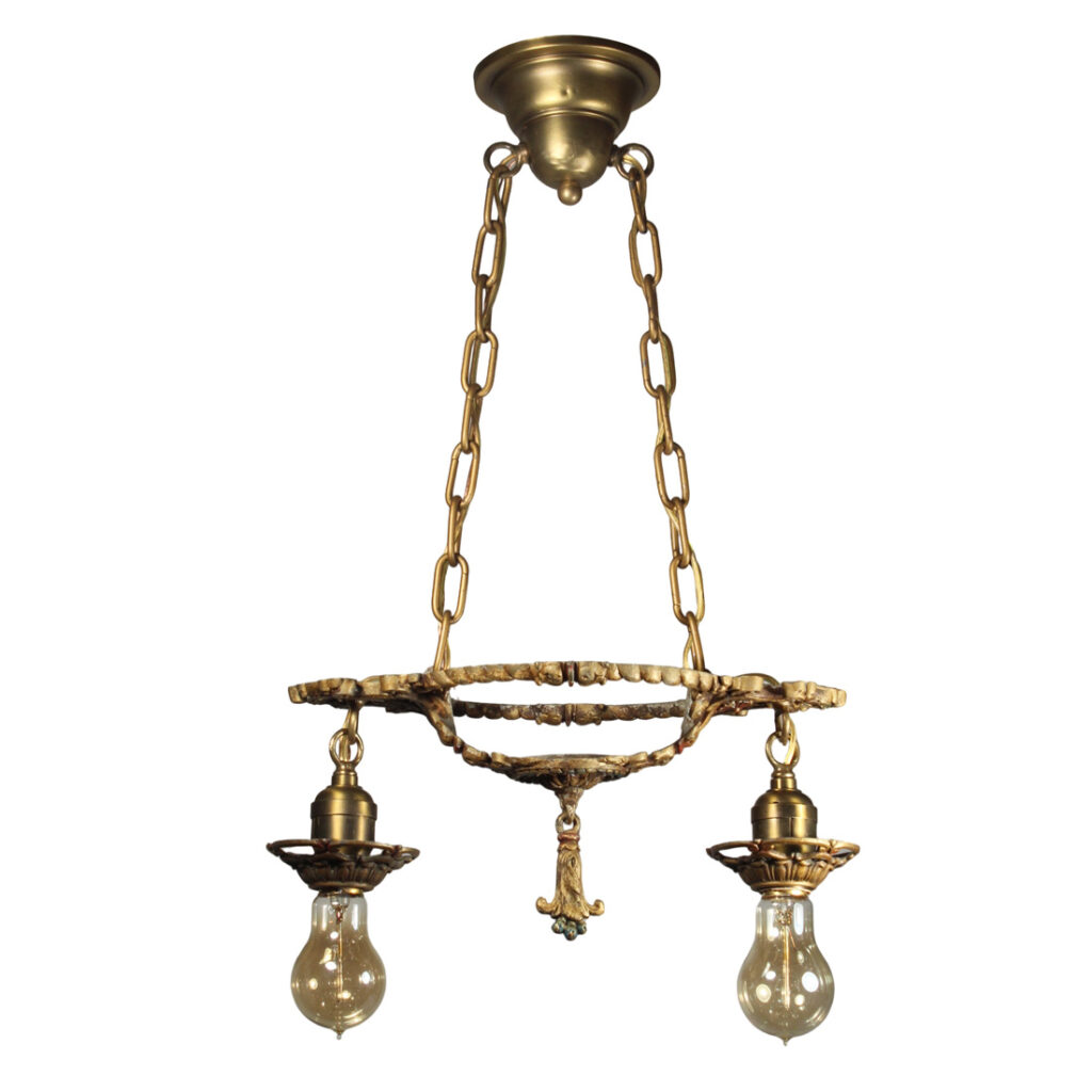A gorgeous antique two-light exposed bulb chandelier, dating from the 1920’s and salvaged out of a home in Columbus, OH. This chandelier is in excellent antique condition and retains some of its original polychrome finish; there is minor denting to the canopy (pictured). It has been professionally rewired and comes with all the necessary attachments for modern installation. The chandelier measures 7-3/8″ by 13-1/2″ wide, 6″ tall (body only, no bulb) and the fixture is 21-1/4″ in overall height (does not include bulbs).