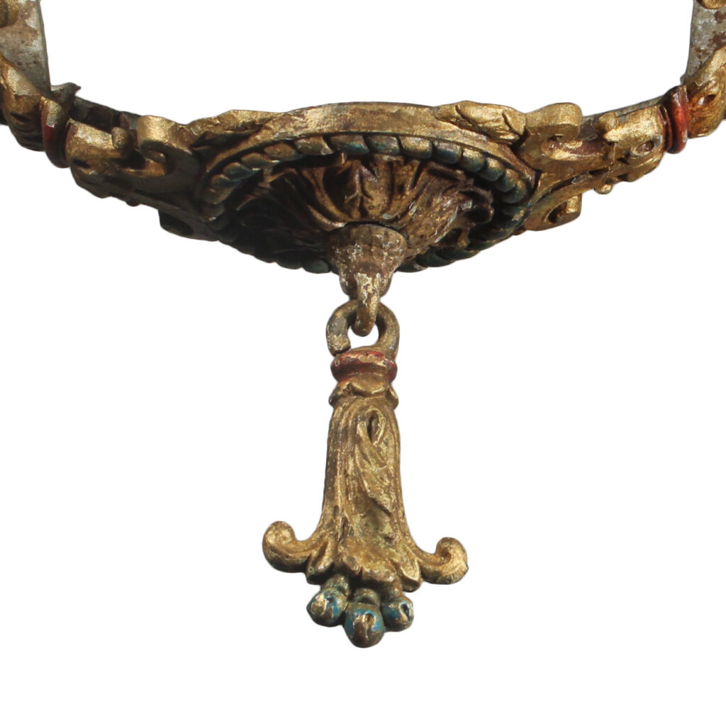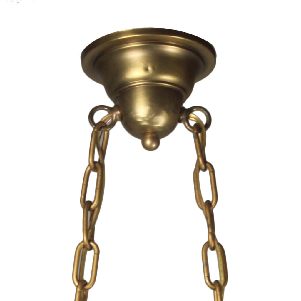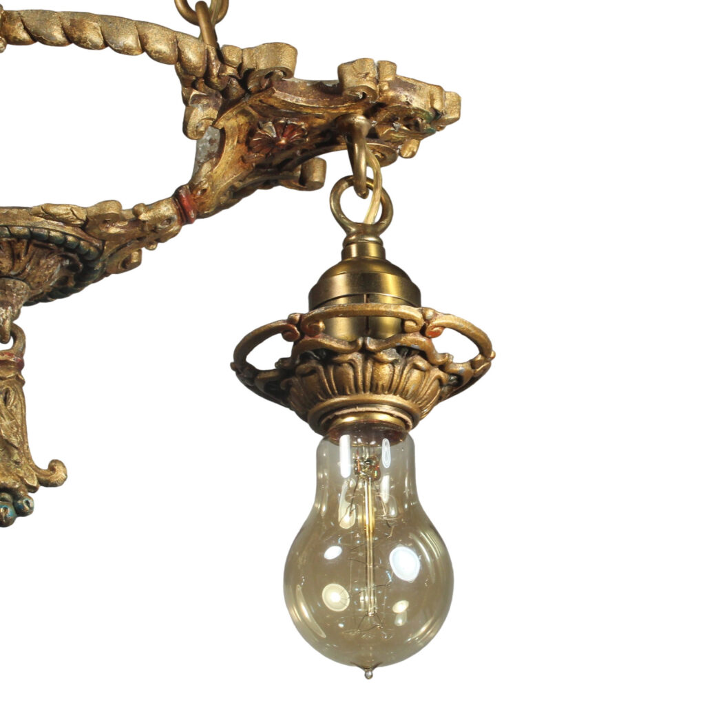 A gorgeous antique two-light exposed bulb chandelier, dating from the 1920’s and salvaged out of a home in Columbus, OH. This chandelier is in excellent antique condition and retains some of its original polychrome finish; there is minor denting to the canopy (pictured). It has been professionally rewired and comes with all the necessary attachments for modern installation. The chandelier measures 7-3/8″ by 13-1/2″ wide, 6″ tall (body only, no bulb) and the fixture is 21-1/4″ in overall height (does not include bulbs).