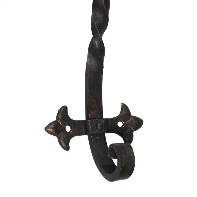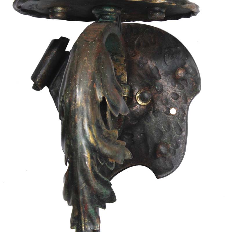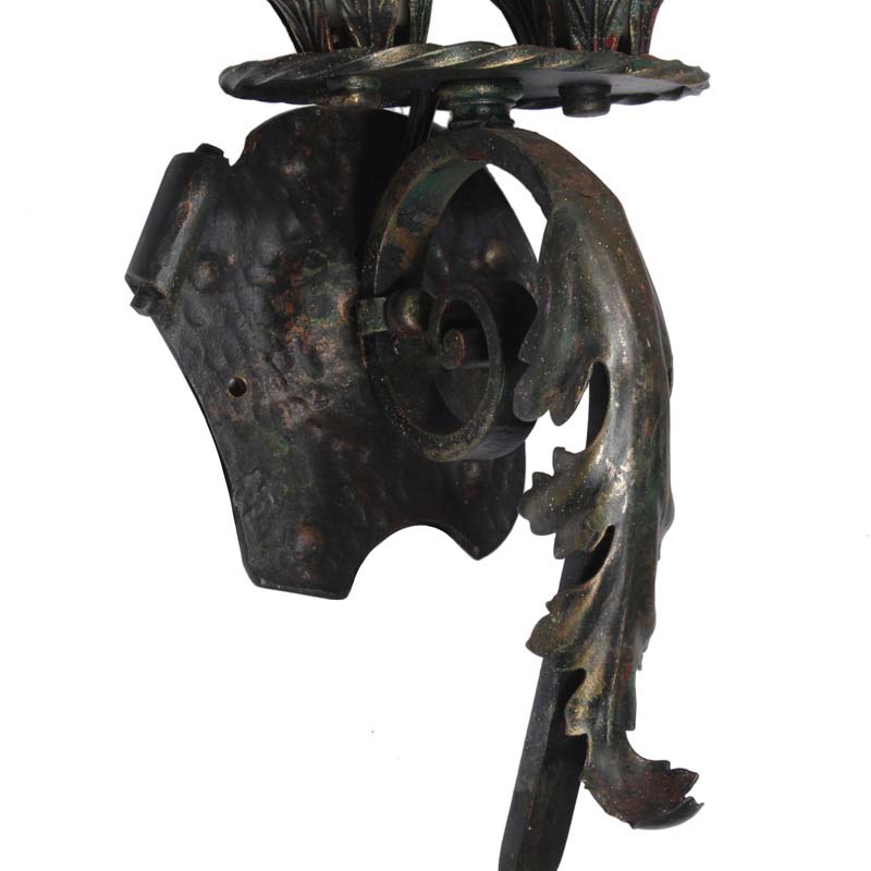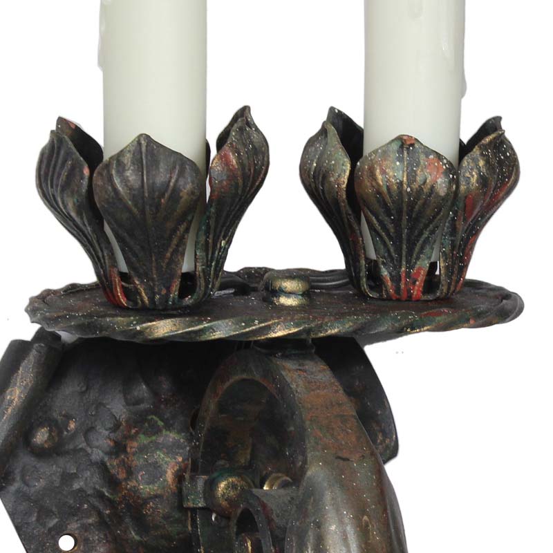 A whimsical pair of antique sconces in cast iron and signed by the maker, dating from the 1920’s. Each sconce features a hammered back plate from which a petite platform protrudes to support two leafy bobeches. The platform is perched upon a twisted iron finial that curls out from the back plate and downward, intersecting with stylized fleur de lis below. These wall lamps are in excellent condition; they have been professionally rewired and come with all the necessary attachments for modern installation. The sconces measure 22-3/4” tall, 5-7/8” wide, and project 6” from the wall.