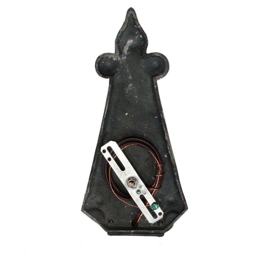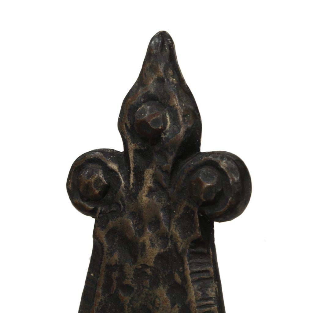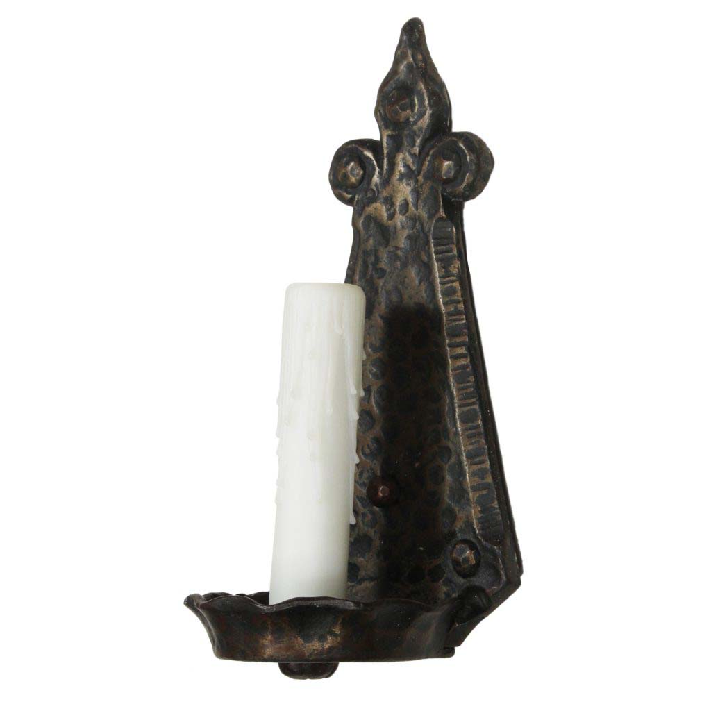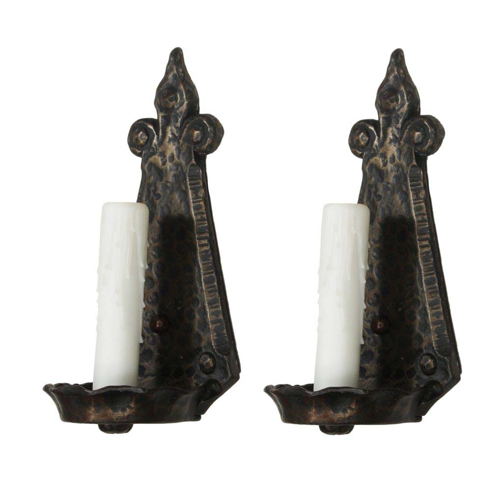 A fabulous pair of antique single arm Tudor sconces, salvaged out of a home in Lexington, KY and dating from 1920. Each sconce features a triangular hammered backplate crowned by a stylized fleur-de-lis and bordered by grooved detailing. A single arm comes out from the bottom of the back plate to support a pie-crust shaped bobeche. These wall lamps are in excellent condition and have been professionally rewired; they come with all the necessary attachments for modern installation. Each sconce measures 9-1/2” tall, 4-1/2” wide, and project 3-1/2” from the wall. THE PRICE LISTED IS FOR THE SCONCE PAIR. There are similar chandeliers under the product code NC3546-RW & NC3545-RW, and coordinating sconces under product code NSP1471-RW.