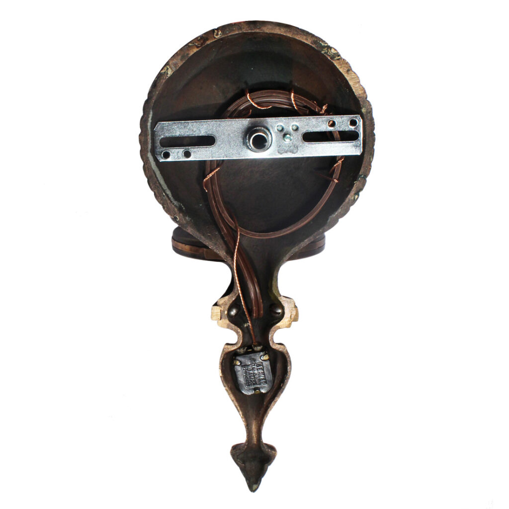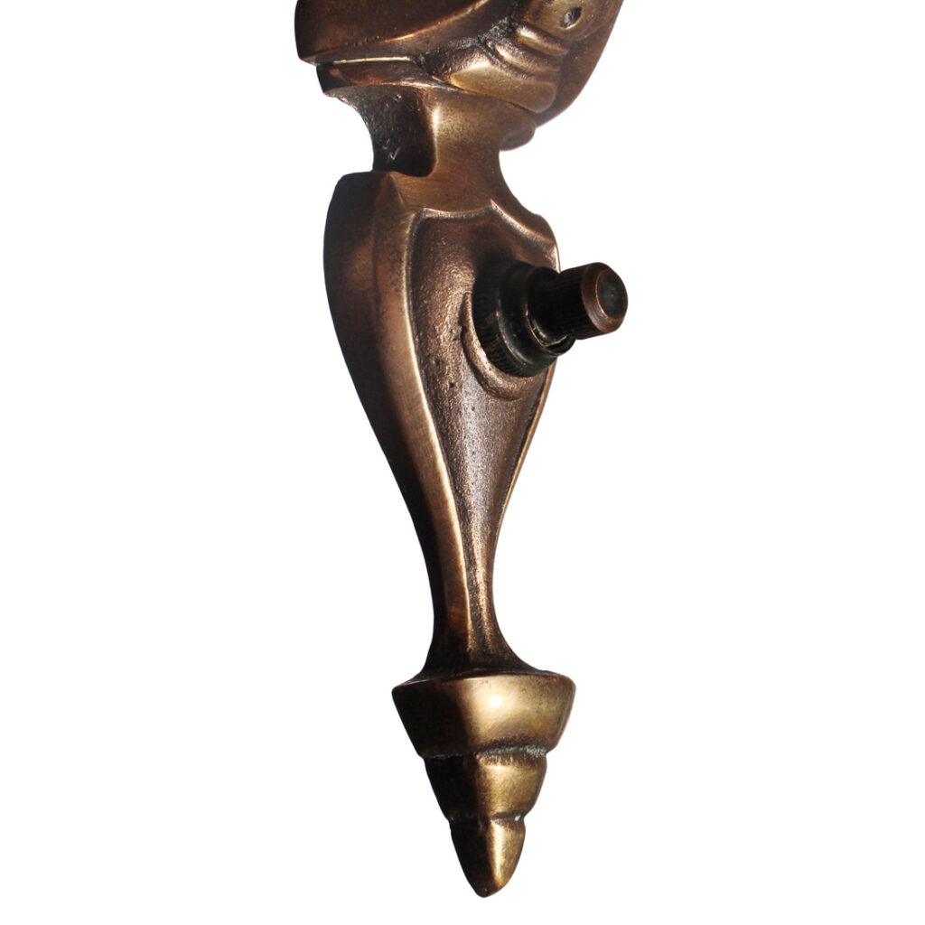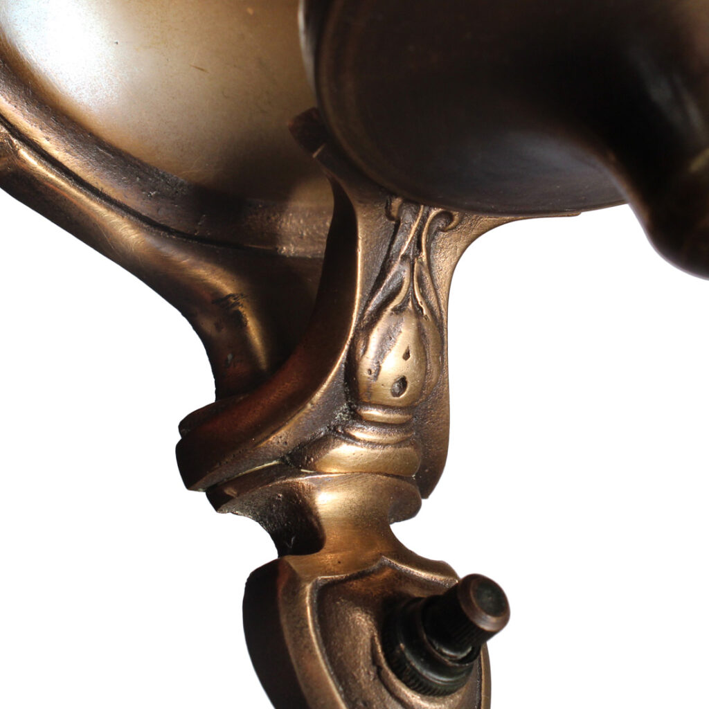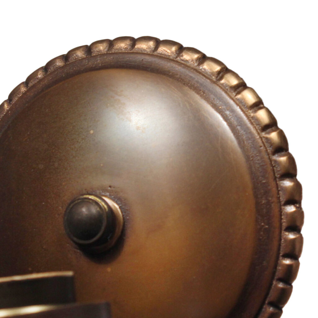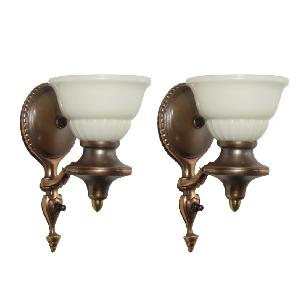 Wonderful antique Art Deco bronze sconce pair with pudding bowl shades, dating from the 1920s and found in a home in Newport, KY. Each sconce features a circular backplate from which a single sconce arm extends out to support a cream colored sit-in shade. These wall lamps are in excellent condition; they have been professionally rewired and come with all the necessary attachments for modern installation. Each sconce measures 4-1/2″ wide, 9-1/2″ tall, and projects 6-1/4″ from the wall; The shade measures 5-3/8″ wide.