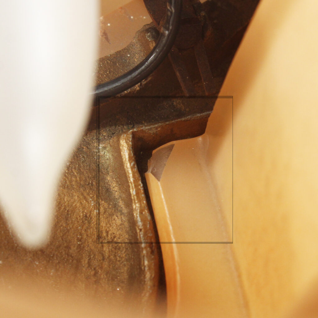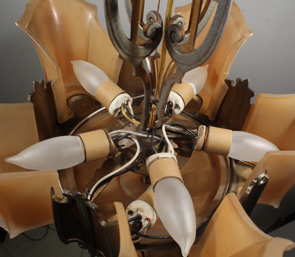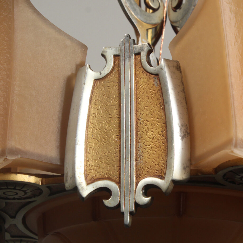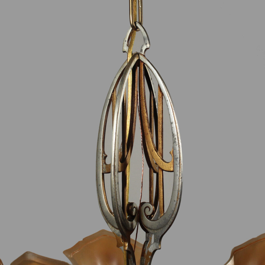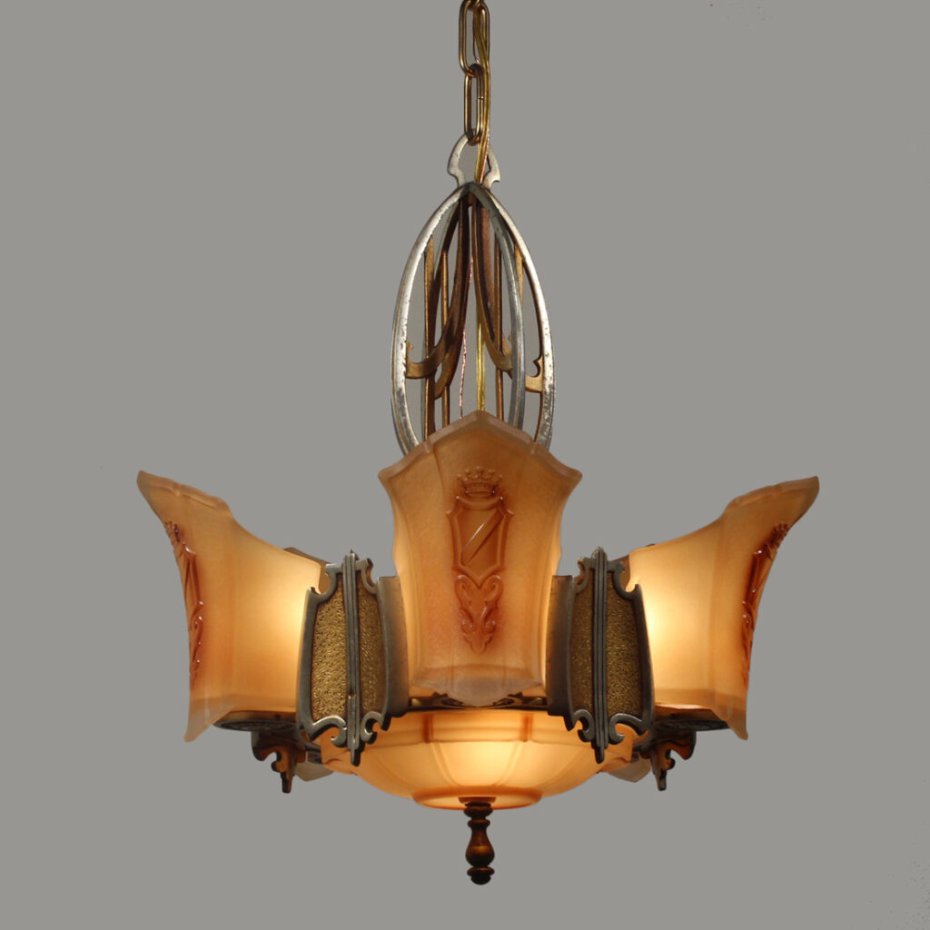 An incredible antique Art Deco slip shade chandelier, dating from the early 1900’s, and salvaged out of a home in Nashville, TN. This five-light chandelier begins with a decorative canopy that comes down in chain to an oversized finial and lamp body below. Surrounding the body are beautiful amber glass slip shades, each detailed with a raised crown and shield motif that echoes the geometric styling found throughout the fixture, including the lower amber bowl. This light fixture is in excellent antique condition; it has been professionally rewired and comes with all the necessary attachments for modern installation. The glass shades are also in very good condition with some fleabites around the edges of the shades (as pictured). This chandelier is 16-1/2” wide, 20-1/2” tall and 35” long overall.