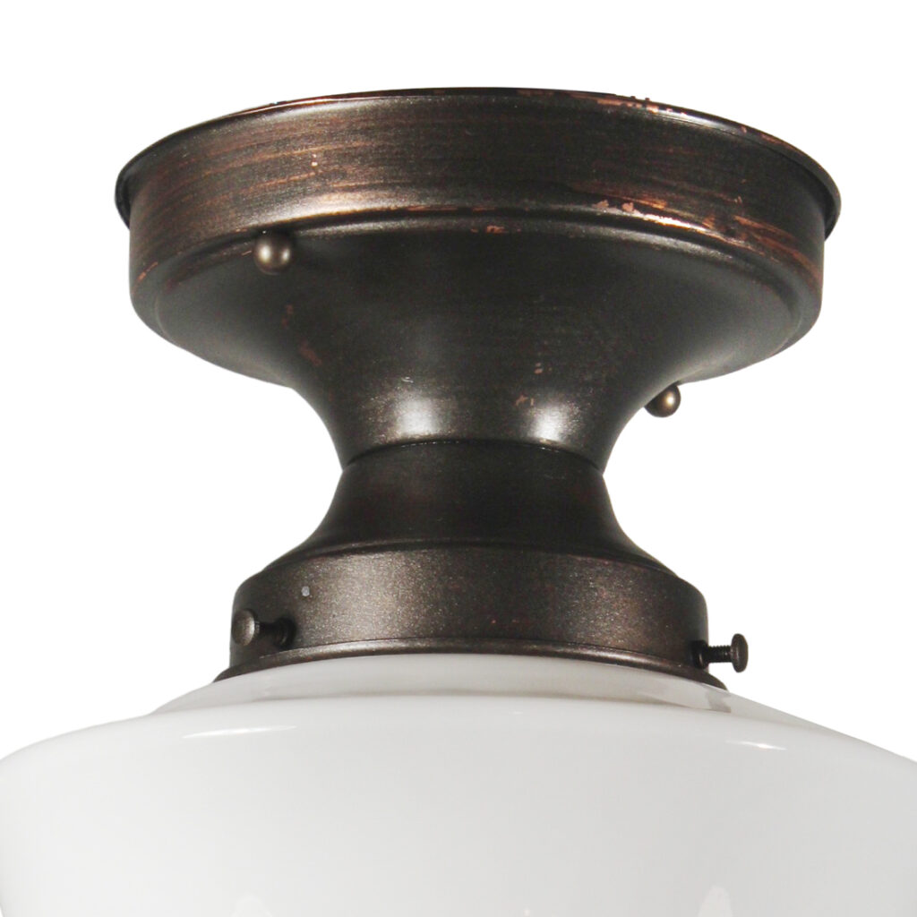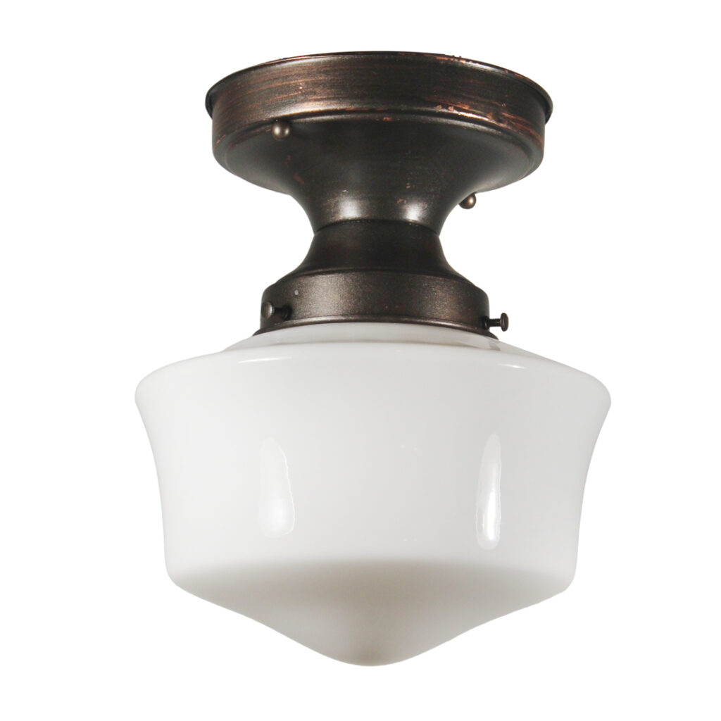 A splendid antique flush mount light, dating from the early 1900s, with its original glass schoolhouse shade. The pendant light features a darkened canopy and fitter supporting a white glass globe below. This light fixture is in very good antique condition (as pictured) and no cracks or breaks to the glass, just the expected fleabites around the rims. It has been professionally rewired and comes with all the necessary attachments for modern installation. The light fixture measures 8” wide and 10-1/2″ tall.