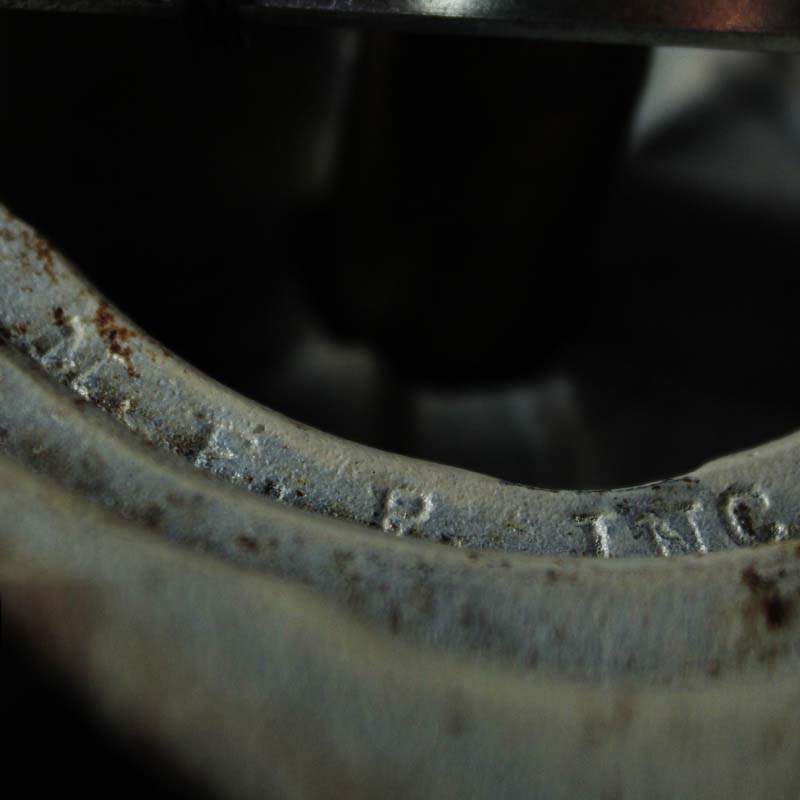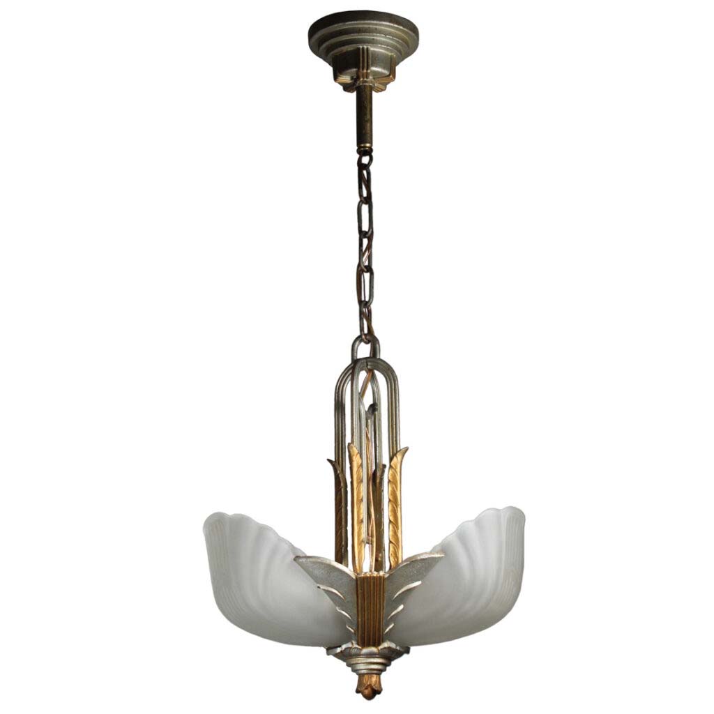A superb antique two-tone Art Deco slip shade chandelier by Markel, dating from the 1930’s. The three-light chandelier begins with a beautifully detailed canopy, coming down in a short rod and chain to meet an arched loop finial. The two-tone fixture below features clean lines and a stylized feather motif; the unusual frosted slipper shades feature floral detail and a scalloped border. This light fixture is in excellent condition; it has been professionally rewired and comes with all the necessary attachments for modern installation. The glass is in very good antique condition with some fleabites and small chips around the edges of the shades (as pictured). The chandelier measures 13” wide, 17” tall (body only,) and 31-1/2” tall overall.