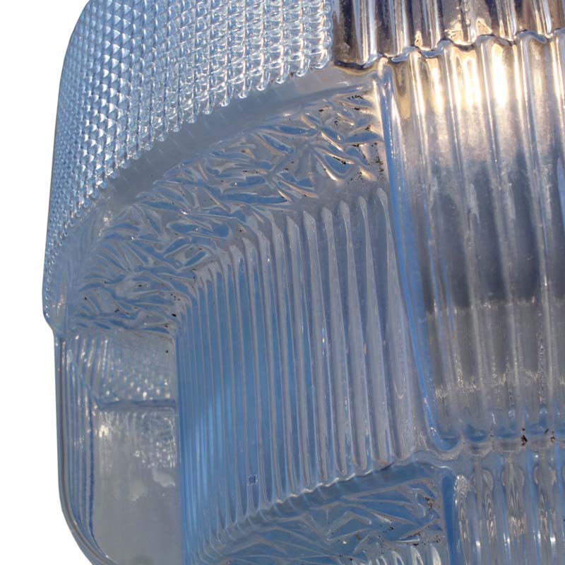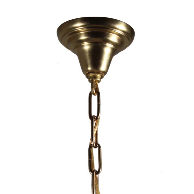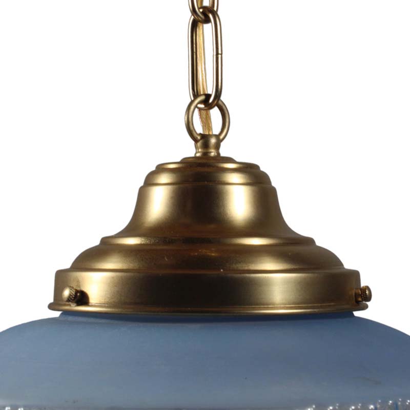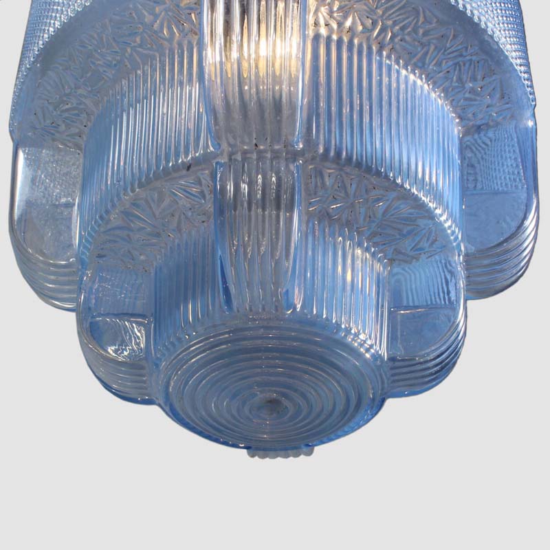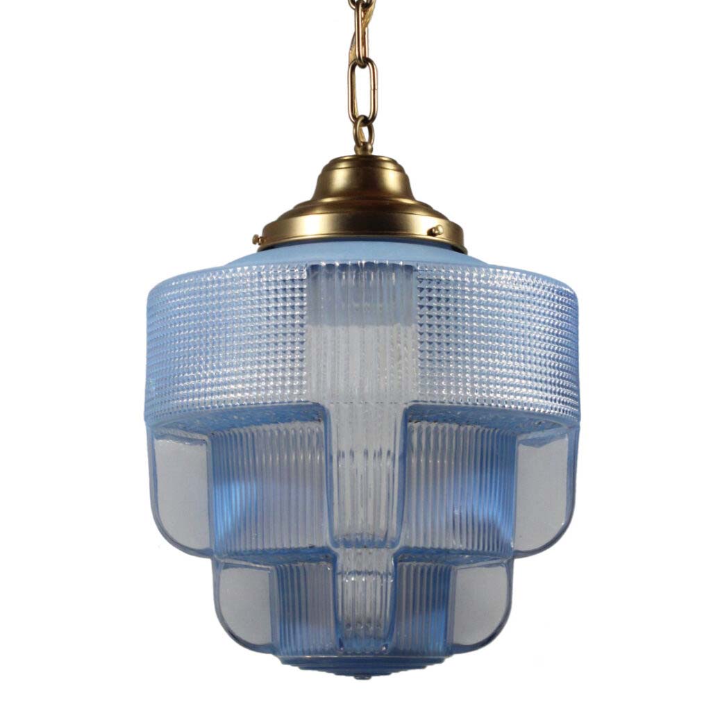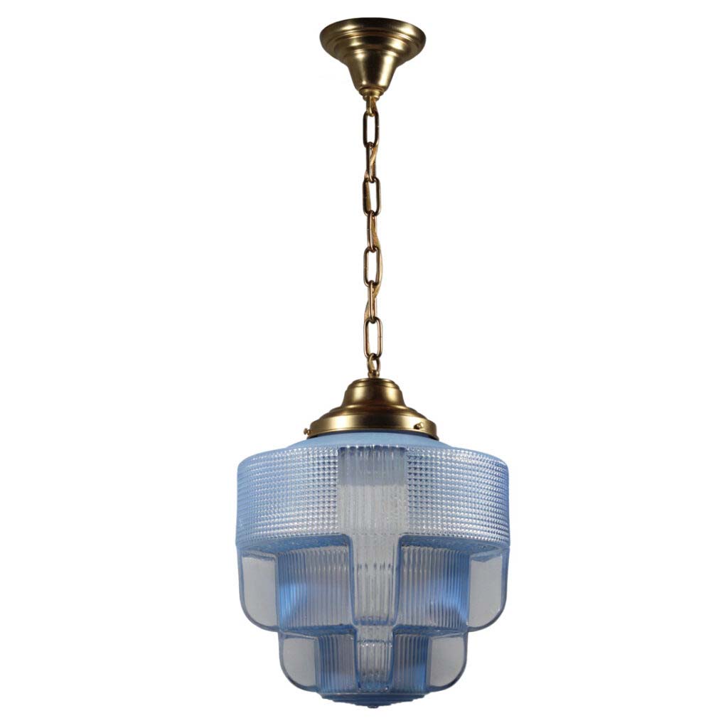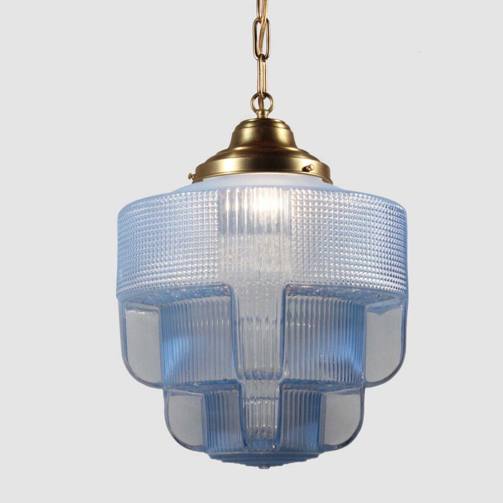 An incredible antique Art Deco skyscraper pendant light, dating from the 1930’s, with its original blue glass ziggurat shade. This skyscraper light features a simple canopy and fitter, with a brilliant blue glass shade. The shade features fantastic texture and sleek waterfall-like sections connecting the three tiers of the shade. This light fixture is in excellent condition, and the glass is also in excellent condition with no cracks or breaks, just the expected fleabites around the rim. The chandelier has been professionally rewired and comes with all the necessary attachments for modern installation. The pendant measures 15-1/2” wide, 18-1/2” tall (body only), and 35” long overall.