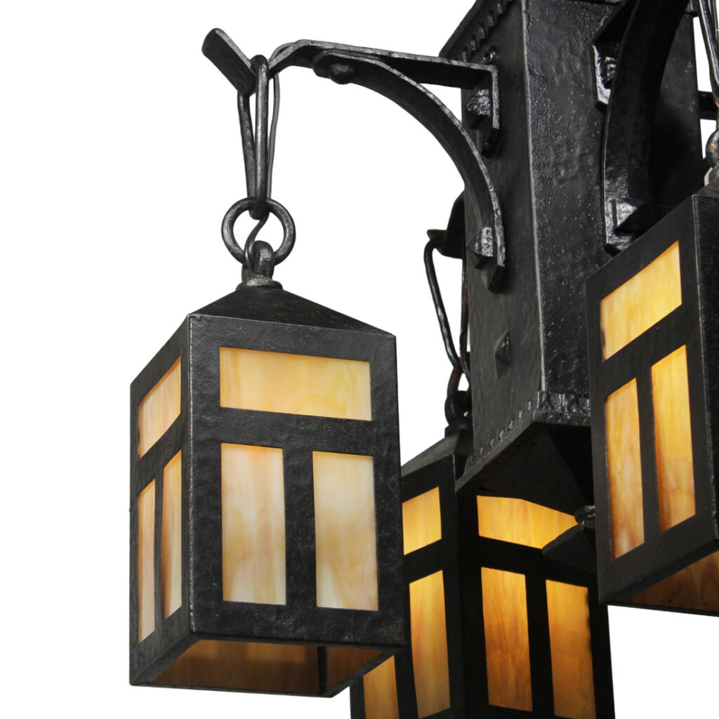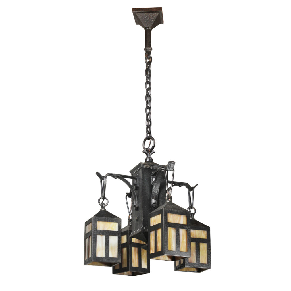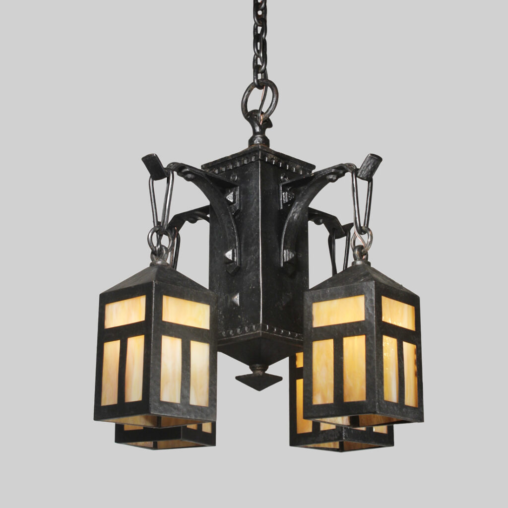 A fabulous antique cast iron four-light Arts & Crafts chandelier, dating from the early 1900’s. This chandelier begins with a pyramidal canopy coming down in chain to affix to a complementary lamp body below. Four brackets extend out from the body to support downward-facing lanterns with amber slag glass. This light fixture is in very good antique condition with a lovely aged finish; the shades are in excellent condition with no cracks or breaks to the glass. The chandelier has been professionally rewired and comes with all the necessary attachments for modern installation. The body measures 16-1/2” wide (square), 19″ wide (diagonal), 21” tall, and is 40″ long overall.
