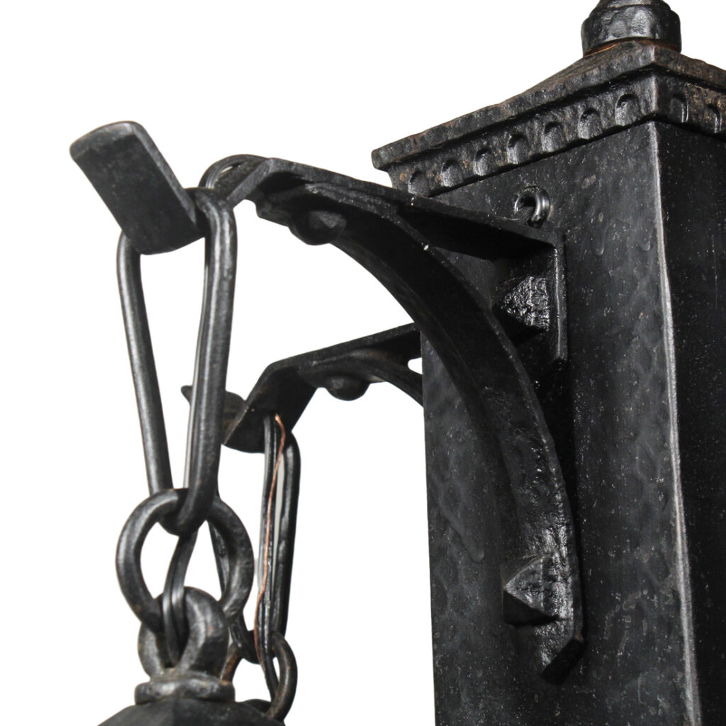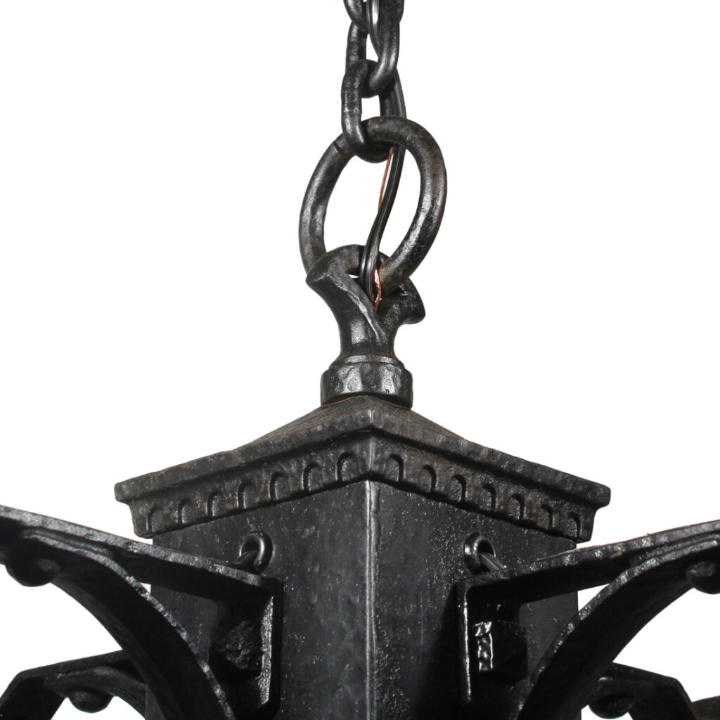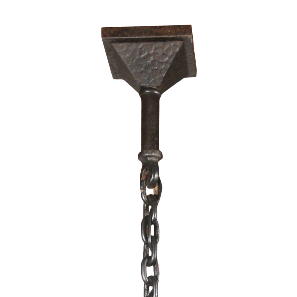 A fabulous antique cast iron four-light Arts & Crafts chandelier, dating from the early 1900’s. This chandelier begins with a pyramidal canopy coming down in chain to affix to a complementary lamp body below. Four brackets extend out from the body to support downward-facing lanterns with amber slag glass. This light fixture is in very good antique condition with a lovely aged finish; the shades are in excellent condition with no cracks or breaks to the glass. The chandelier has been professionally rewired and comes with all the necessary attachments for modern installation. The body measures 16-1/2” wide (square), 19″ wide (diagonal), 21” tall, and is 40″ long overall.