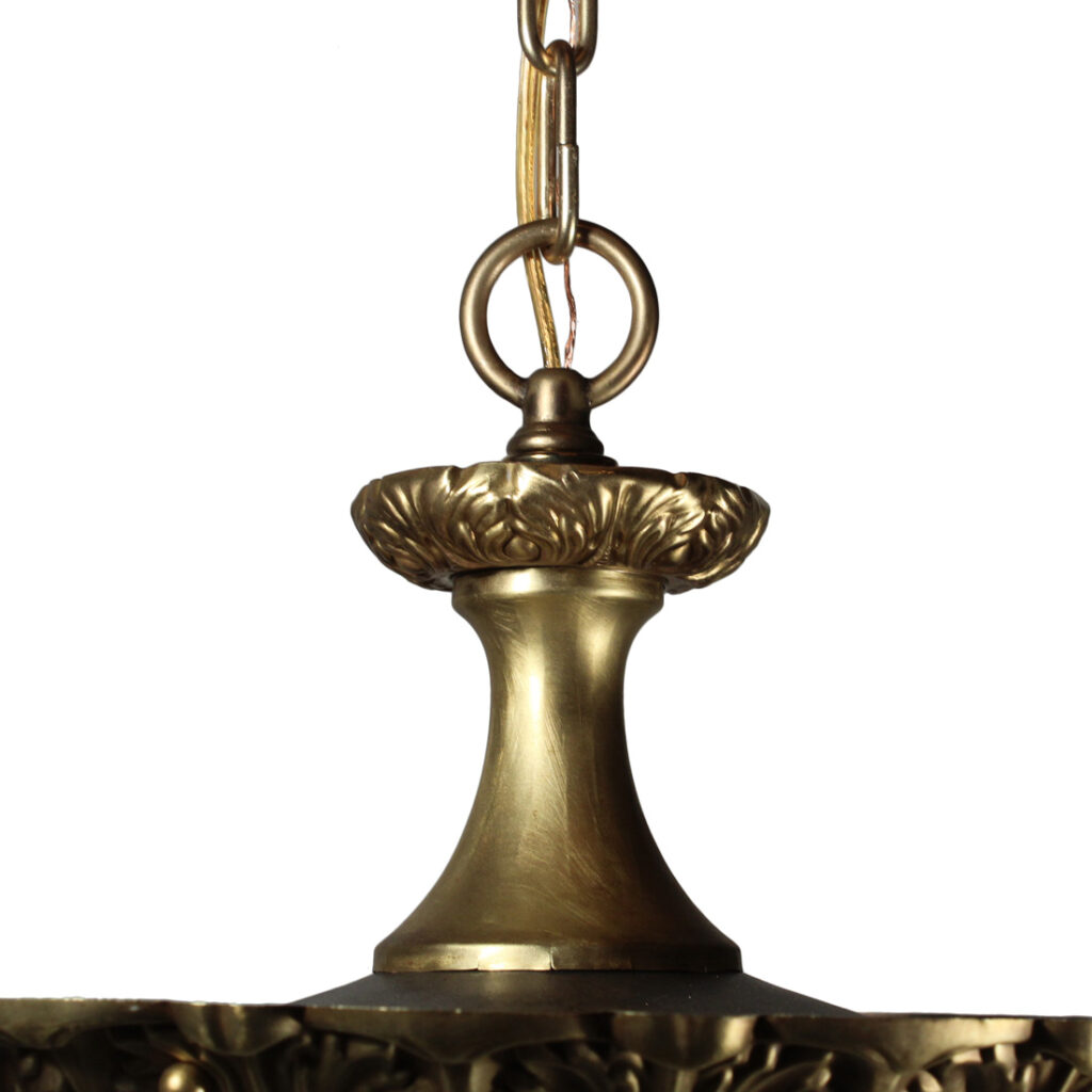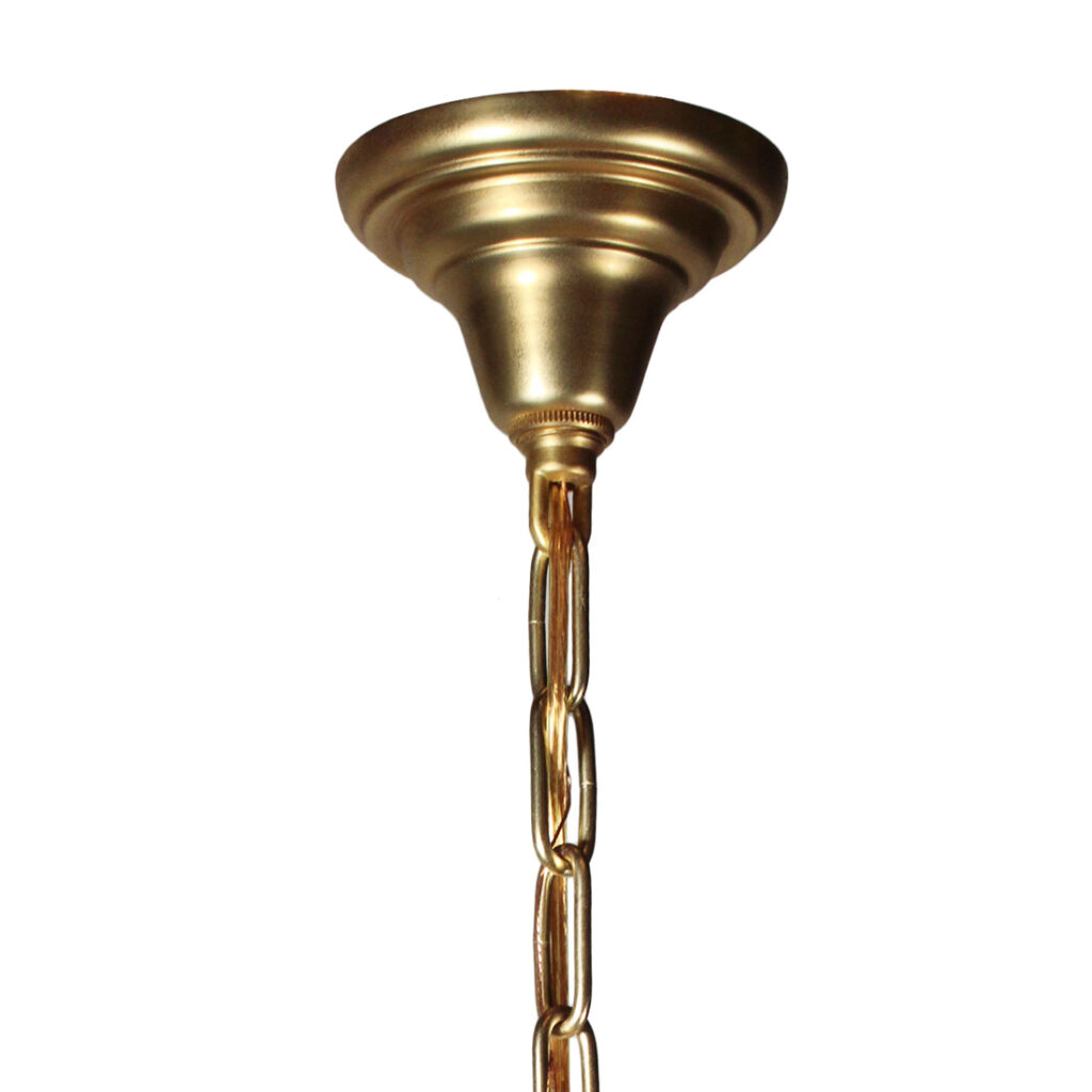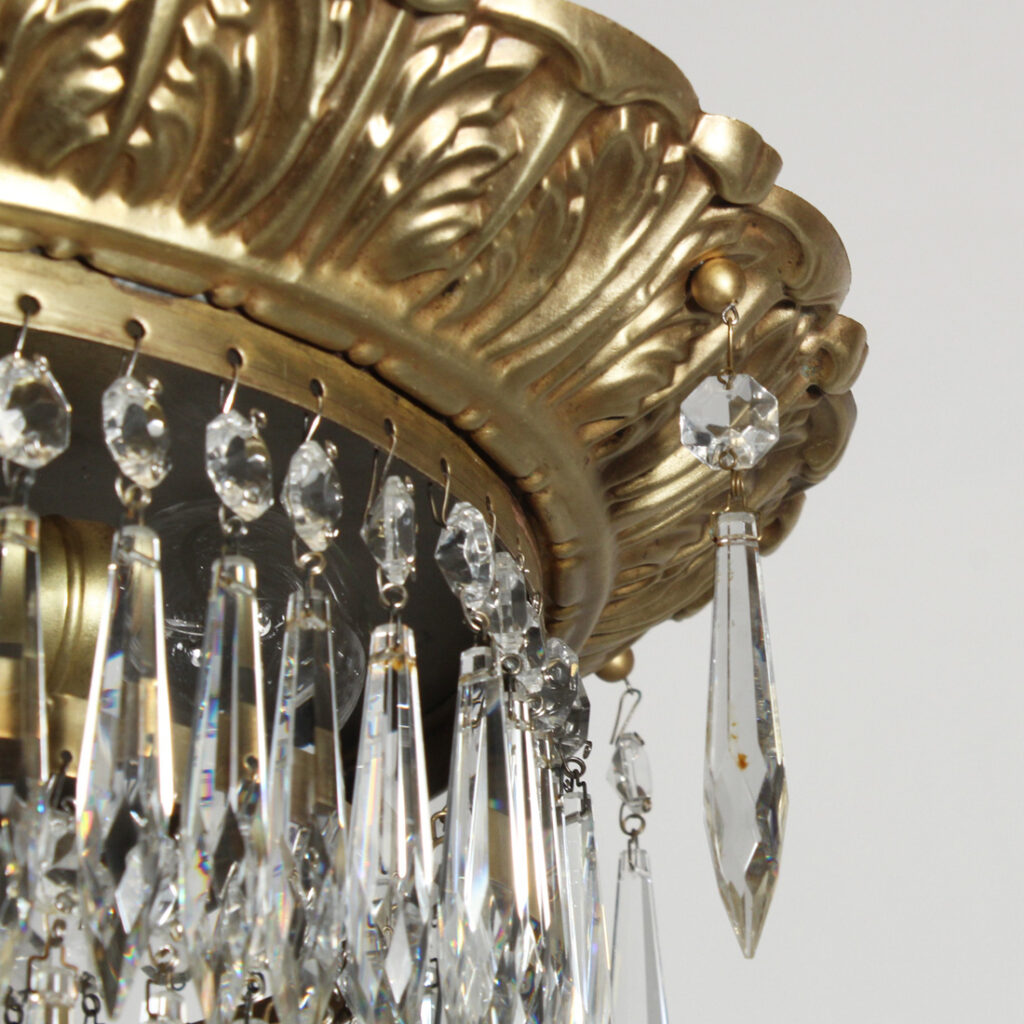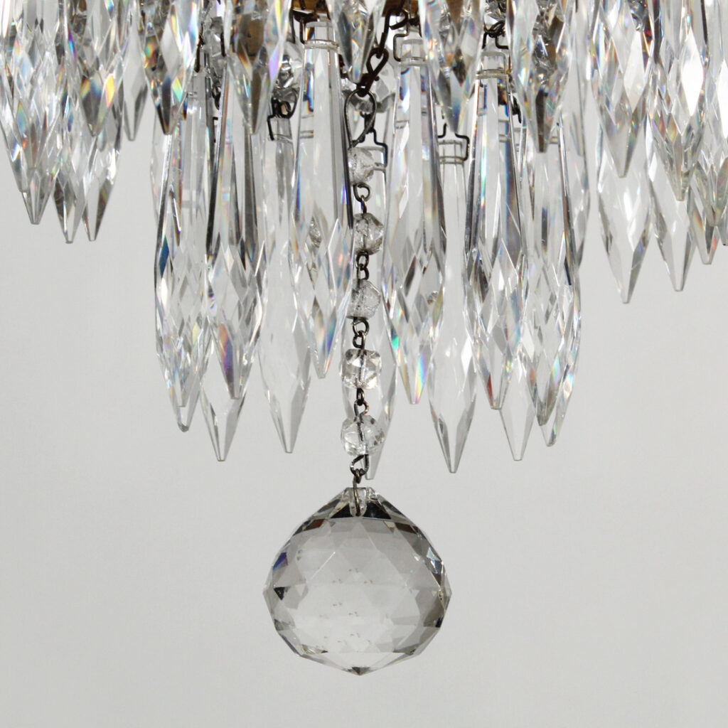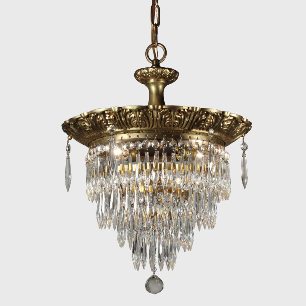 An incredible antique four-tiered Neoclassical chandelier, dating from the early 1900s, and found in a home in Ohio. This “wedding cake” chandelier begins with an understated canopy that comes down in chain to connect to a loop finial and decorative circular brass plate. Below, the chandelier supports four tiers of sparkling “icicle” prisms, and is finished with a faceted crystal ball. This light fixture is in very good condition with some stress cracks to the brass (as pictured); it has been professionally rewired and comes with all the necessary attachments for modern installation. The chandelier measures 16-1/2” wide, 21-1/2″ tall (body only) and the fixture is 38” long overall.