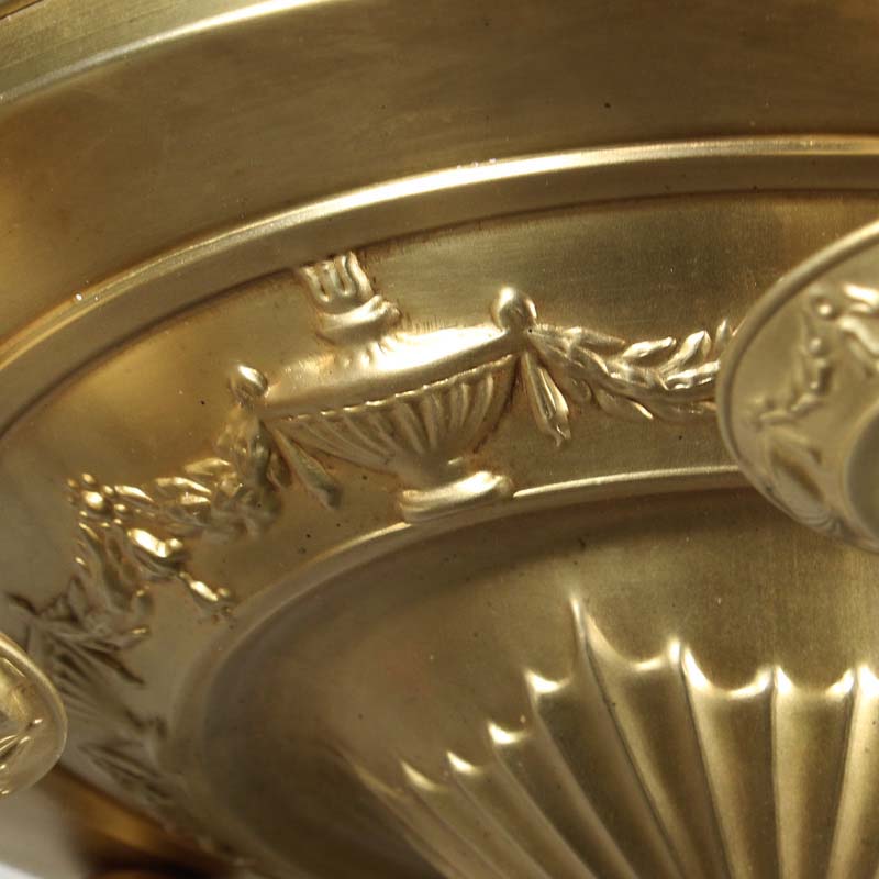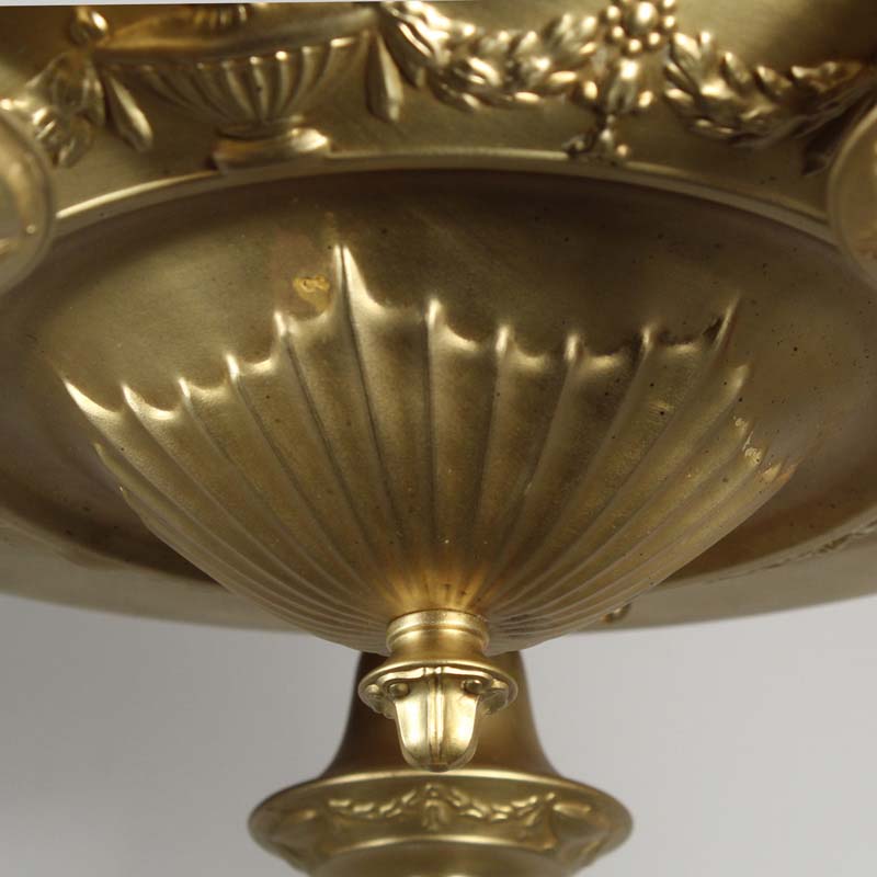 A beautiful brass antique five-light flush mount fixture with exposed bulbs, dating from the early 1900’s and found in an apartment building in New York, NY. This lovely Neoclassical light is in excellent condition and has been professionally rewired with all necessary attachments for modern installation. It measures 17″ in diameter, and 5″ tall (without the bulbs).