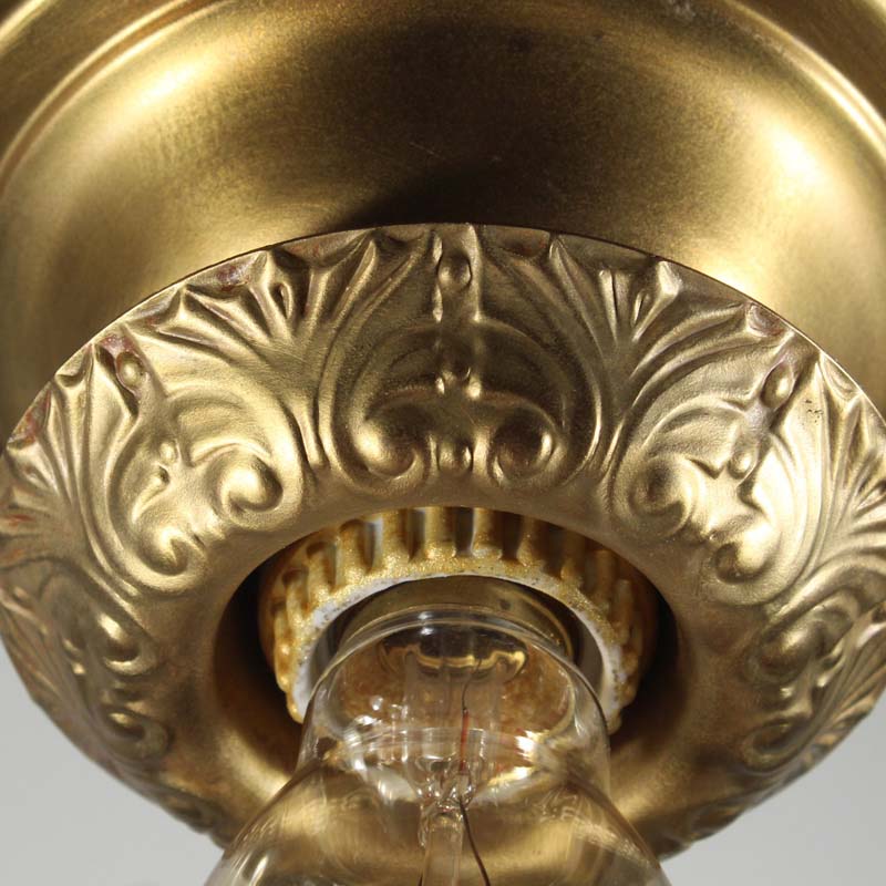 A lovely antique flush mount light with an exposed bulb, dating from the early 1900s and found in a home in Charlotte, NC. This fixture begins with a smooth brass canopy which affixes to a coordinating leafy bobeche. It is in very good condition with a beautifully aged brass finish; it has been professionally rewired and comes with all the necessary attachments for modern installation. The flush mount measures 5-3/8″ in diameter, 3″ tall (does not include bulb).
