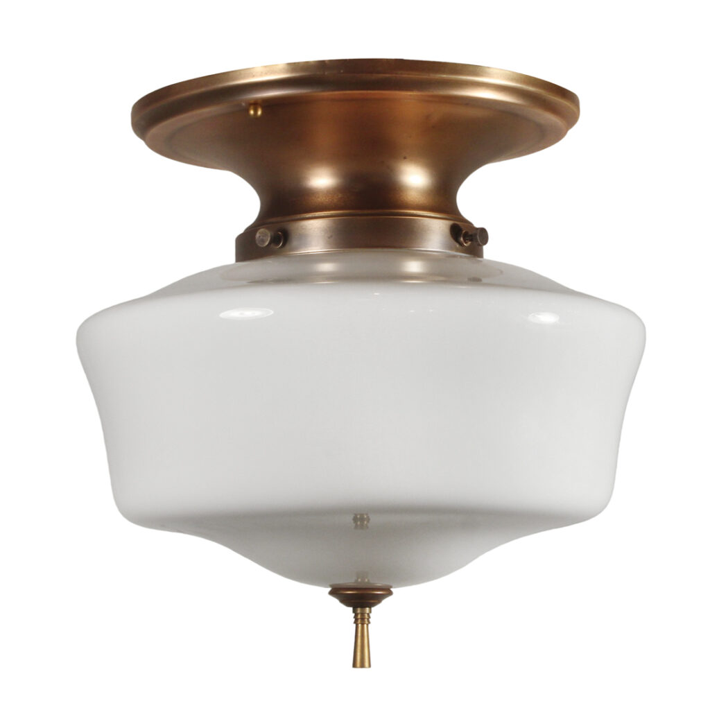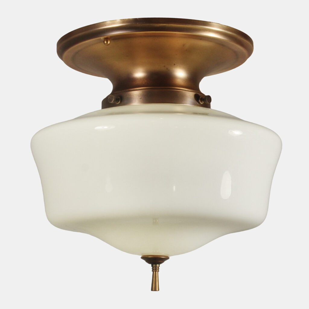 An elegant antique schoolhouse flush mount light, dating from the 1930s and salvaged out of Arlington, VA. The flush light features an understated brass canopy that comes supports a sleek fitter with a white glass schoolhouse globe. This light fixture is in excellent condition with no cracks or breaks to the glass, just a few small scratches and the expected fleabites around the rims; there are minor dents to the fitter as well (as pictured). It has been professionally rewired and comes with all the necessary attachments for modern installation. The light fixture measures 14-1/2” wide, 14” tall (body only), and the canopy is 11-1/2″ wide at the top.