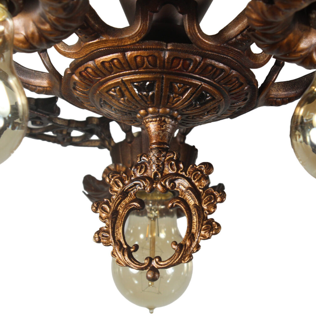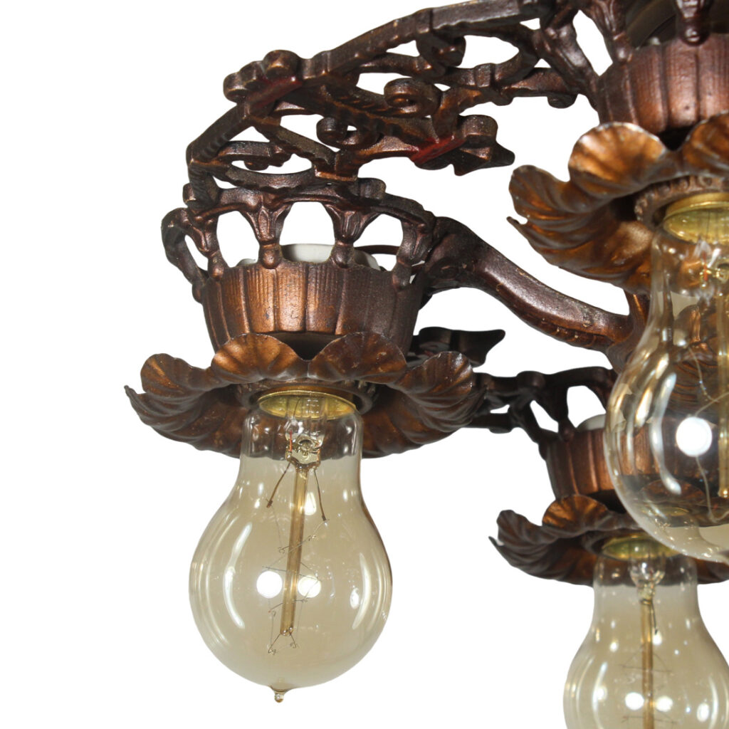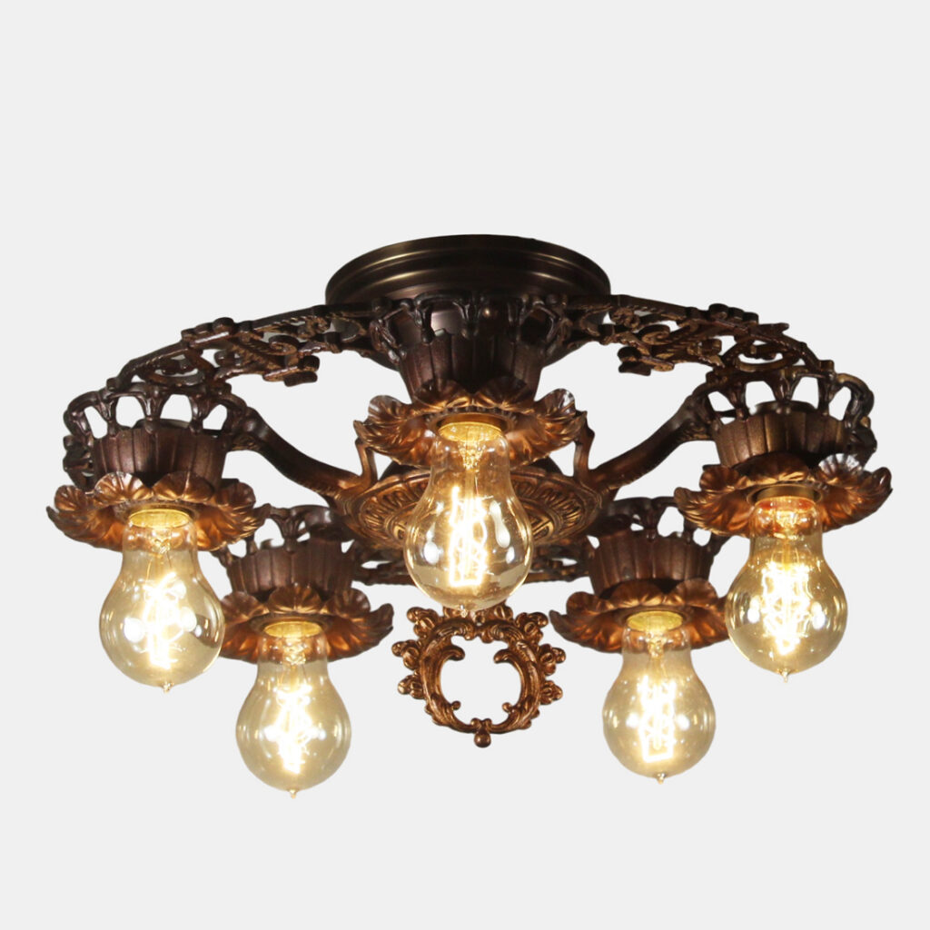 A splendid antique cast iron semi-flush five-light fixture, dating from the 1930’s and salvaged out of a home in Dayton, OH. This semi-flush mount light fixture features beautiful decorative detailing, is in excellent antique condition with its original bronze wash finish (as pictured). It has been professionally rewired and comes with all necessary attachments for modern installation. It measures 16-1/4″ wide, the canopy measures 5-1/4″ wide, and the overall height is 9″ tall (does not include bulbs).