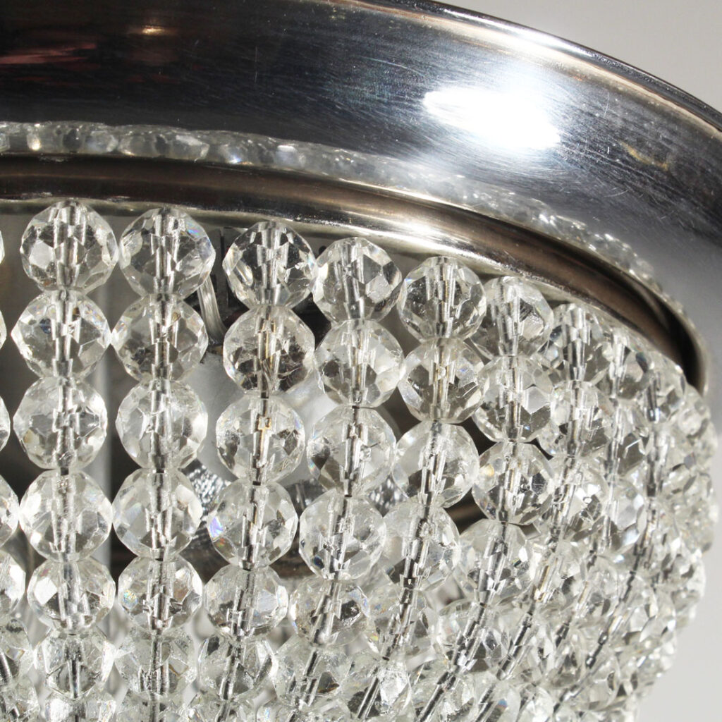A stunning antique flush-mount beaded basket chandelier, dating from the early 1900’s and salvaged out of a home in Chattanooga, TN. The light fixture begins with a sleek metal band which supports the beaded basket below; the basket is composed of faceted glass beads that gradually reduce in size to affix to a faceted crystal ball finial. The fixture and its prisms are in excellent antique condition; the chandelier has been professionally rewired and comes with all the necessary attachments for modern installation. The flush-mount chandelier measures approximately 12″ wide at its fitter and 8″ tall.