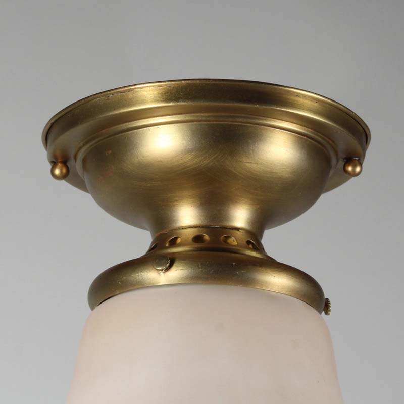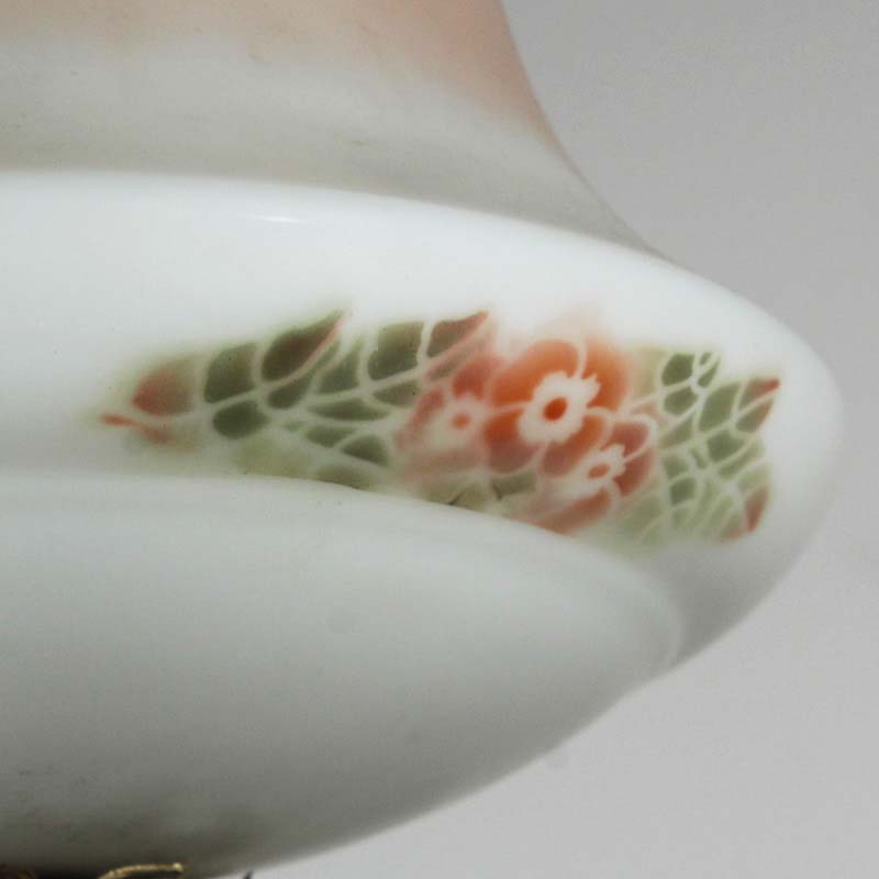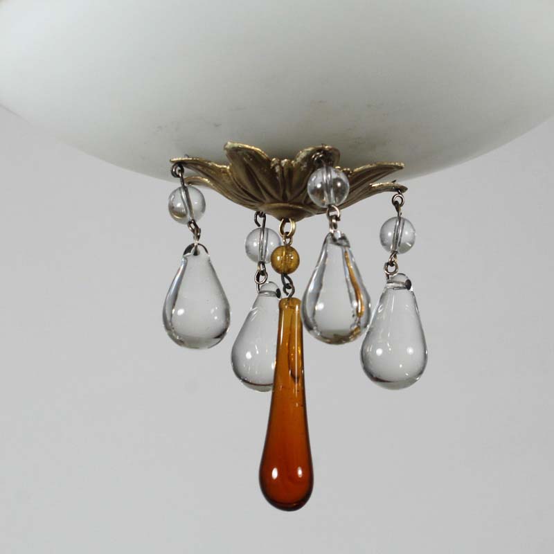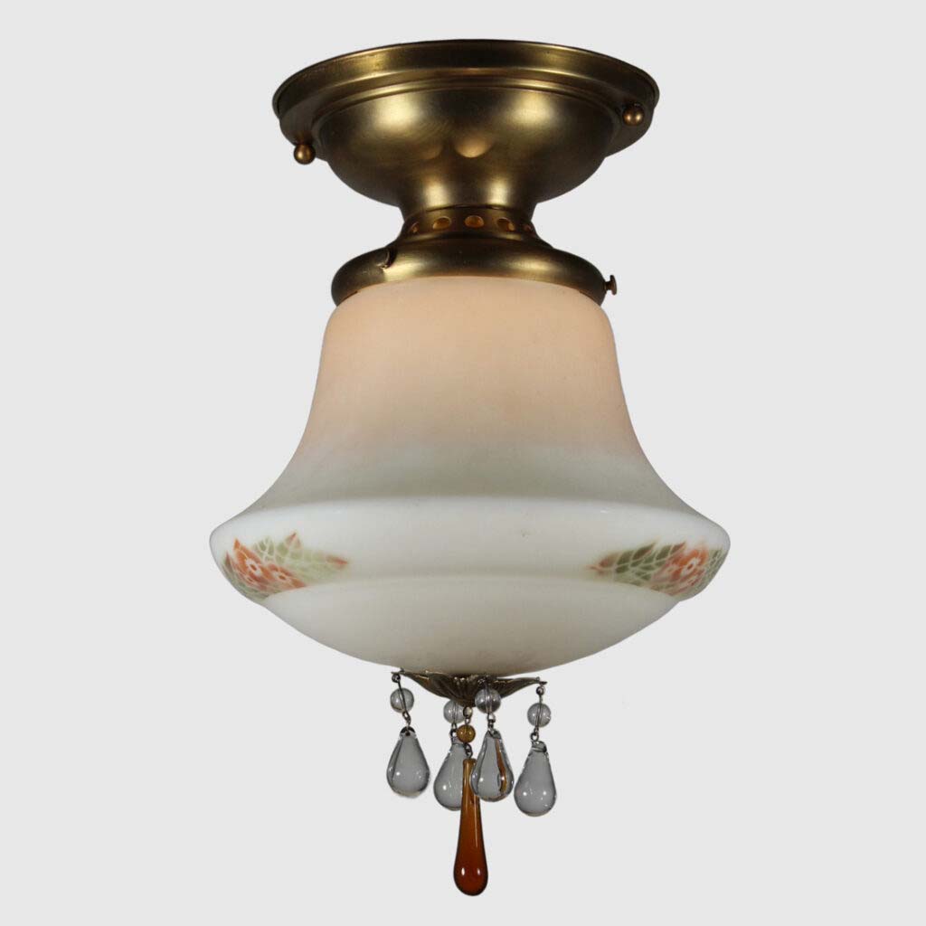 A charming antique flush mount light, c. 1920, featuring its original hand painted shade. The fixture features a sleek brass canopy that supports a beautiful peach and white glass shade; the shade is adorned with hand painted floral accents around the perimeter of the body. The flush mount finishes with a cluster of petite prisms below. This light fixture is in excellent condition; the glass shade is in very good condition without any cracks or chips to the glass, just the expected fleabites around the rim. It has been professionally rewired and comes with all necessary attachments for modern installation. The flush mount measures 9″ wide and 12-3/4″ tall.