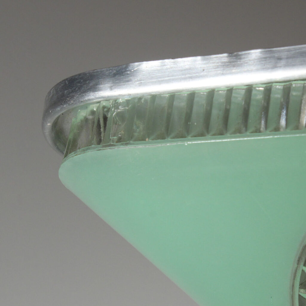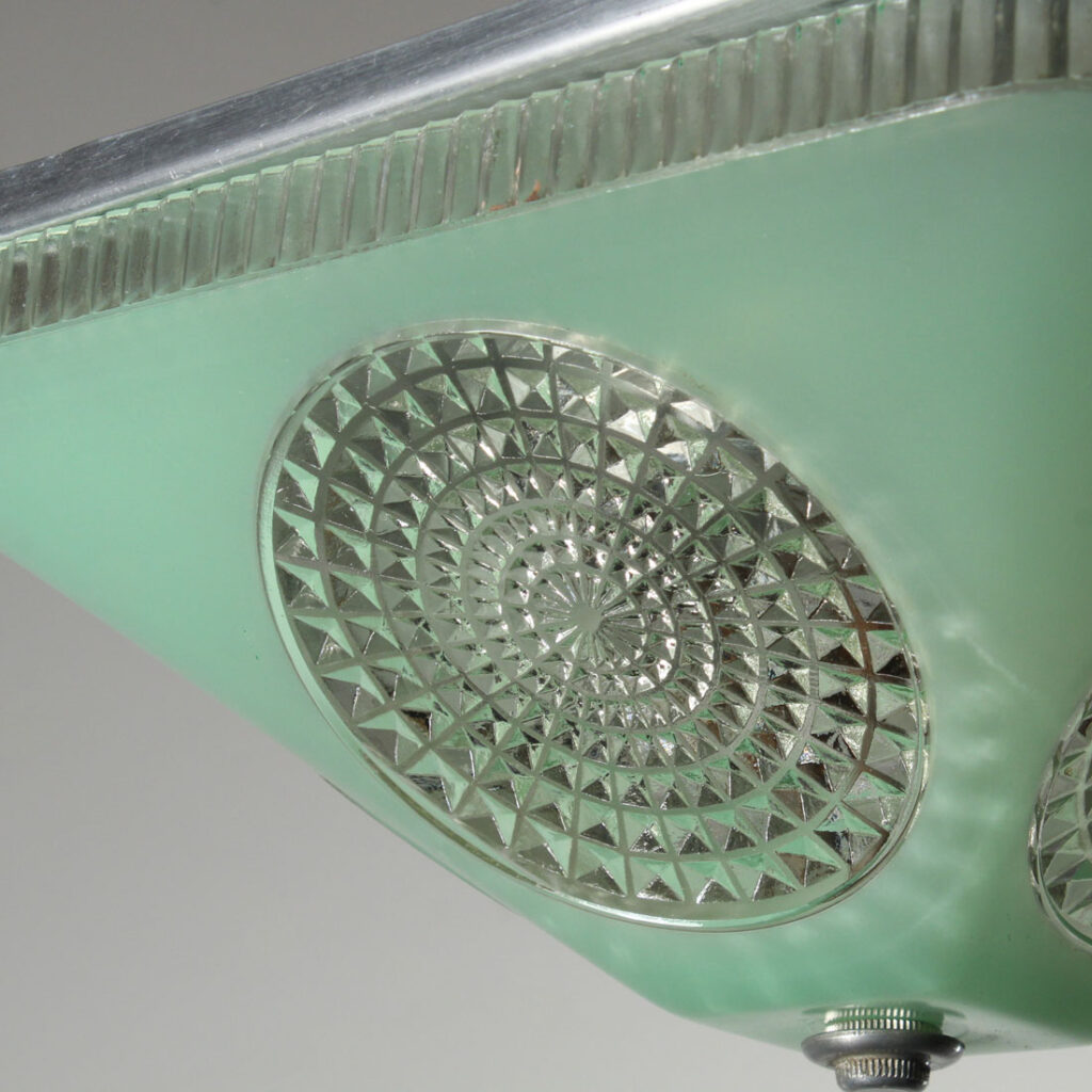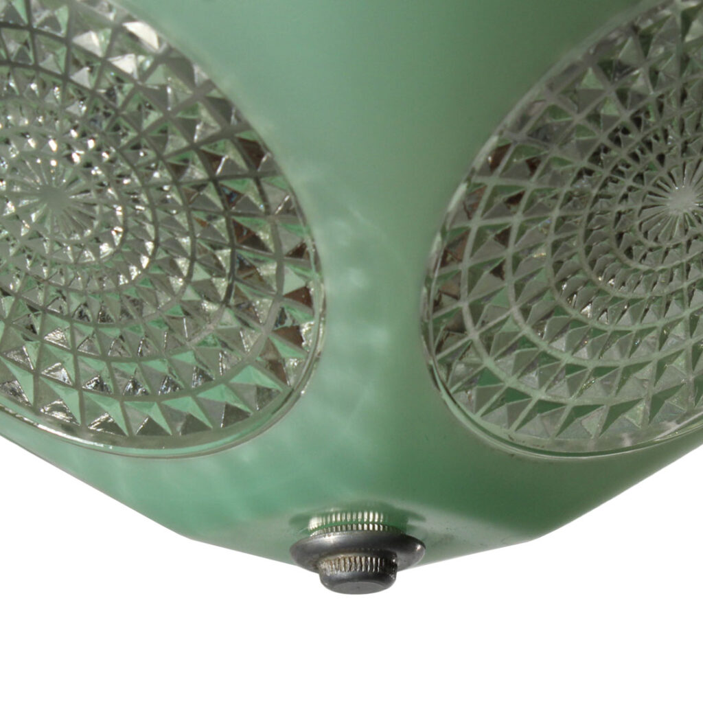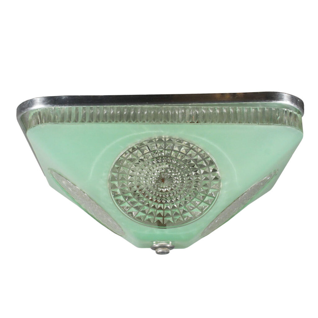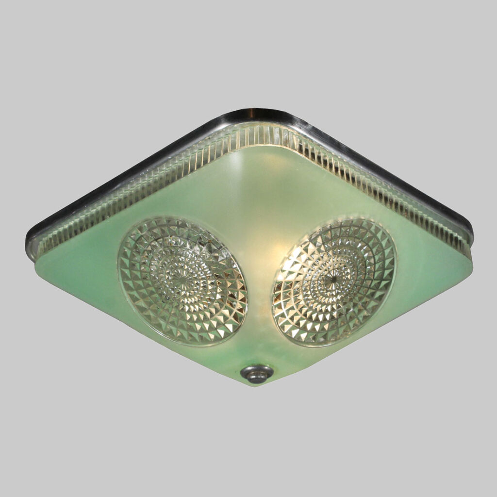 A fantastic antique flush light, salvaged out of a home in Tennessee. The two-light features an unusual opaque and textured shade with clear prismatic accents, and has a soft green hue. This light fixture is in very good antique condition; it has been professionally rewired and comes with all the necessary attachments for modern installation. The glass is also in good condition, with a small crack in one of the corners (pictured). The chandelier measures 11″ wide square, 14-1/4” wide diagonally, and is 5-1/2” tall.