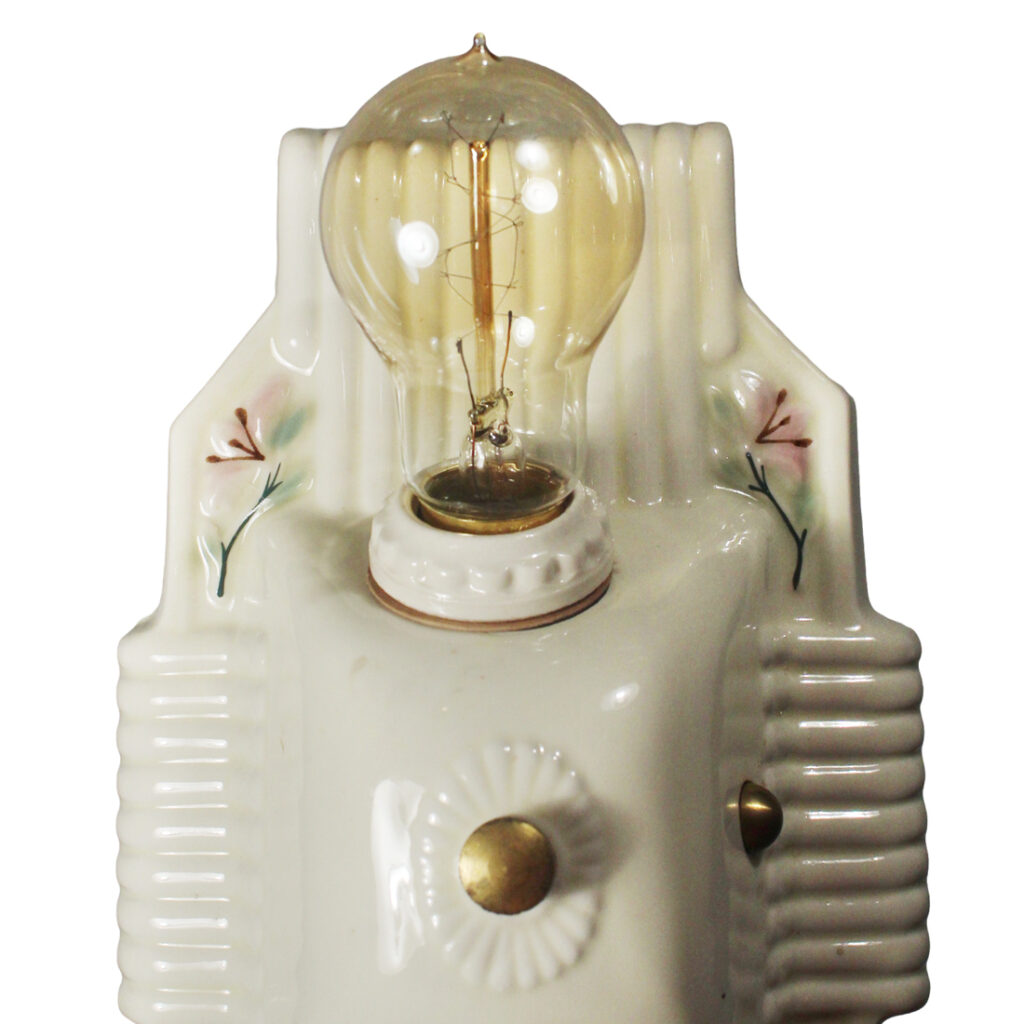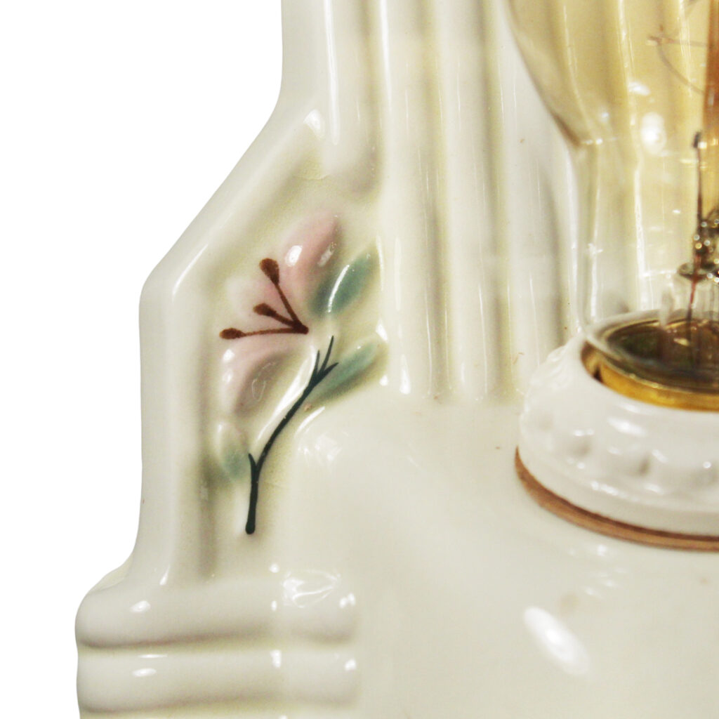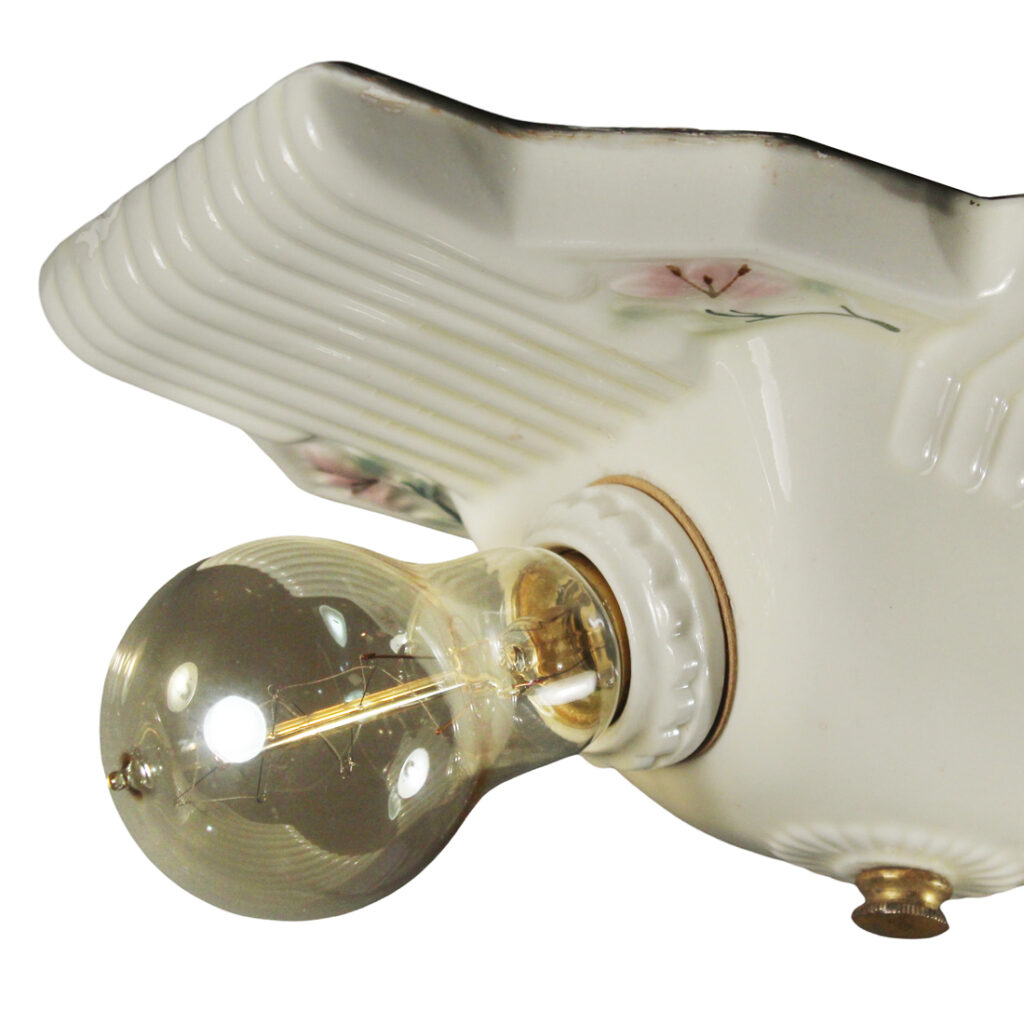 A lovely antique two-light porcelain flush mount, dating from the 1920’s and found in a home in Nashville, TN. The flush mount features a white ceiling-plate with ribbed detailing; painted floral motifs ornament the surface of the light and flank the fixture’s exposed bulbs. This ceiling-mount light fixture is in very good antique condition with a nicely aged patina; it has been professionally rewired and comes with all the necessary attachments for modern installation. The light fixture measures 6-3/8″ wide, 10-7/8″ long, and is 3″ tall (does not include the bulbs). Similar fixtures can be found under product code NC5344-RW.