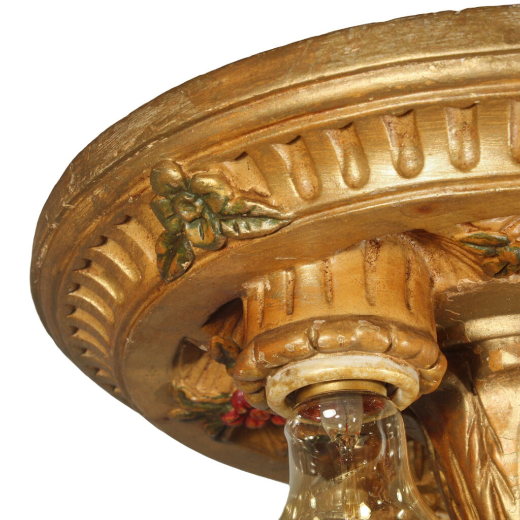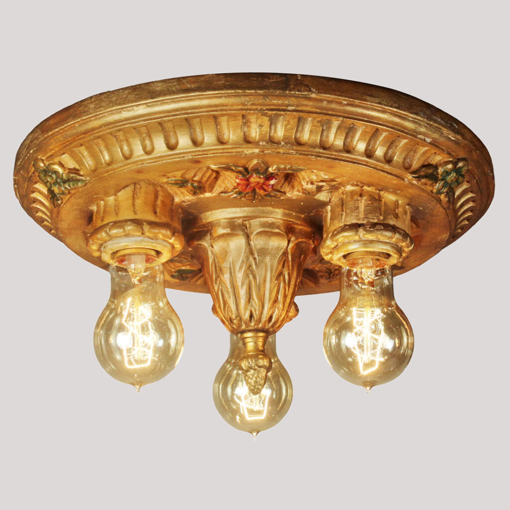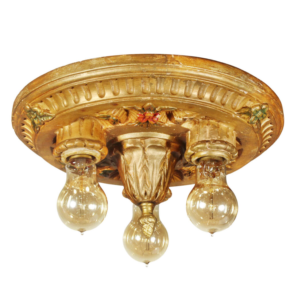 A gorgeous antique plaster flush mount fixture with exposed bulbs, dating from the early 1900’s. The flush mount is in great antique condition with its original gold-paint and polychrome finish (as pictured), and has been professionally rewired with all the necessary attachments for modern installation. The fixture measures 12″ wide by 6-1/2″ tall (does not include bulb).