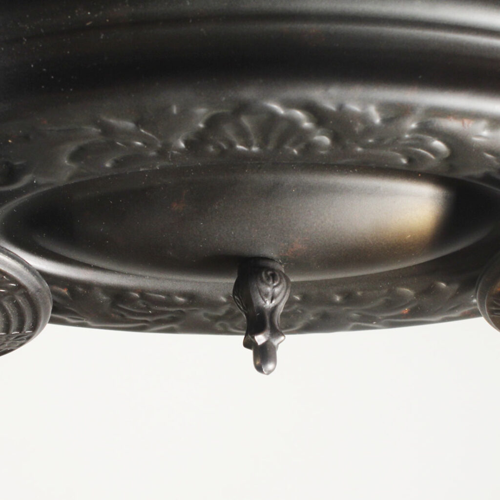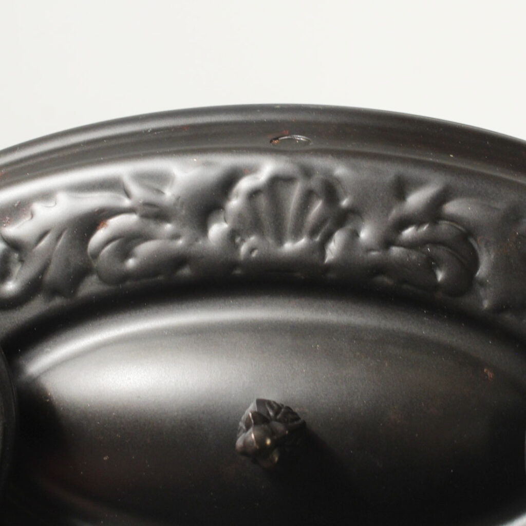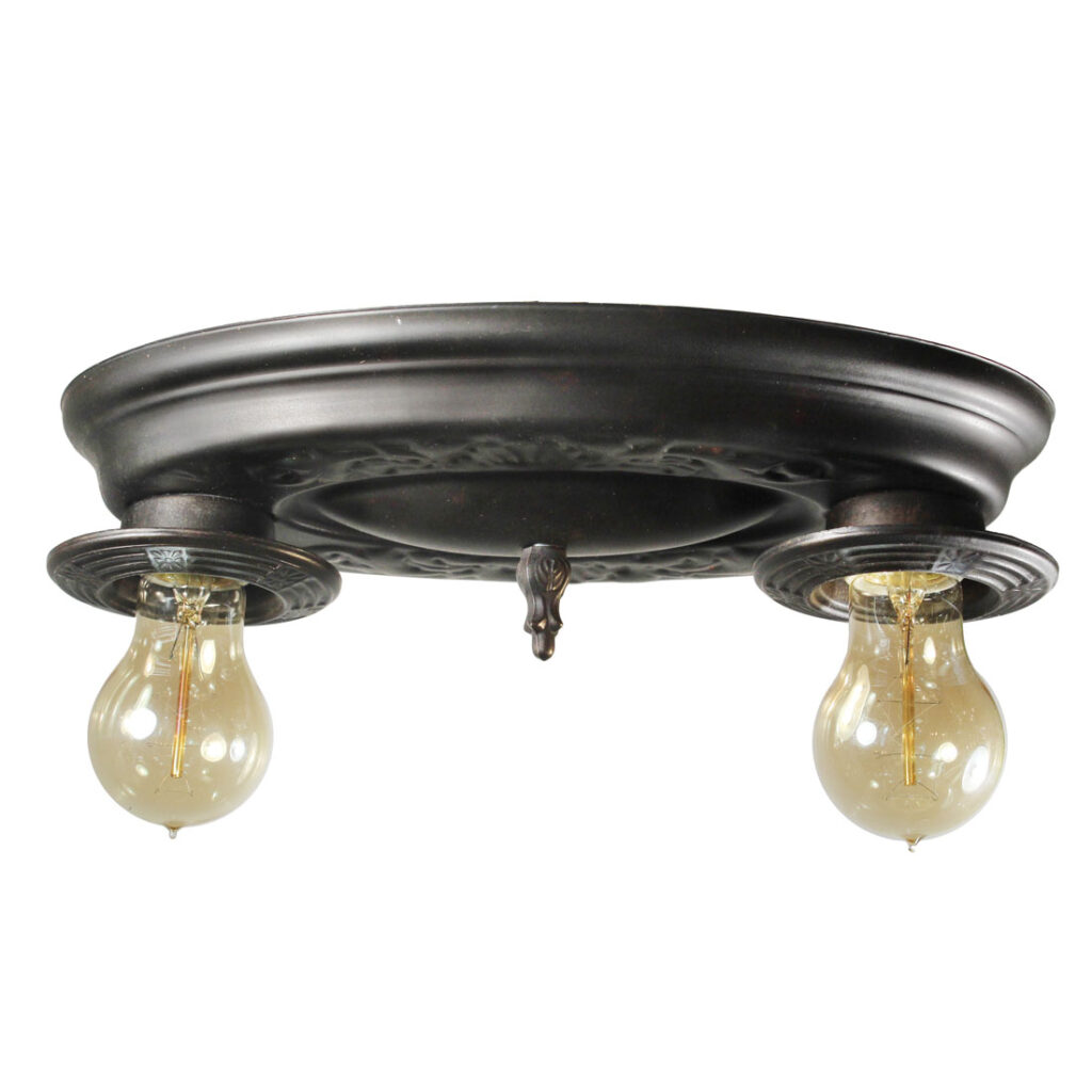 A lovely antique Neoclassical two-light flush mount fixture, dating from the early 1900’s. This flush mount is in excellent condition, and has been professionally rewired with all the necessary attachments for modern installation. The fixture measures 12″ long, 7″ wide, and 3-1/8″ tall (does not include bulbs).