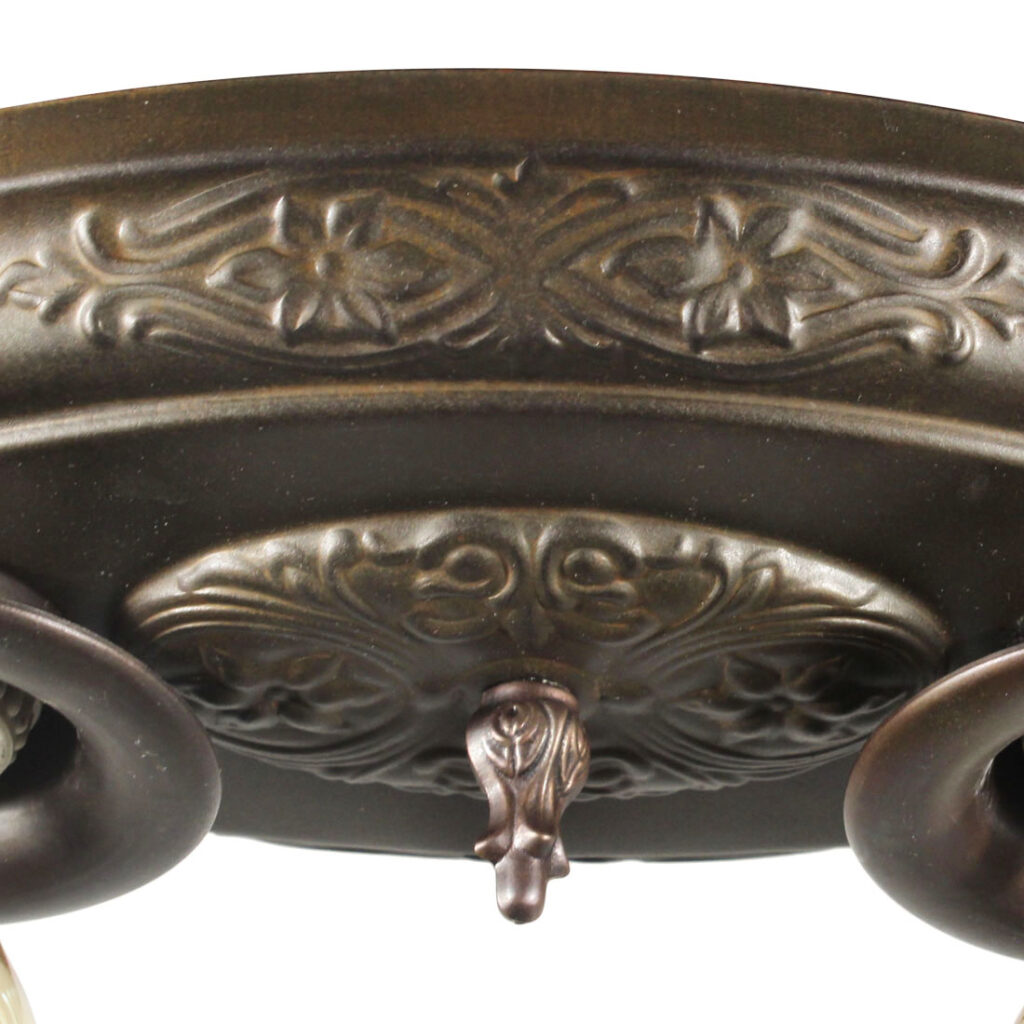 A lovely antique two-light flush mount fixture with exposed bulbs, dating from the early 1900’s and found in a home in Indianapolis, IN. The fixture’s oval canopy has a Neoclassical design composed of stylized foliates; two sleek downward facing bobeches flank a petite coordinating finial at its center. The flush mount is in excellent antique condition; it’s been professionally rewired and comes with all necessary attachments for modern installation. The fixture measures 11-3/4″ long, 6-3/4″ wide, and 3-1/2″ tall (not including bulbs).