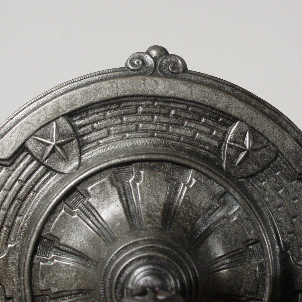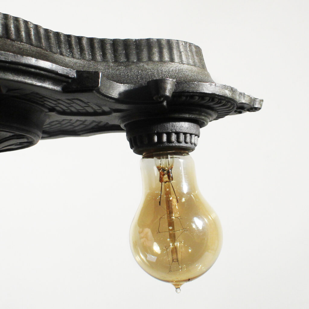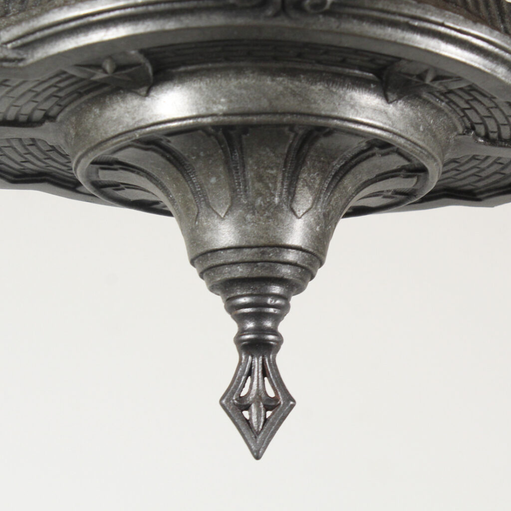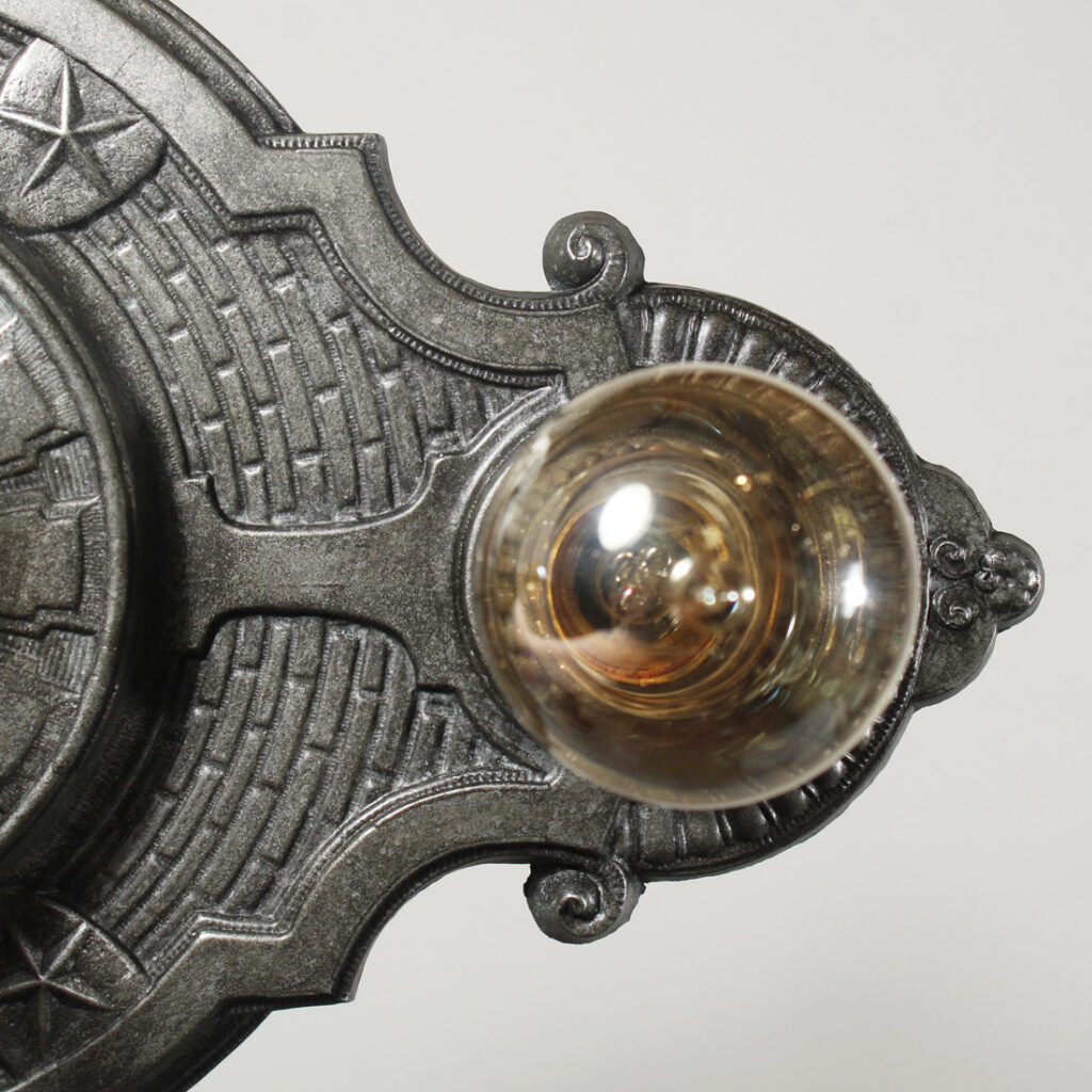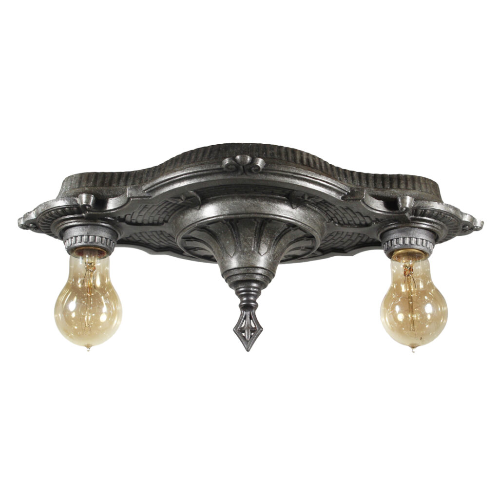 A lovely antique two-light flush mount fixture, dating from the early 1900’s. This flush mount features a playful star motif, and is in excellent antique condition with a beautiful darkened finish. It has been professionally rewired with all the necessary attachments for modern installation. The fixture measures 15-3/4″ long, 9″ wide, and 6-3/4″ tall (does not include bulbs).