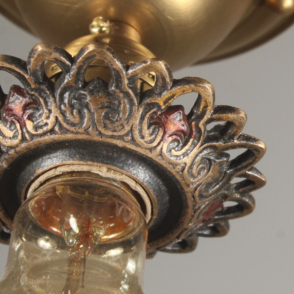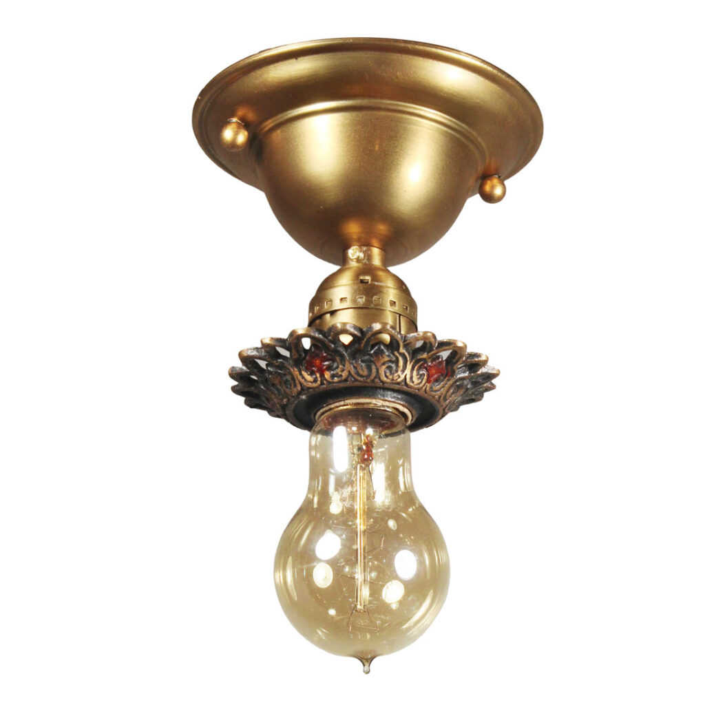 Splendid matching antique flush mount fixtures with exposed bulbs and their original polychrome finish, dating from the early 1920s and found in a home in Pennsylvania. Each fixture features brass canopy that supports a decorative bronze bobeche and exposed bulb below. Each light is in excellent antique condition with a fabulous aged finish; they have been professionally rewired and come with all necessary attachments for modern installation. Each light measures 4-5/8″ wide and 4-1/4″ tall without the bulb. THE PRICE LISTED IS FOR EACH FIXTURE.