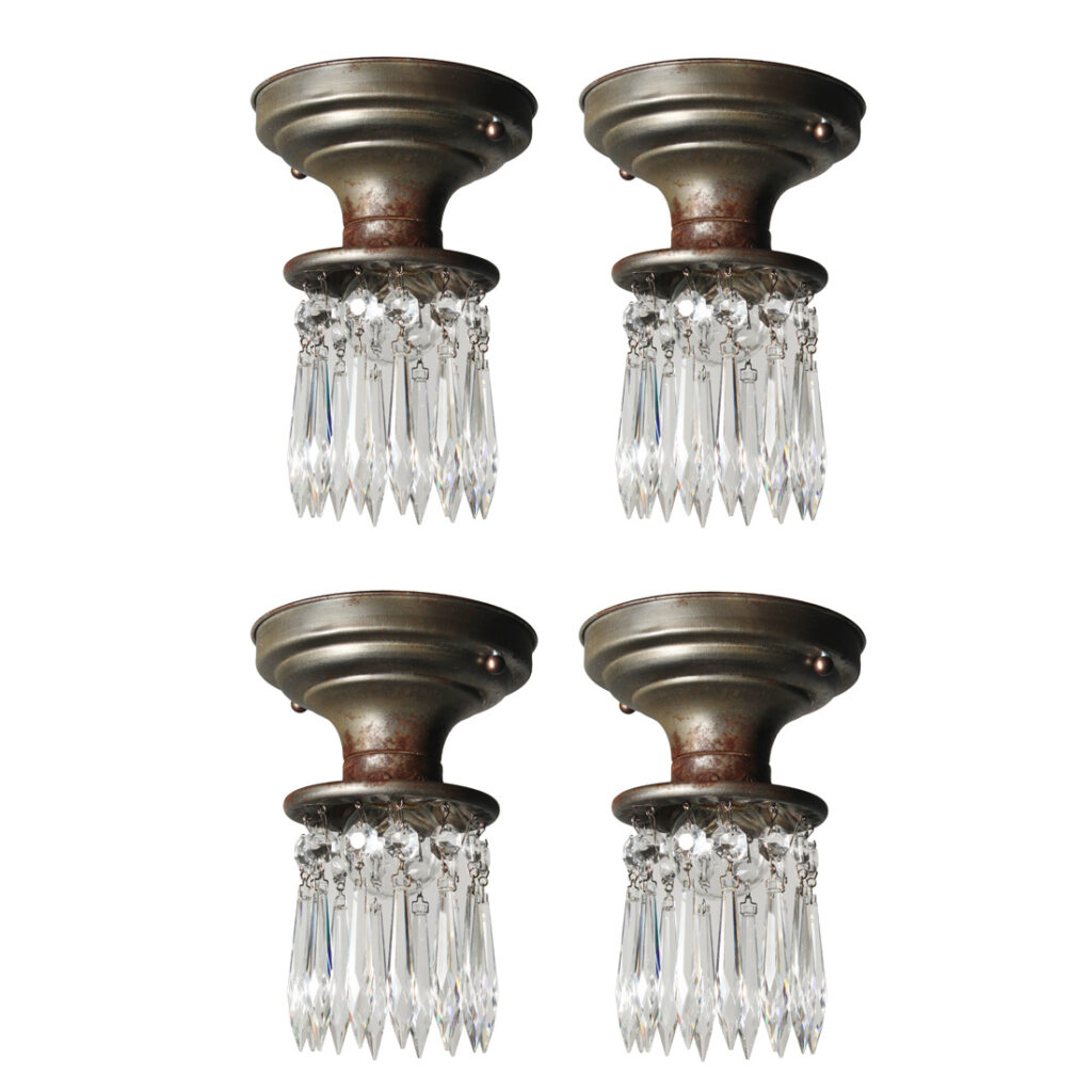 Marvelous matching antique flush mount fixtures with exposed bulbs and sparkling prisms, dating from the early 1920s and found in a home in Lexington, KY. Each brass fixture features a decorative bobeche hung with a curtain of sparkling icicle prisms. They are in excellent antique condition with a wonderful aged nickel finish and some age spots (pictured), and have been professionally rewired with all necessary attachments for modern installation. Each light measures 5-1/2″ wide and 8″ tall (does not include the bulb). THE PRICE LISTED IS FOR EACH FIXTURE.