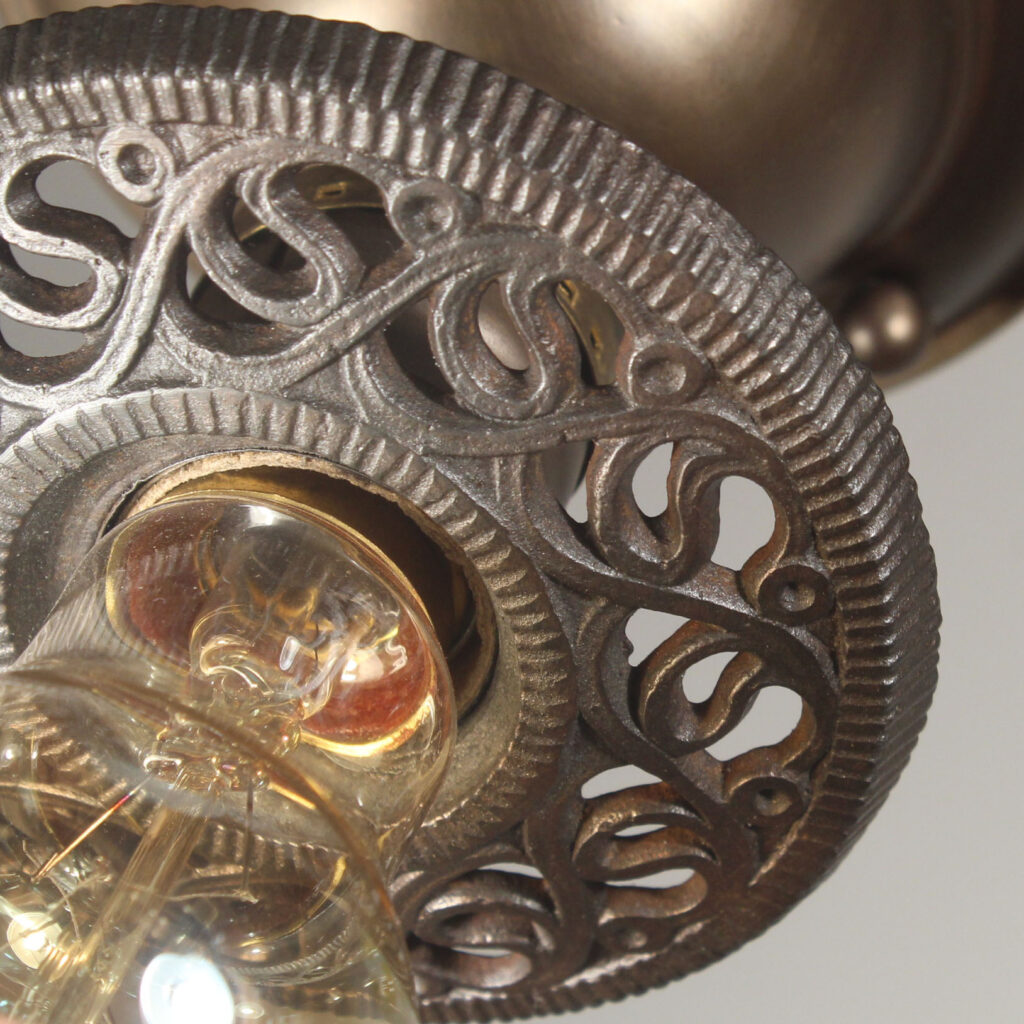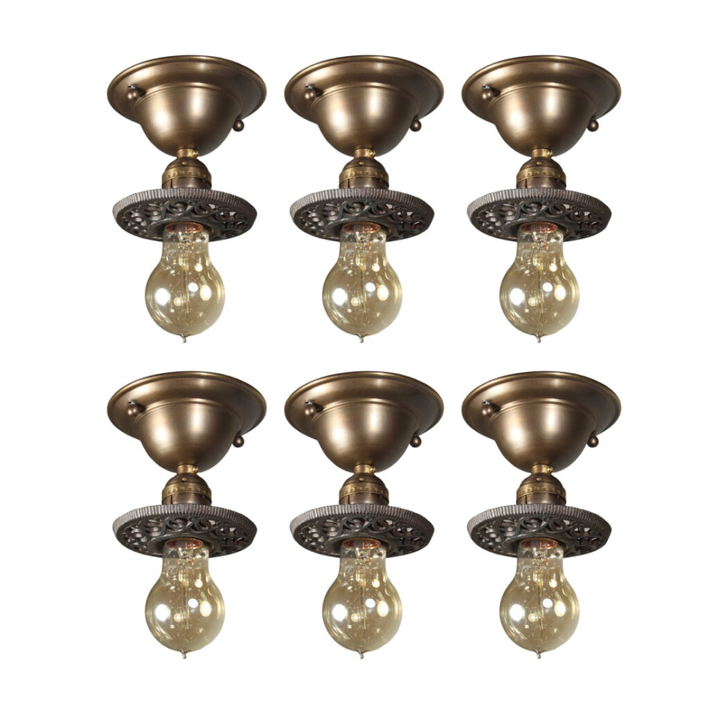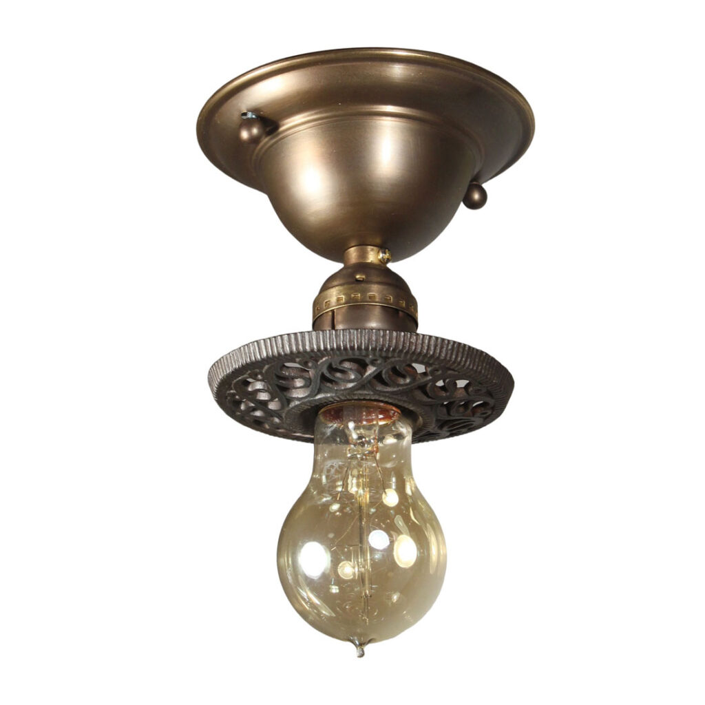 Gorgeous matching antique two-tone flush mount fixtures with exposed bulbs, dating from the early 1920s and found in a home in Indiana. Each brass fixture features a decorative cast iron bobeche embellished with scrolling volutes, and are each in excellent antique condition. They have been professionally rewired and come with all necessary attachments for modern installation. Each light measures 4-5/8″ wide and 4-1/2″ tall without the bulb. THE PRICE LISTED IS FOR EACH FIXTURE.