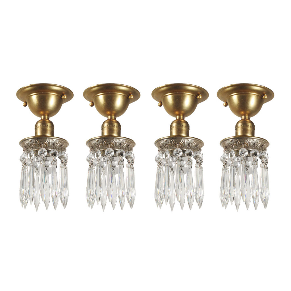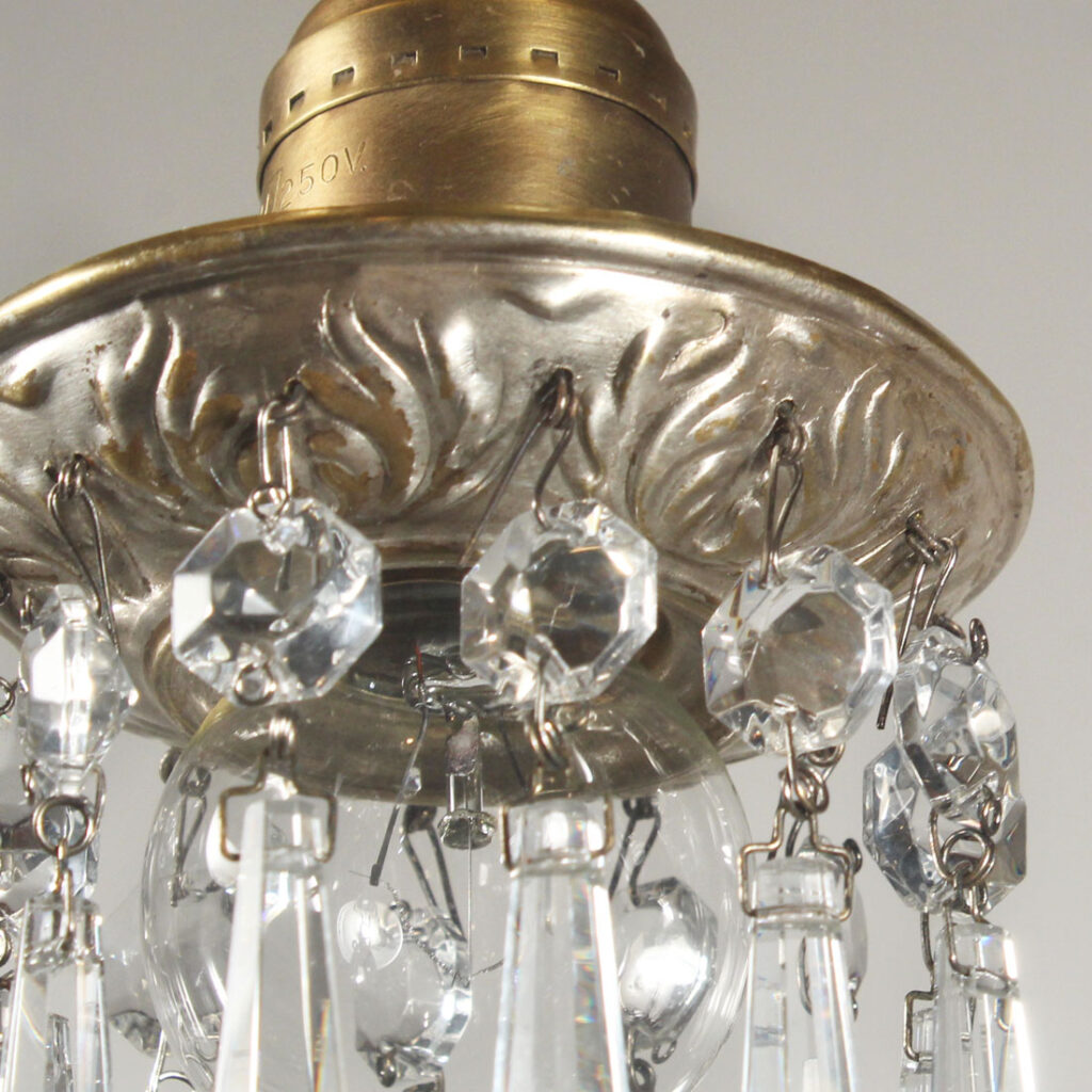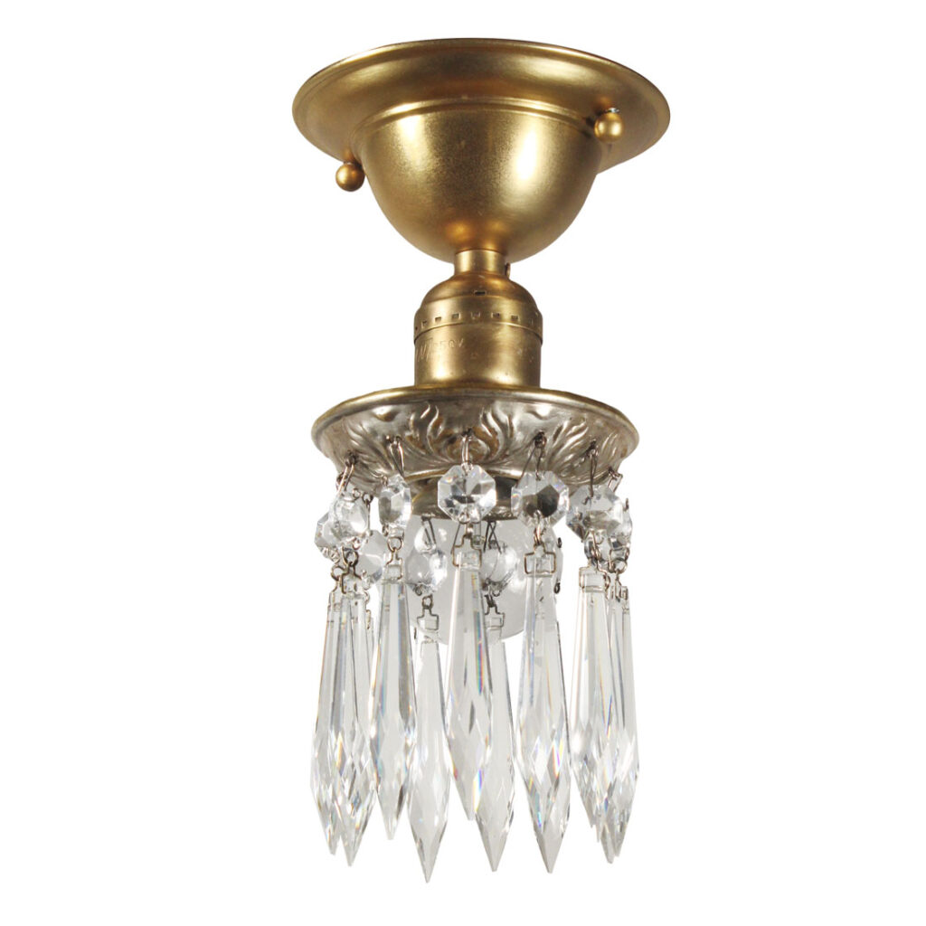 Darling matching antique brass and silver-plate flush mount fixtures with exposed bulbs and sparkling prisms, dating from the early 1920s and found in a home in Lexington, KY. Each fixture features a decorative bobeche hung with a curtain of icicle prisms. They are in excellent antique condition, and have been professionally rewired with all necessary attachments for modern installation. Each light measures 4-5/8″ wide and 9″ tall (does not include the bulb). THE PRICE LISTED IS FOR EACH FIXTURE.