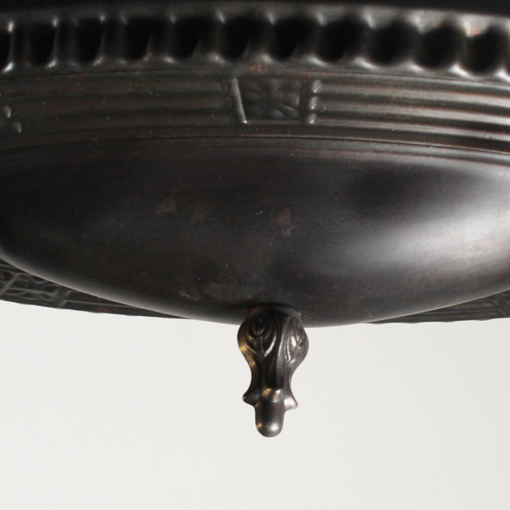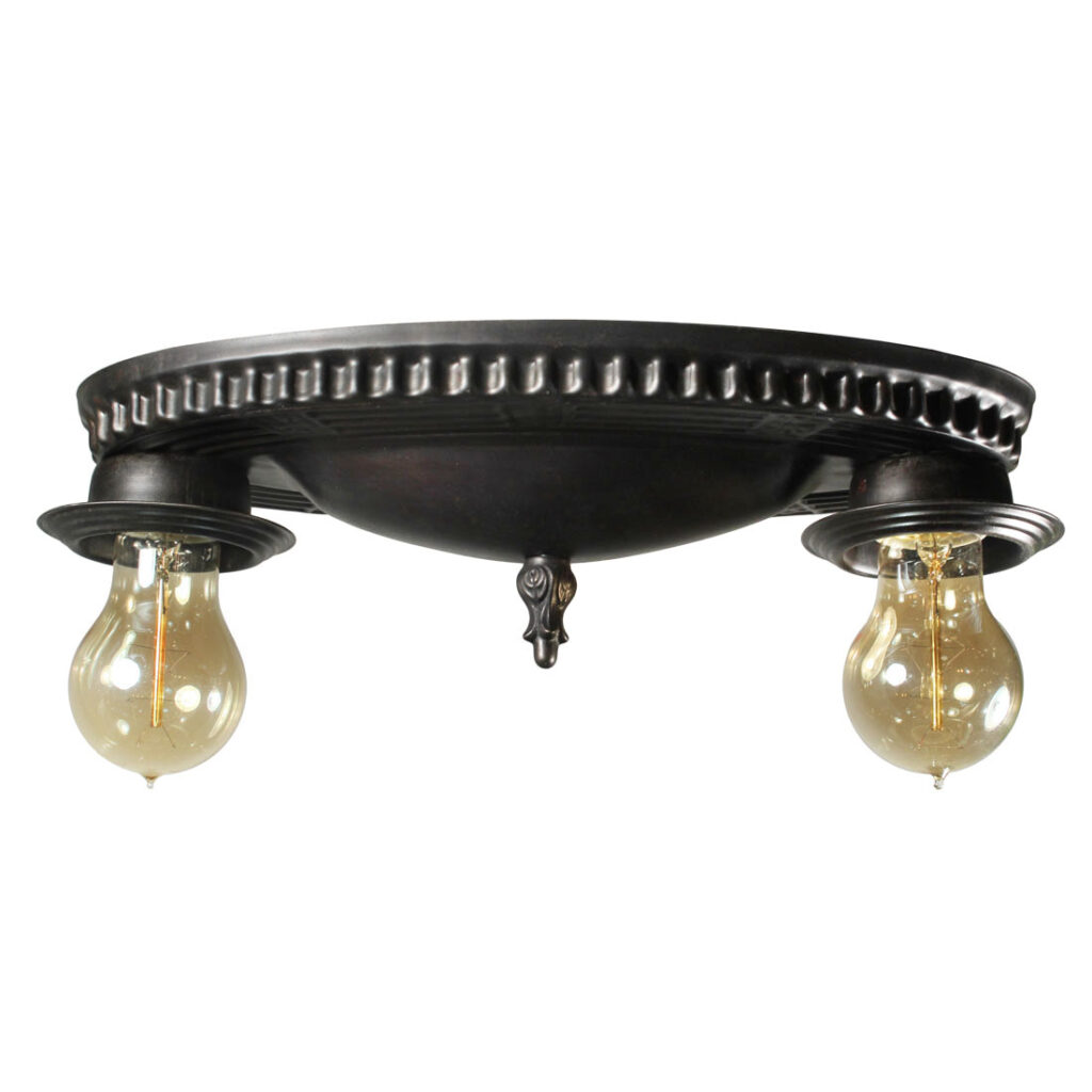 A fantastic antique Neoclassical two-light flush mount fixture, dating from the early 1900’s. This flush mount is in excellent condition, and has been professionally rewired with all the necessary attachments for modern installation. The fixture measures 12″ long, 6″ wide, and 3-1/2″ tall (does not include bulbs).