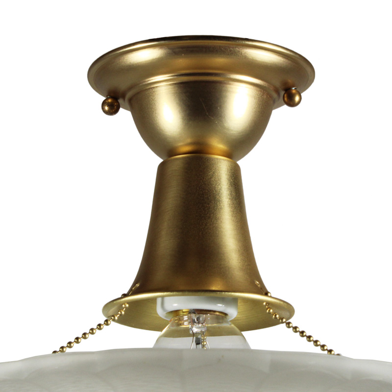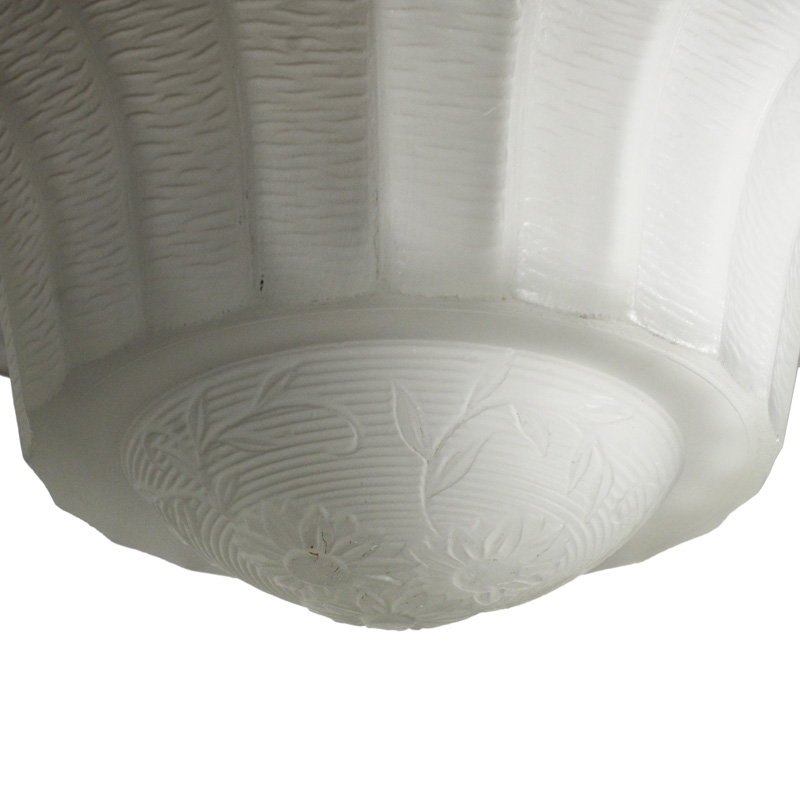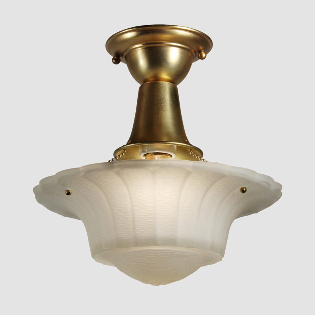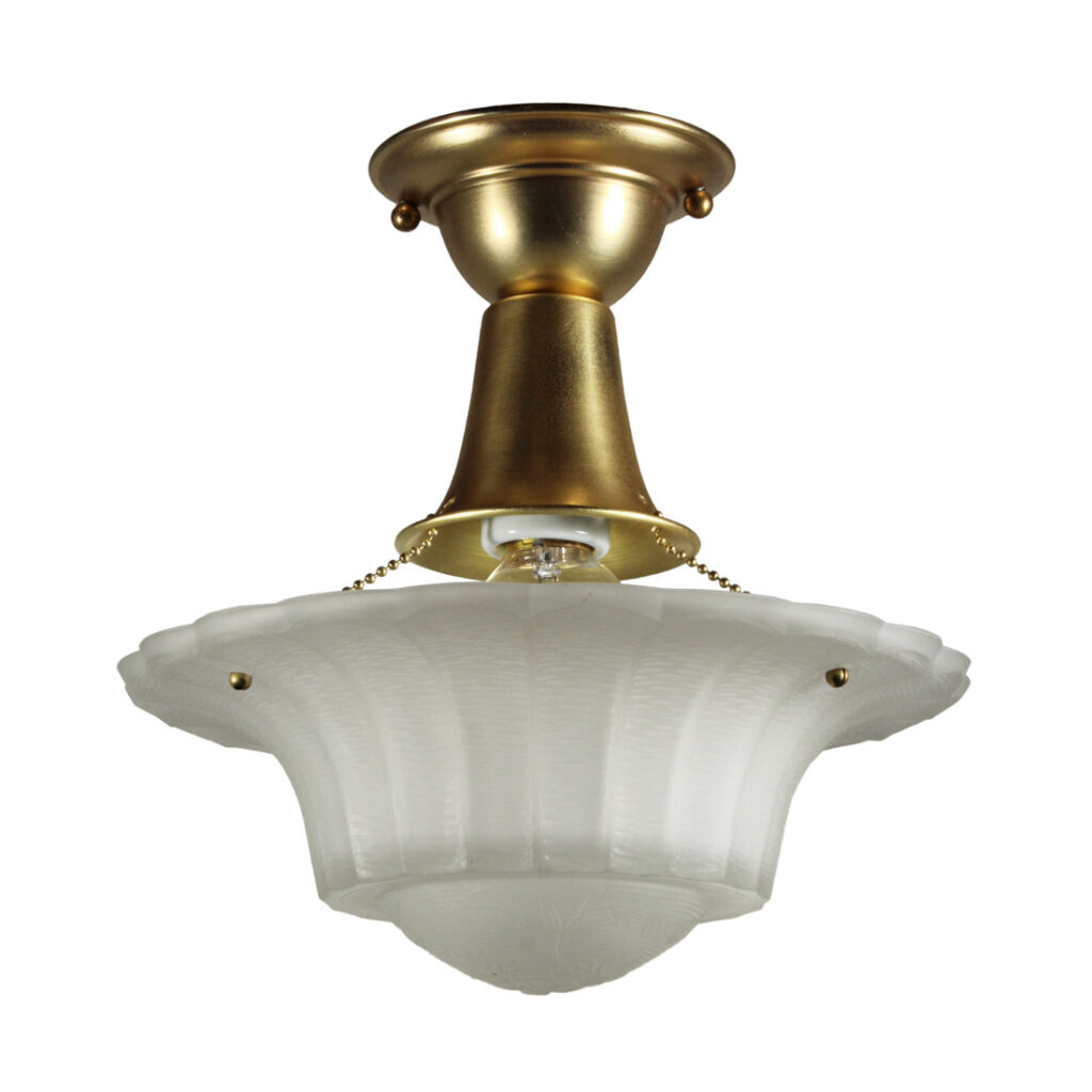 A beautiful vintage flush mount light fixture found in a home in Tennessee. This fixture has an understated brass fitter with ball chains that support a delightful glass shade below. The original shade features a radial textured design in frosted glass. This flush mount is in excellent condition with no cracks or breaks to the glass, just the expected fleabites. It has been professionally rewired and comes with all the necessary attachments for modern installation. This fixture measures 10″ wide by 10″ tall overall.