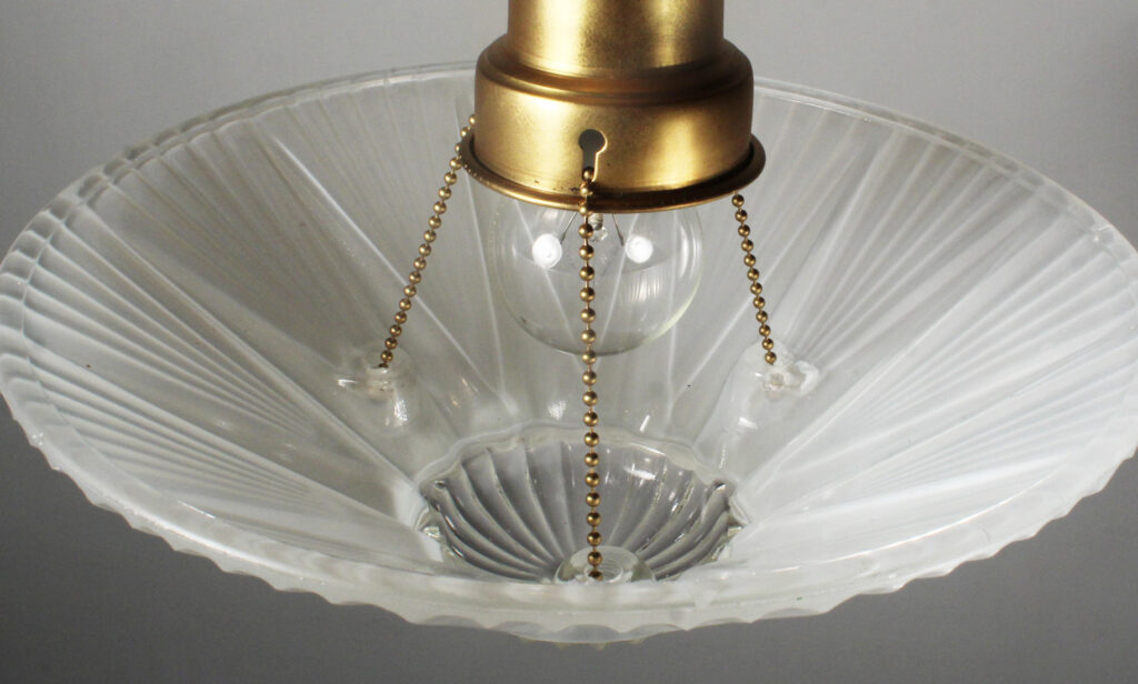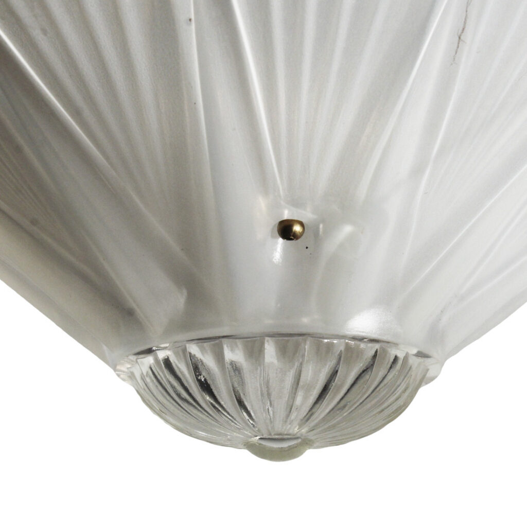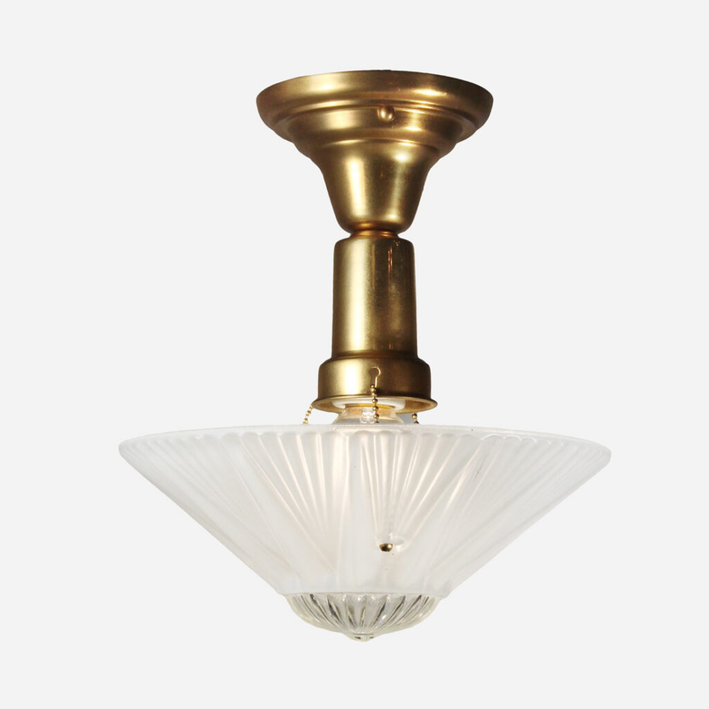 A lovely vintage flush mount light fixture found in a home in Nashville, TN. This fixture has an understated brass fitter, from which three ball chains descend to support a delightful glass shade below. The original shade features a radial fluted design in frosted glass. This flush mount is in excellent condition with no cracks or breaks to the glass, just the expected fleabites. It has been professionally rewired and comes with all the necessary attachments for modern installation. This fixture measures 10-1/2″ wide by 12″ tall overall.